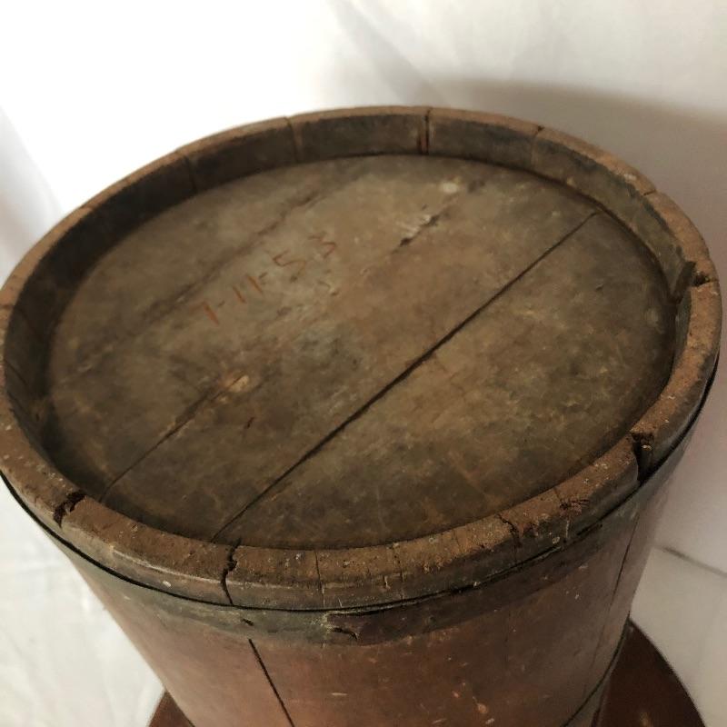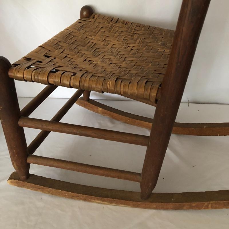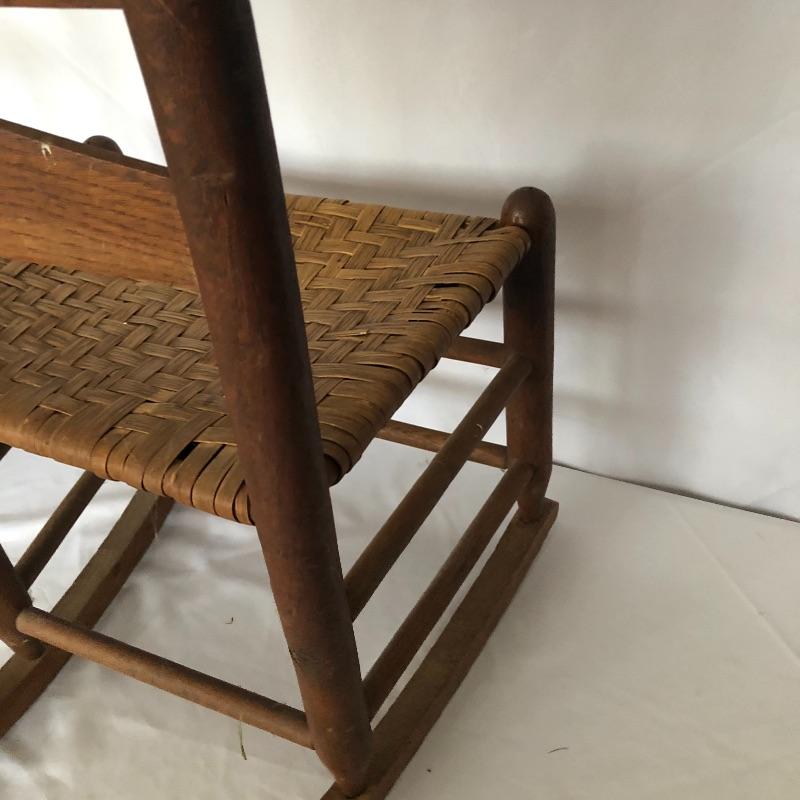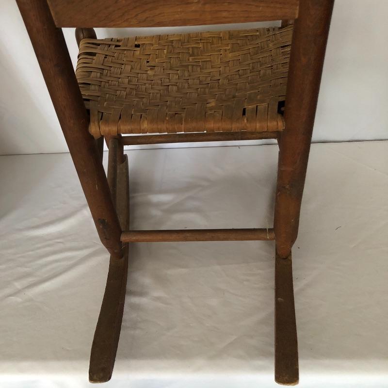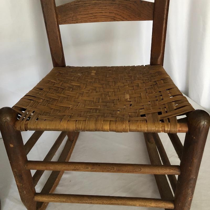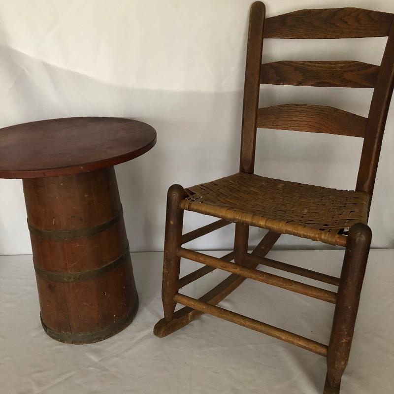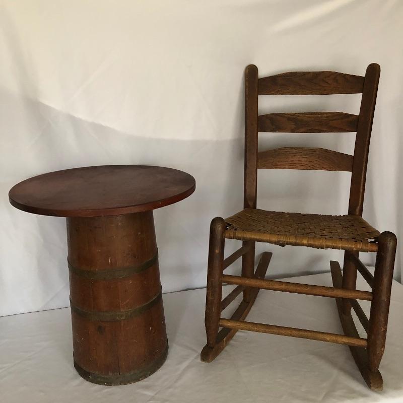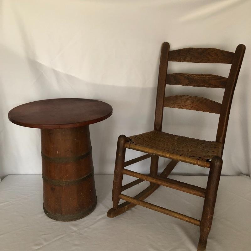 The sturdy rocker appears to be made of oak and is in good shape. It measures approximately 32” tall with the seat about 15” high and 13.5” deep. The butter churn table is 20” tall and approximately 18.5” in diameter. The butter churn has four metal rings encapsulating it and has the date July 11, 53 on the bottom. It is assumed that it was crafted on that date. Local pick up only.