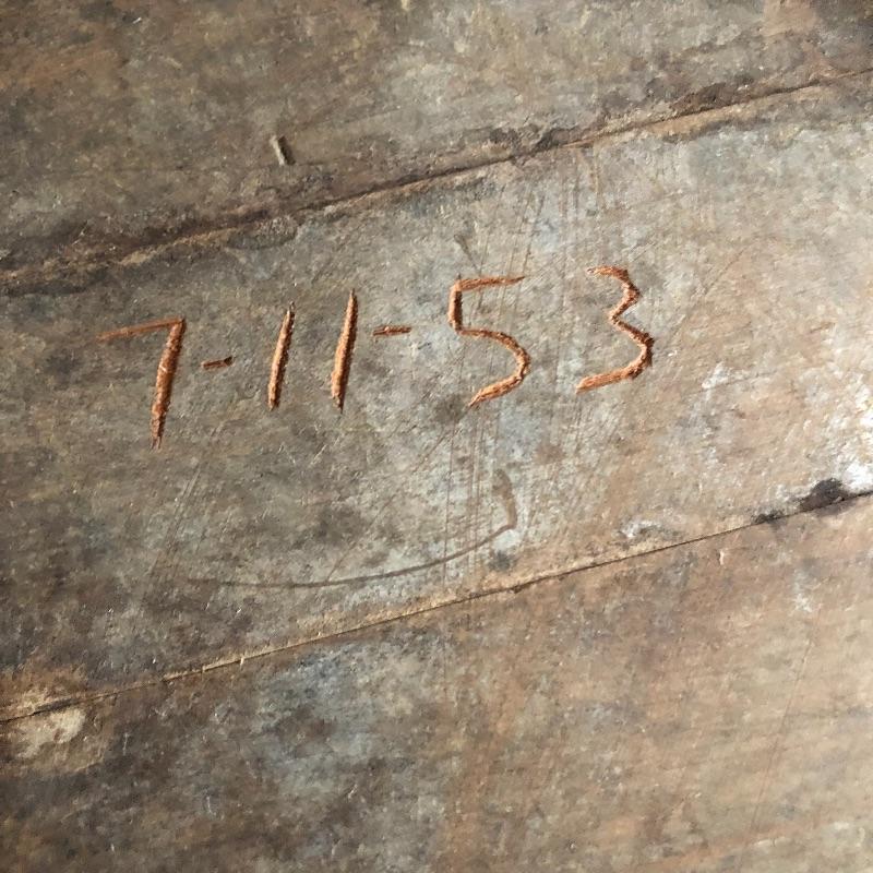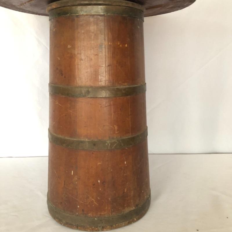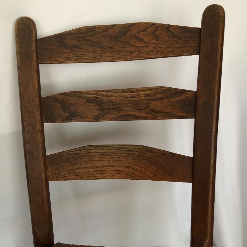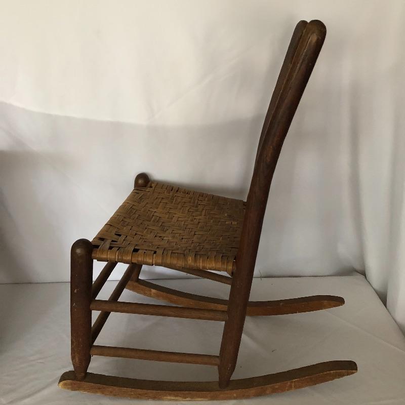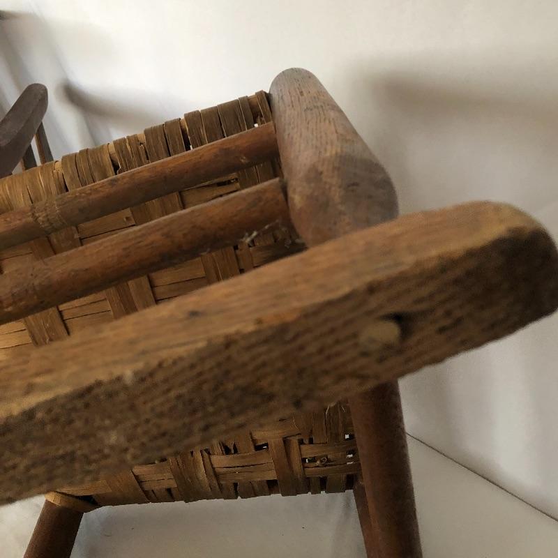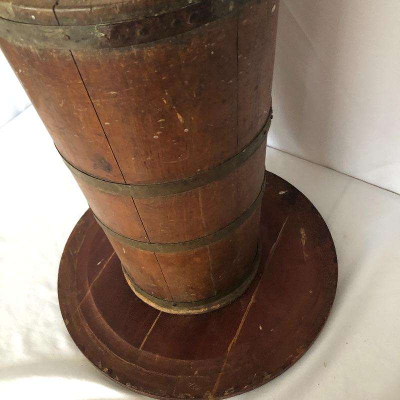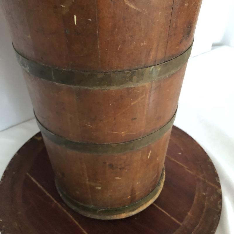 The sturdy rocker appears to be made of oak and is in good shape. It measures approximately 32” tall with the seat about 15” high and 13.5” deep. The butter churn table is 20” tall and approximately 18.5” in diameter. The butter churn has four metal rings encapsulating it and has the date July 11, 53 on the bottom. It is assumed that it was crafted on that date. Local pick up only.