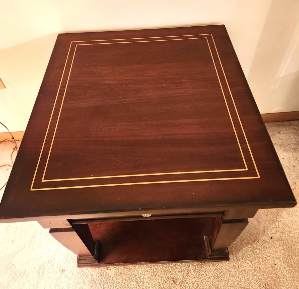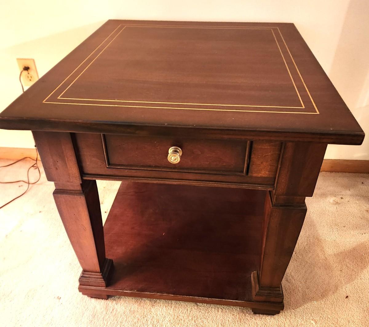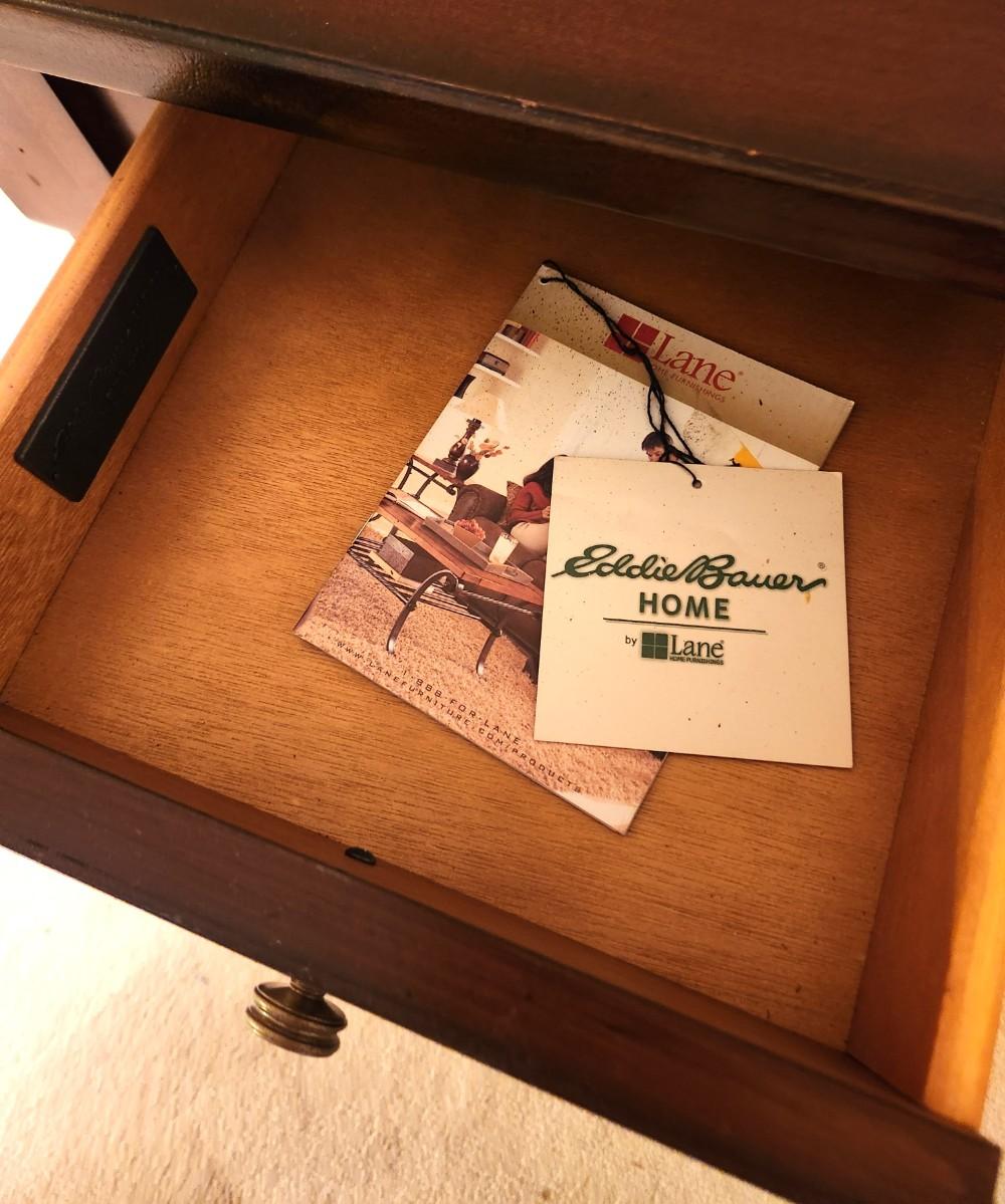Nice Eddie Bauer Home End/Lamp table with drawer. Gently used condition. 25" across, 28" deep, 25" tall. Marches the coffee table in Lot #63.