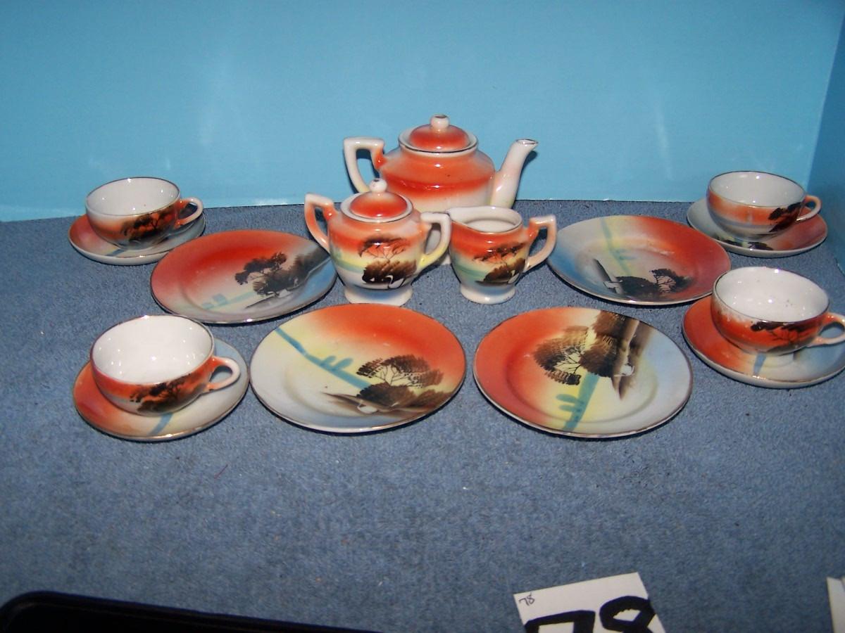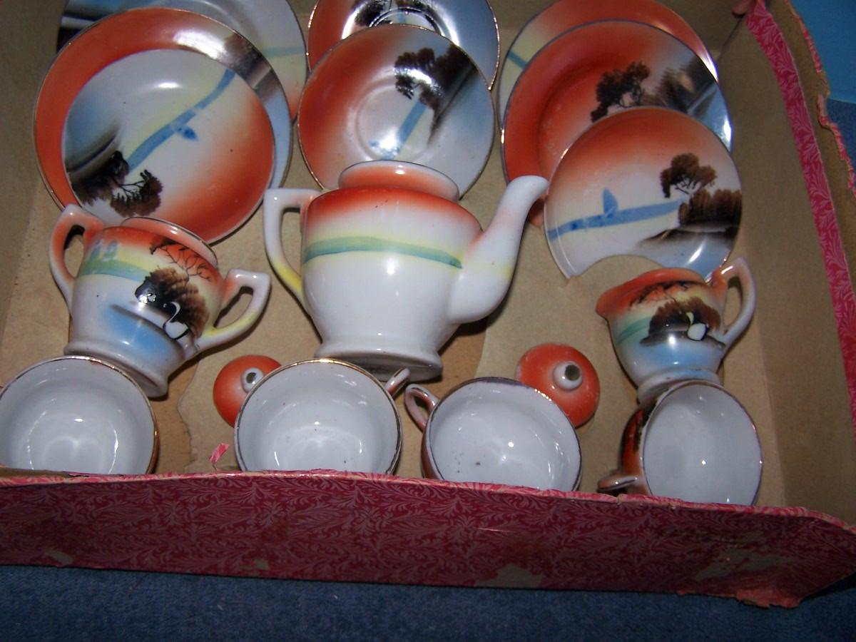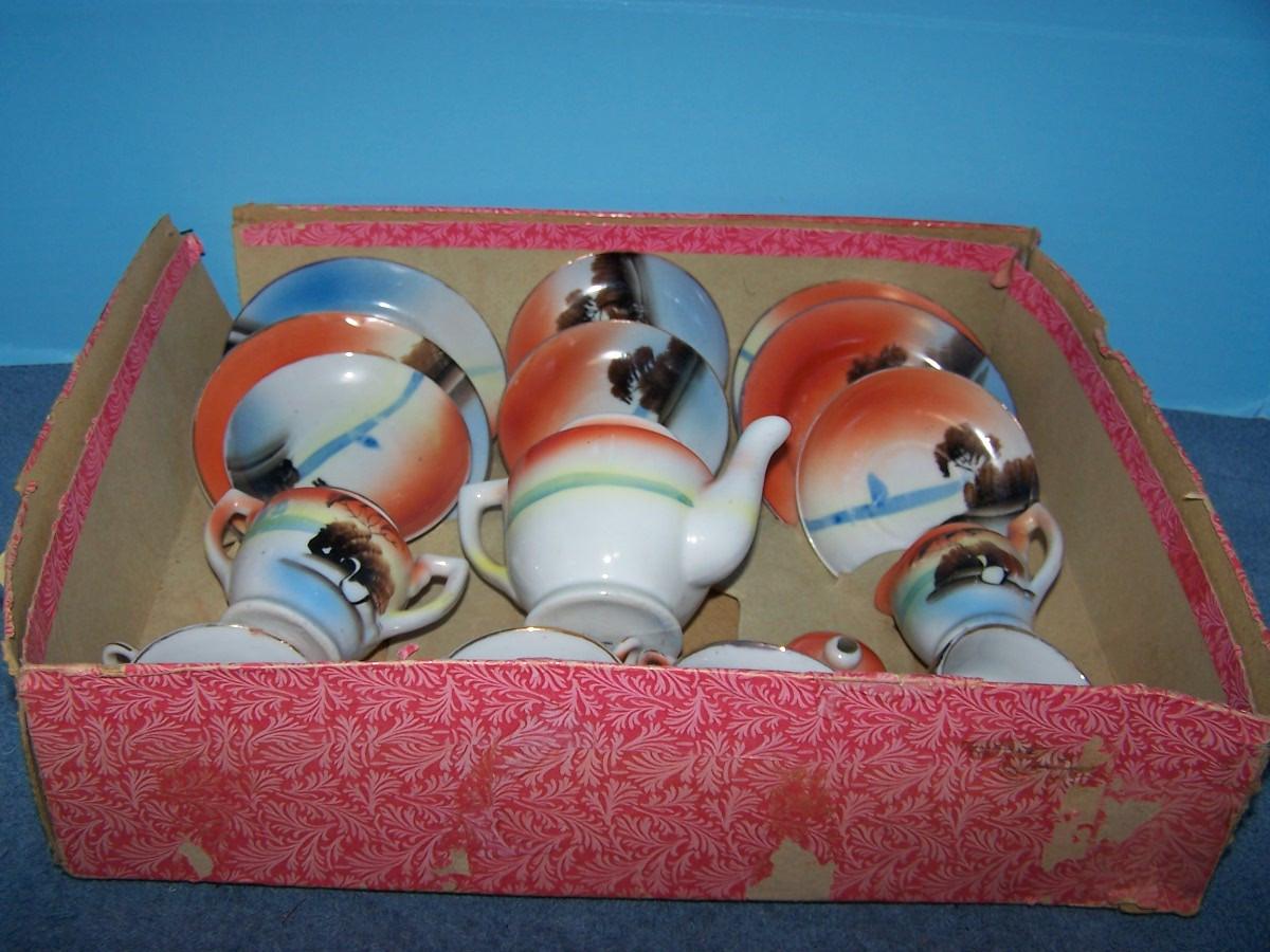 THIS IS A FABULOUS VINTAGE GOLD CASTLE JAPAN CHILD'S TEA SET!!! TEA SET HAS LIGHT WEAR... BOX IS IN POOR CONDITION..