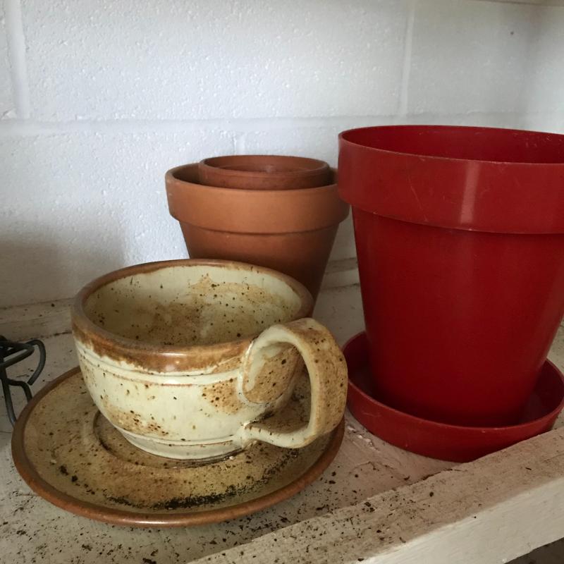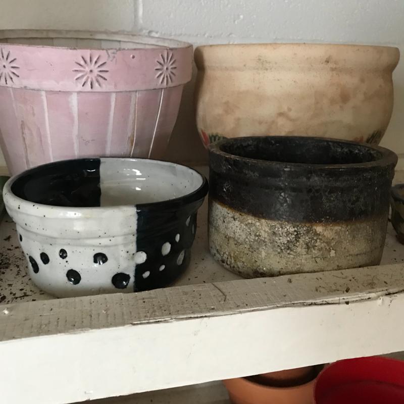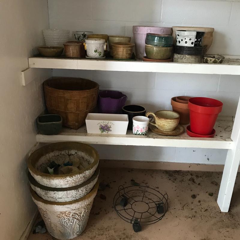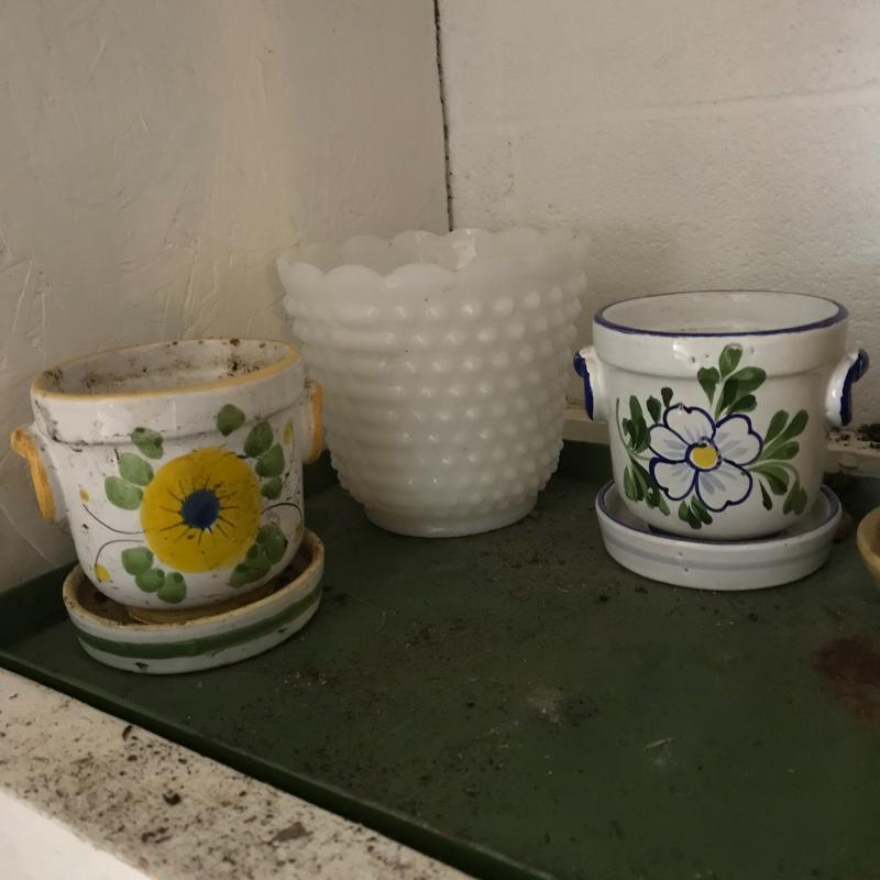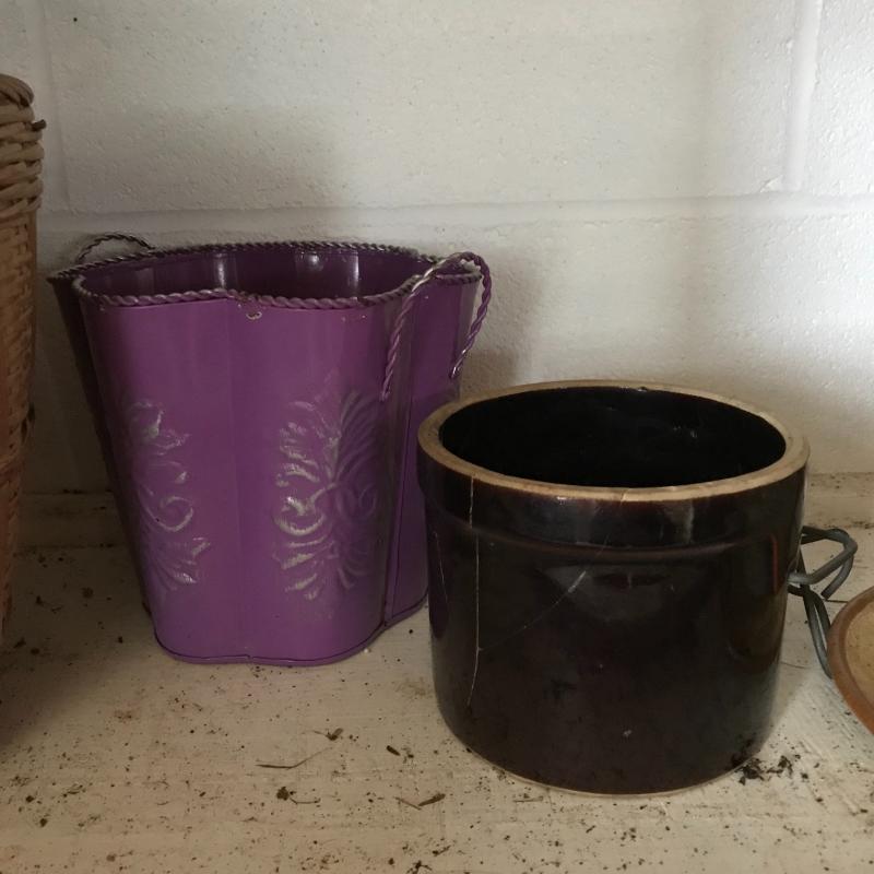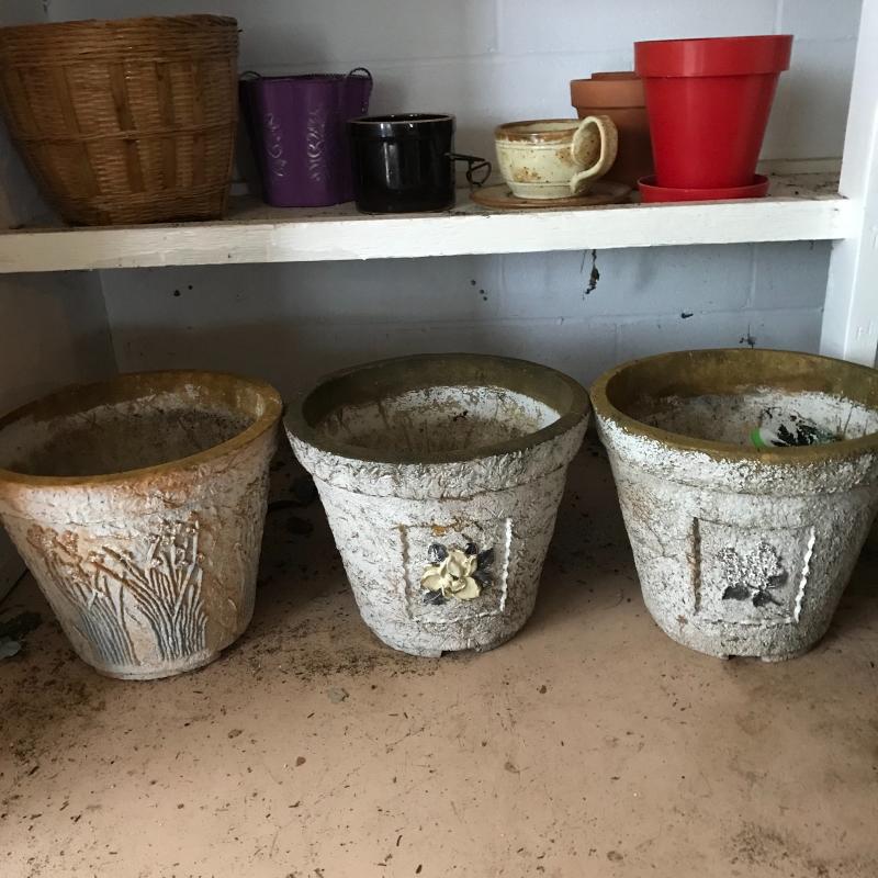 Large collection for your potting needs. Lot includes a large selection of small pottery previously used for plants. Other pots are various material including metal, clay, and plastic. The three large matching pots are a lightweight material and the tallest at 10.5” tall. Some small river rocks complete the set. See photos for all inventory. No shipping.