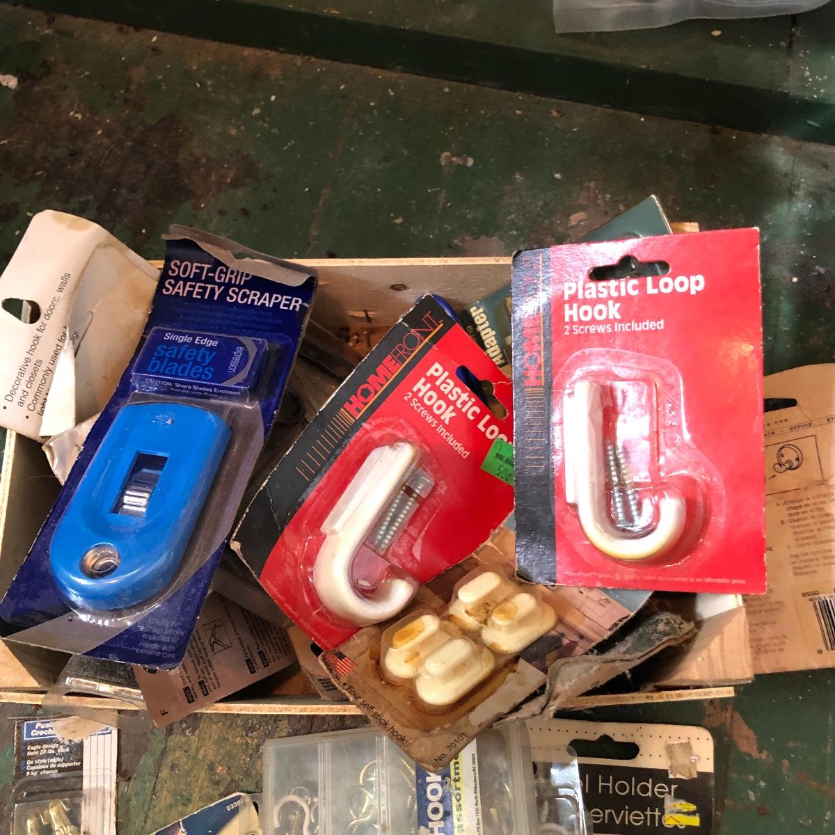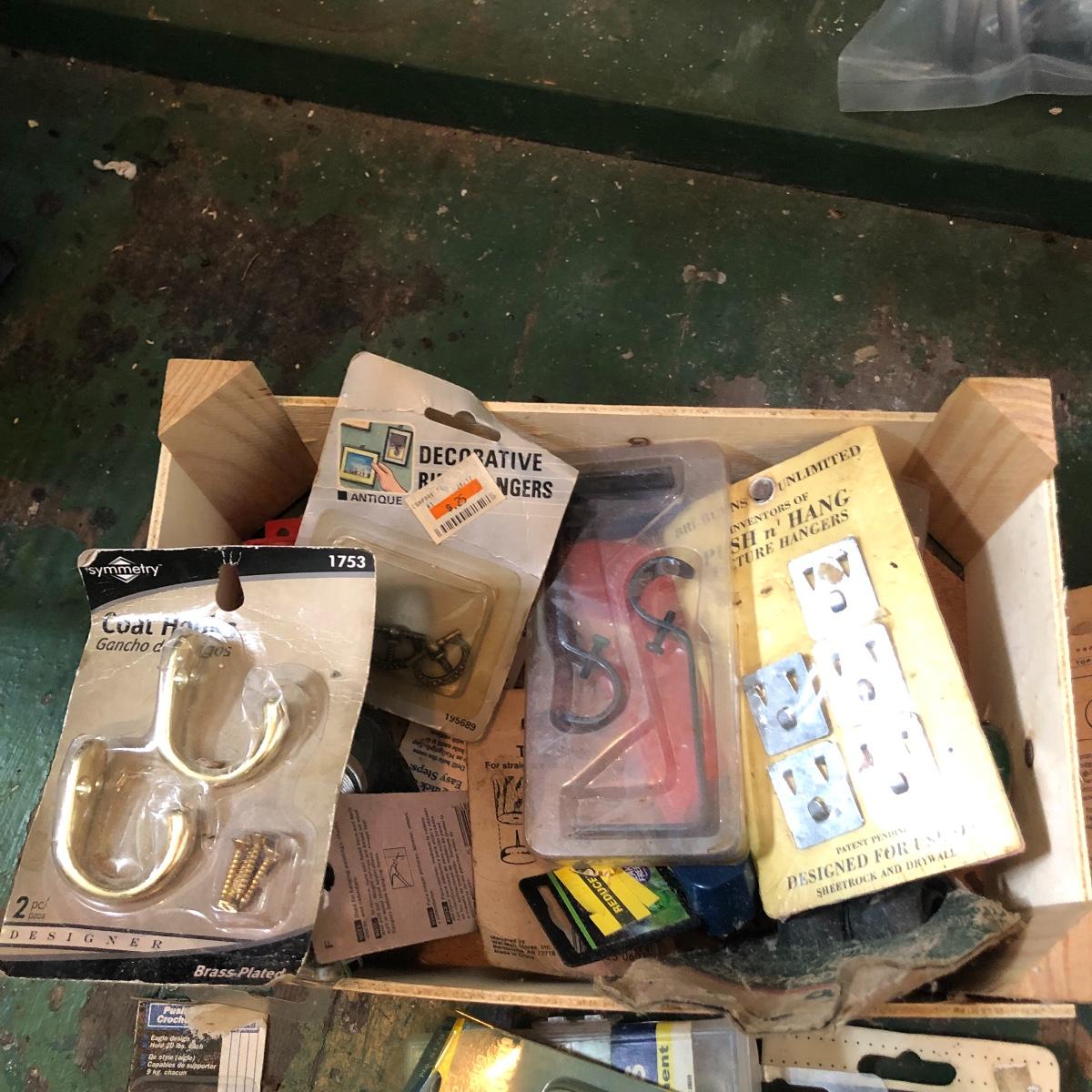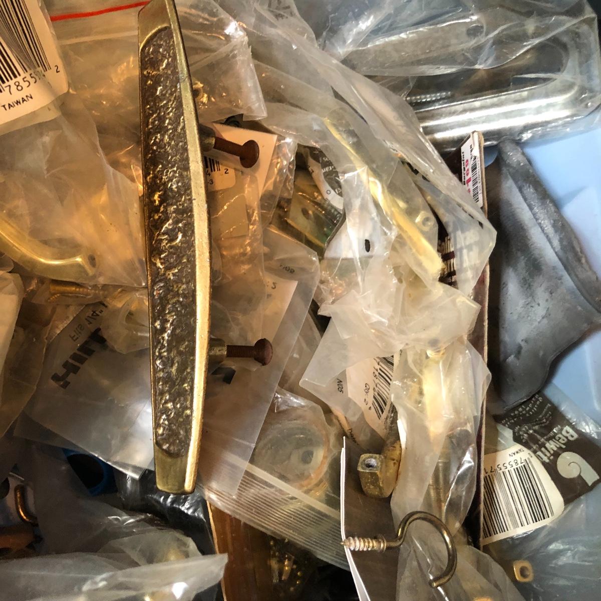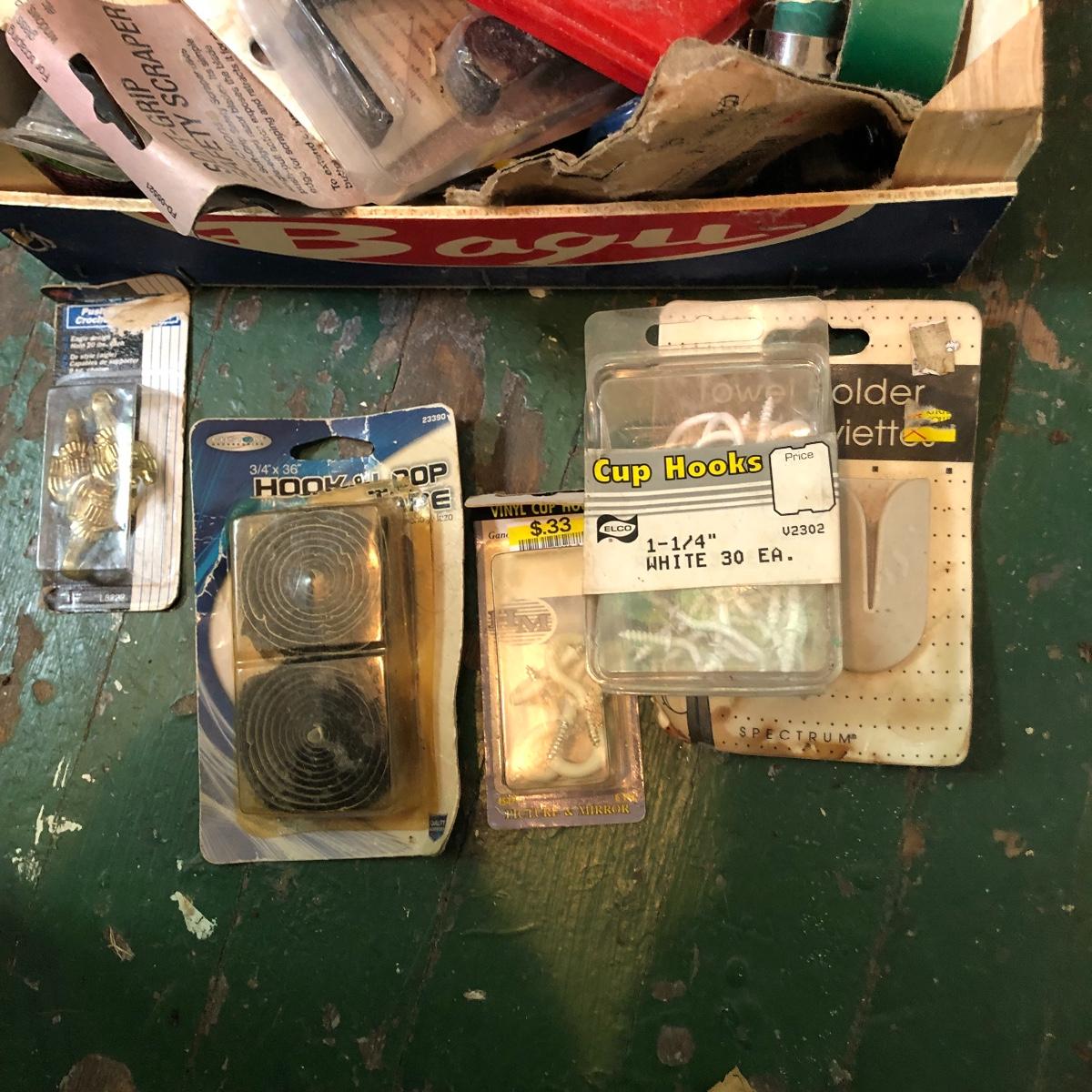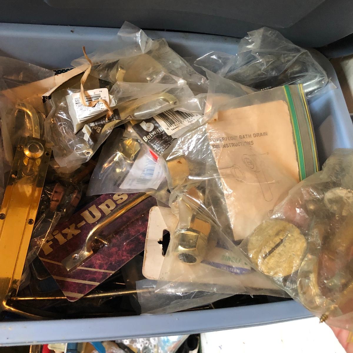 This huge lot has a blue tub full of brass hardware that includes handles, pulls, locks and much more. The small blue toolbox is metal and measure 6.5” x 11” x 30'. Other hardware includes casters both plastic and heavy duty metal, screws, bolts, hinges, shelves and again much more. Painting supplies includes roller, tray, brushes and yes you guessed it “🦆.much more.