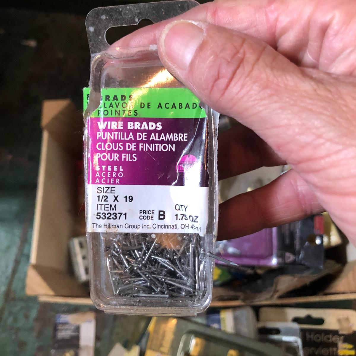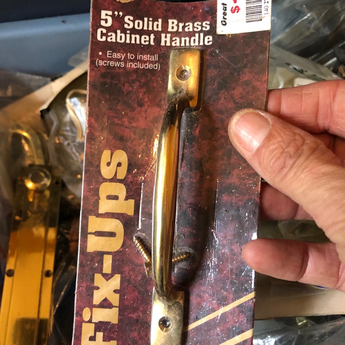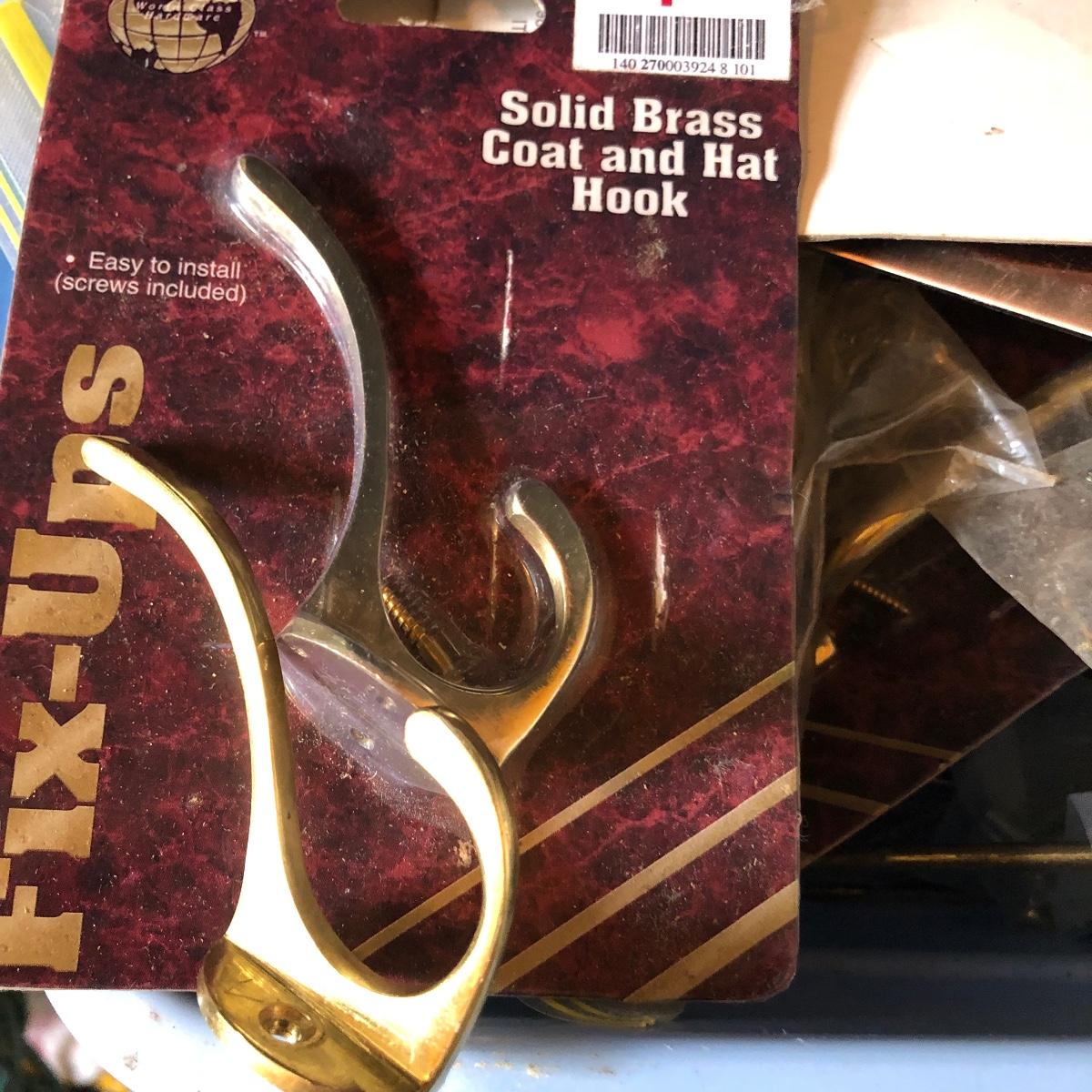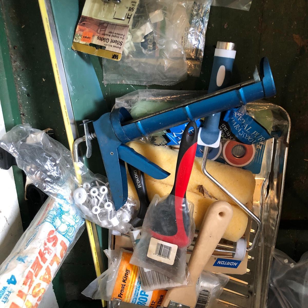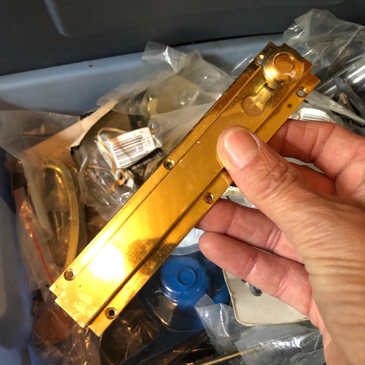 This huge lot has a blue tub full of brass hardware that includes handles, pulls, locks and much more. The small blue toolbox is metal and measure 6.5” x 11” x 30'. Other hardware includes casters both plastic and heavy duty metal, screws, bolts, hinges, shelves and again much more. Painting supplies includes roller, tray, brushes and yes you guessed it “🦆.much more.