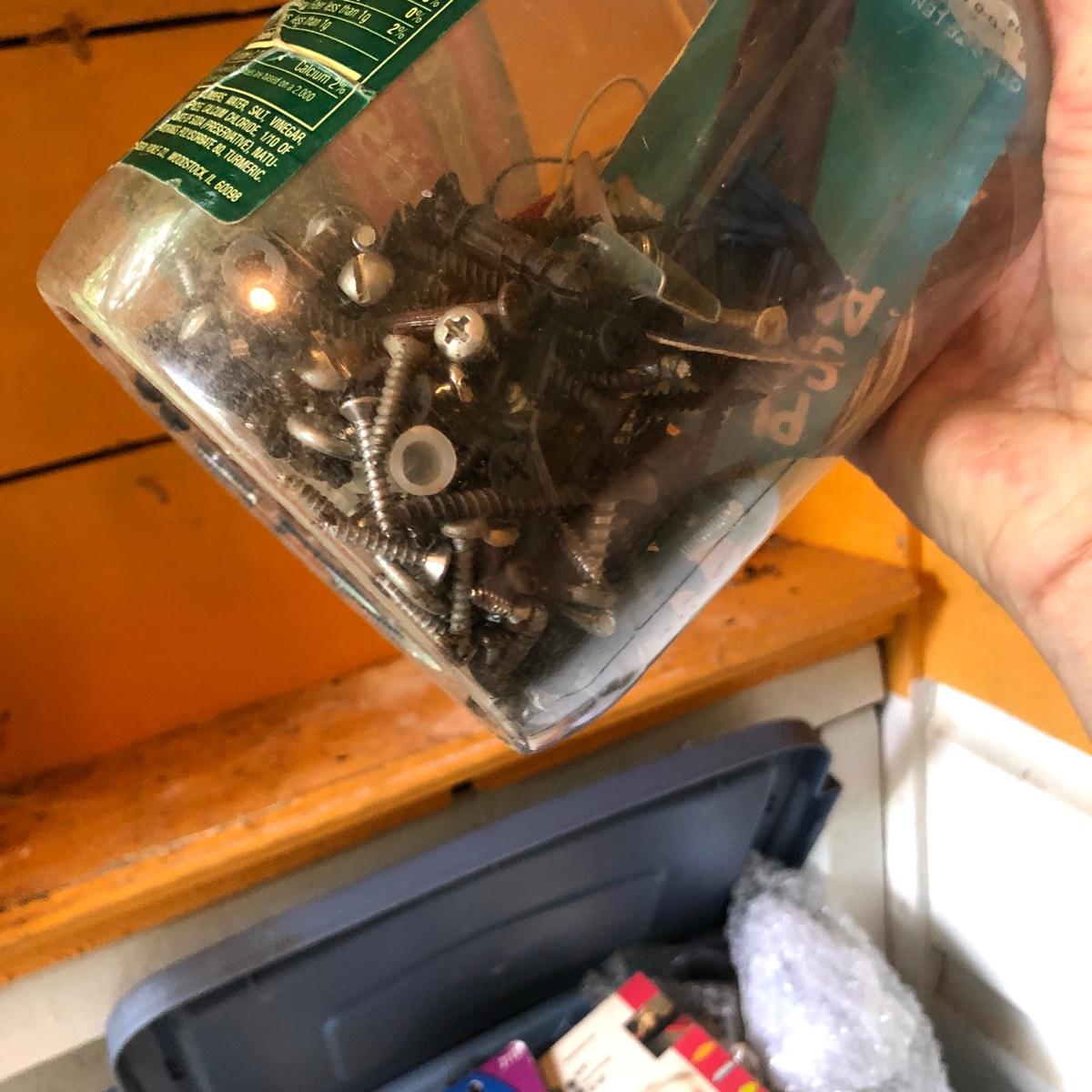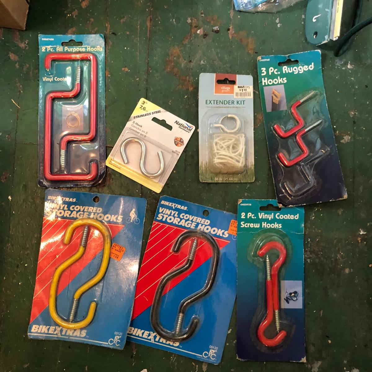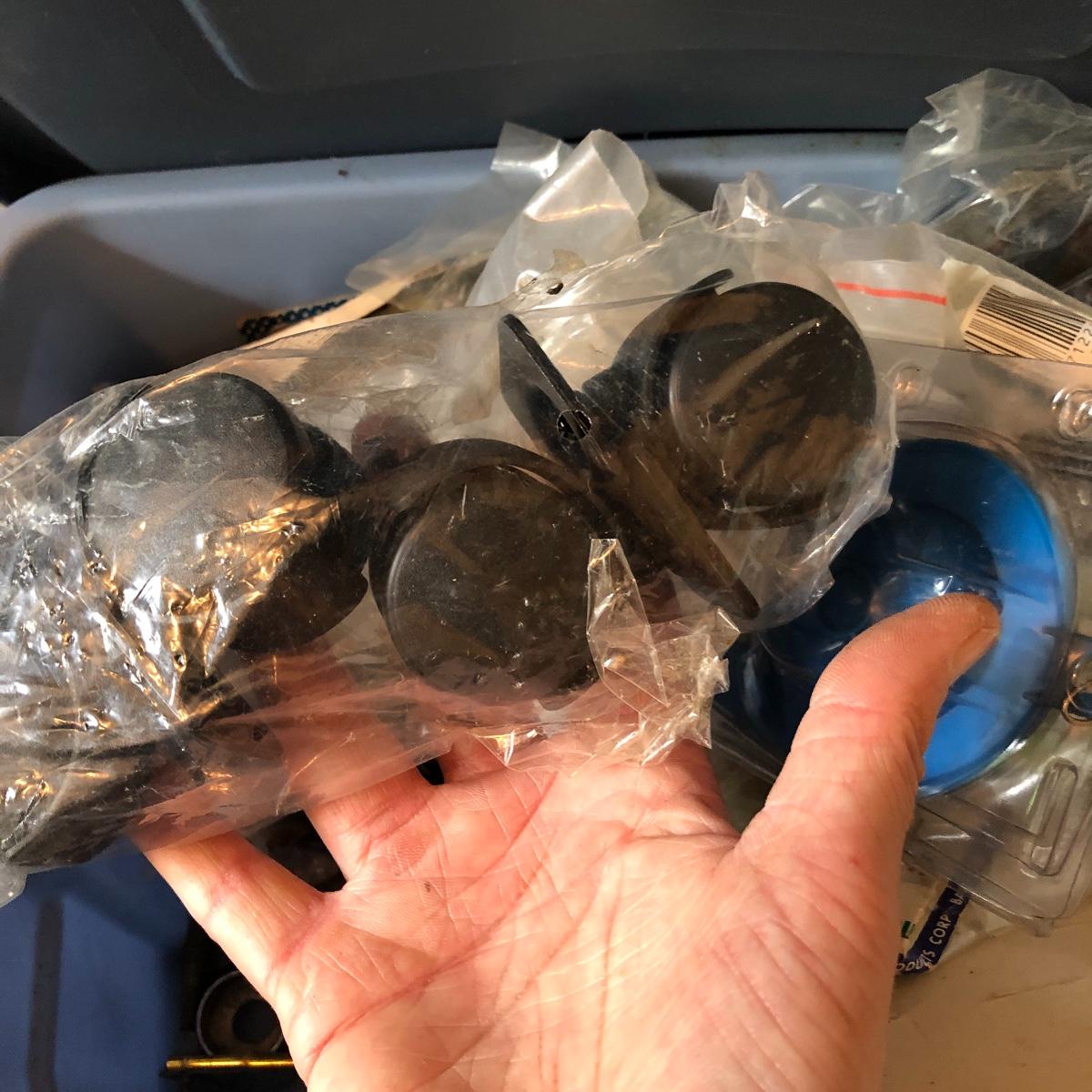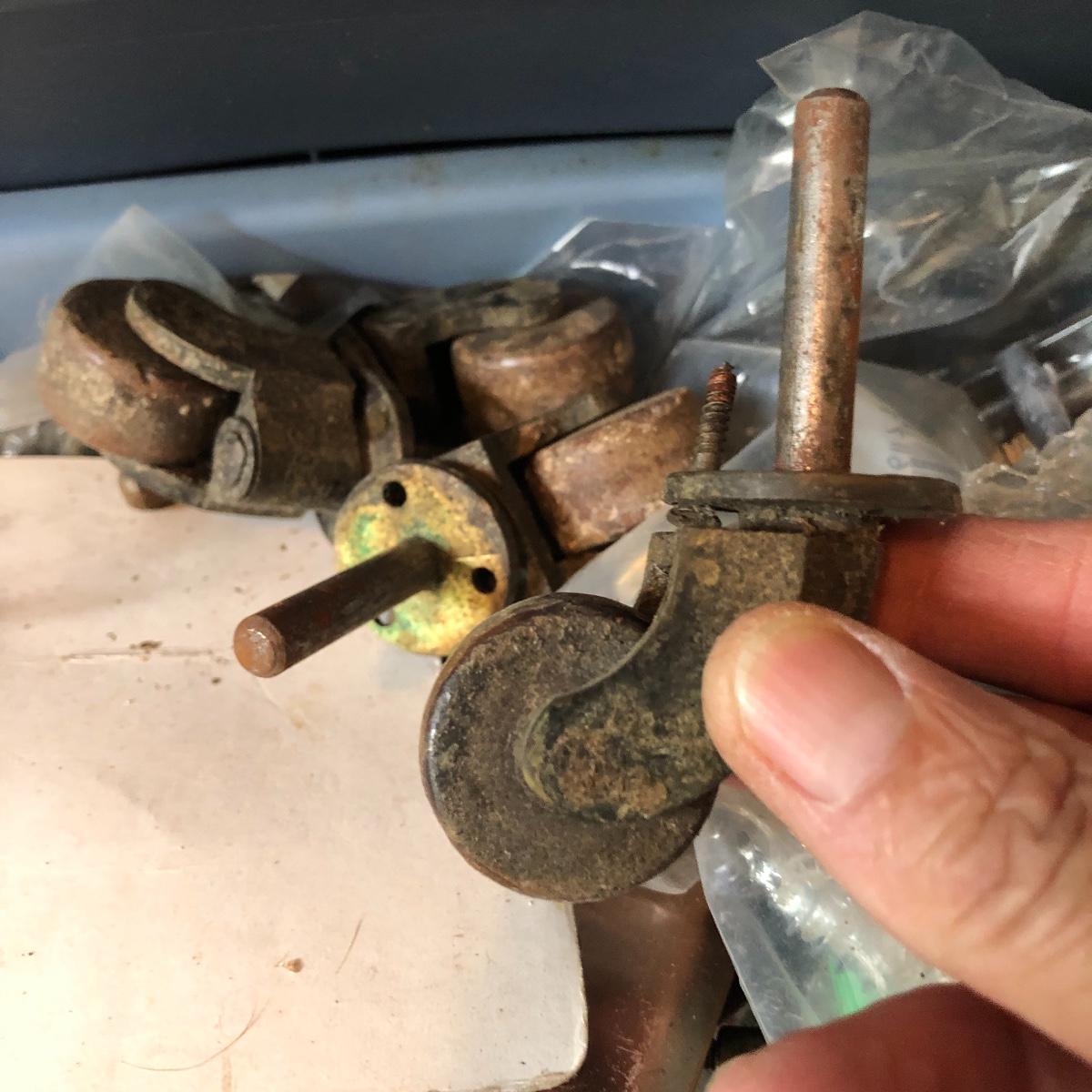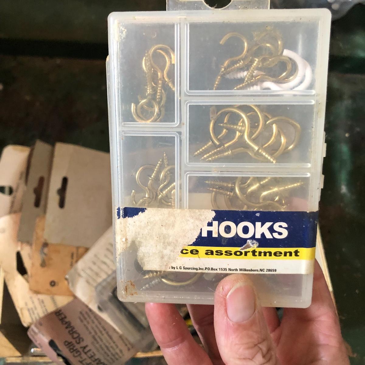 This huge lot has a blue tub full of brass hardware that includes handles, pulls, locks and much more. The small blue toolbox is metal and measure 6.5” x 11” x 30'. Other hardware includes casters both plastic and heavy duty metal, screws, bolts, hinges, shelves and again much more. Painting supplies includes roller, tray, brushes and yes you guessed it “🦆.much more.