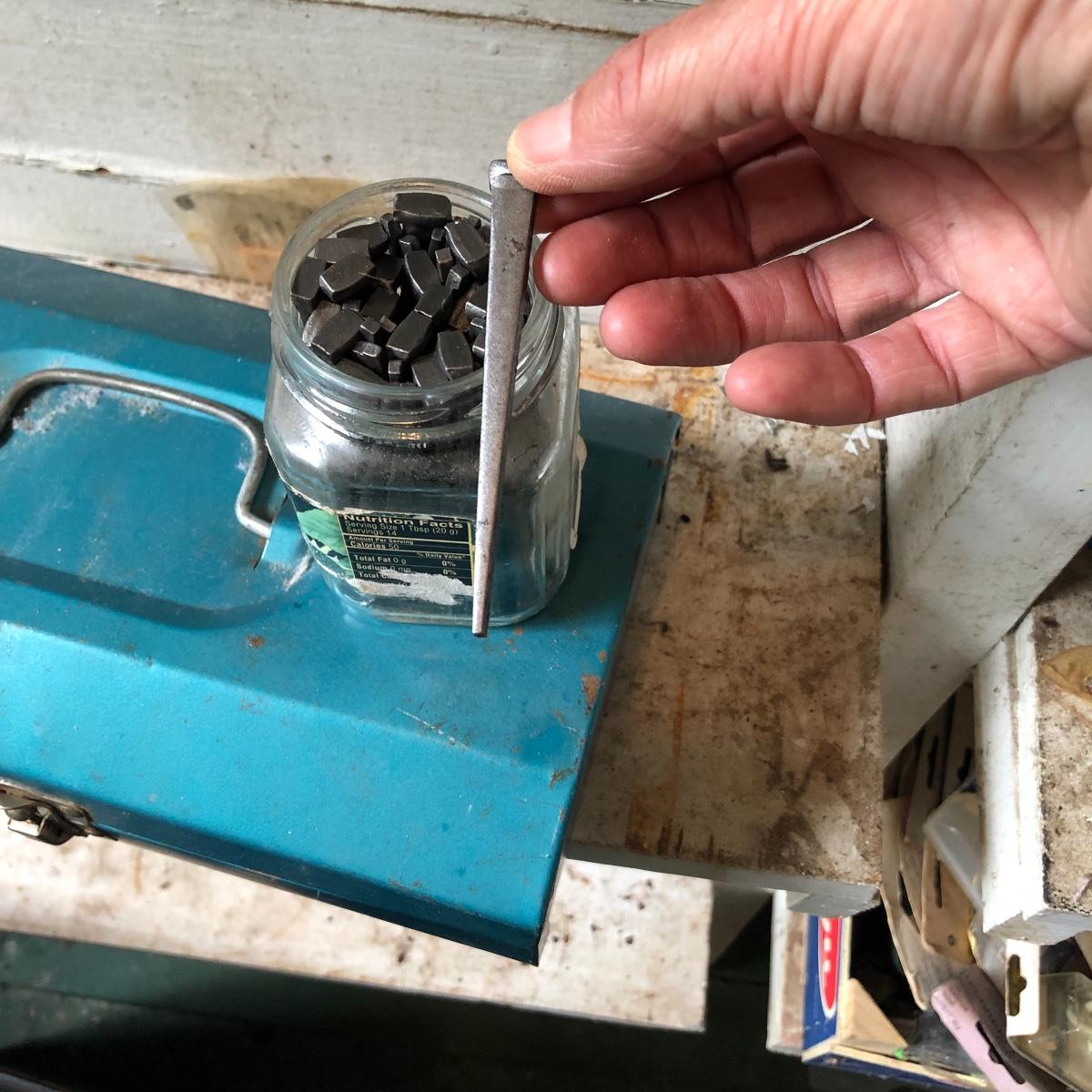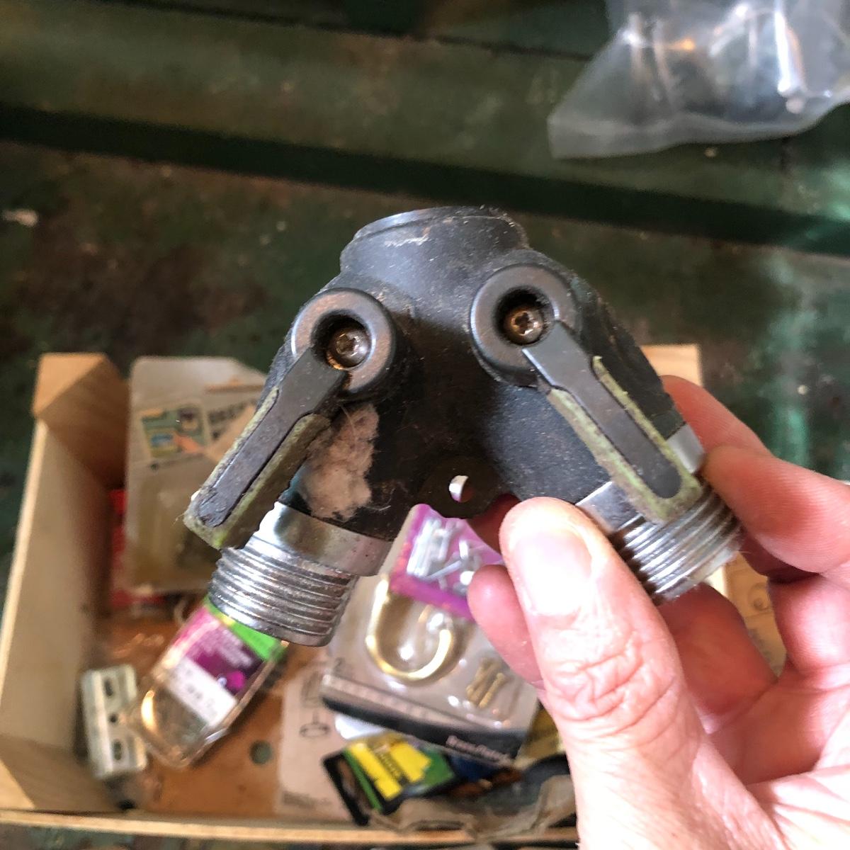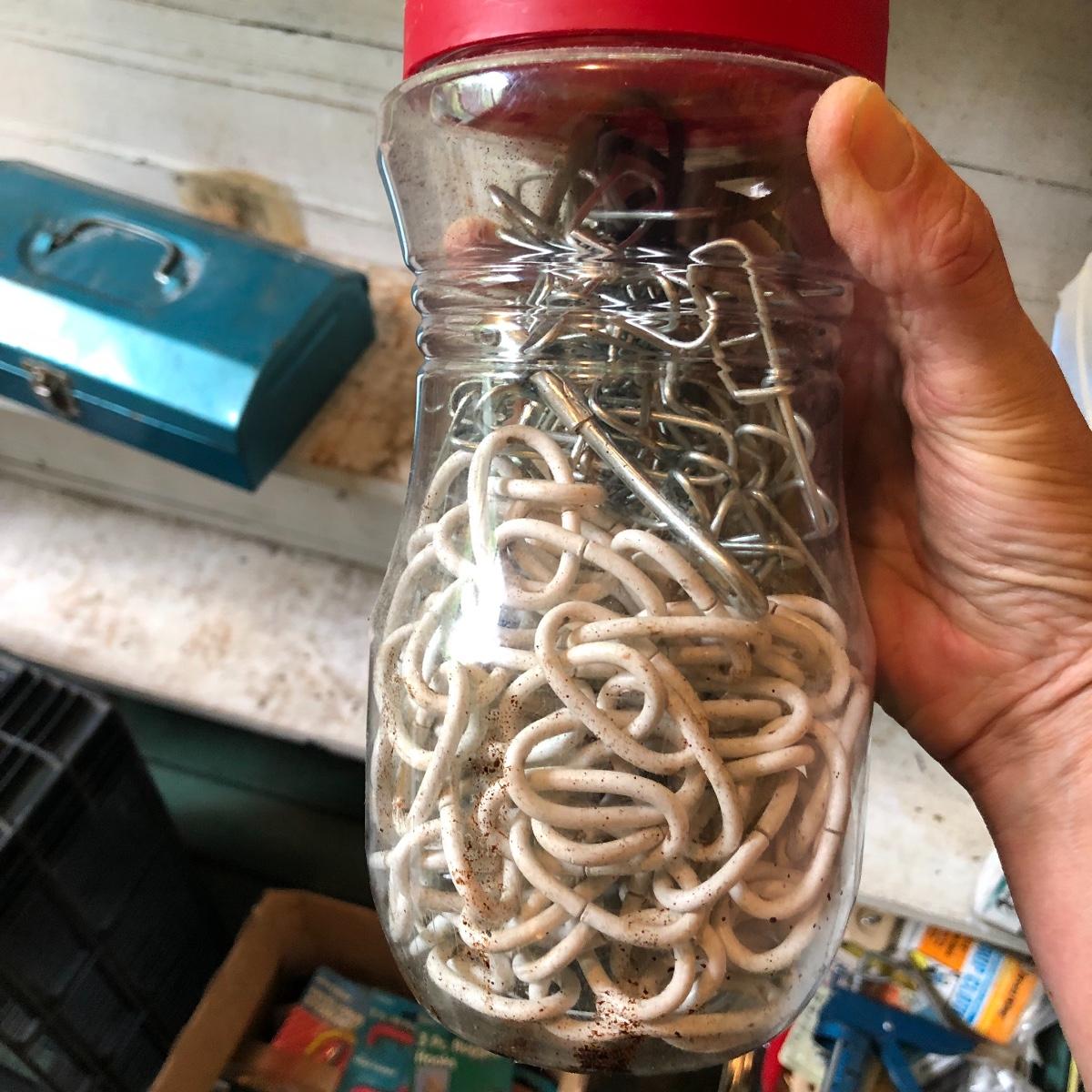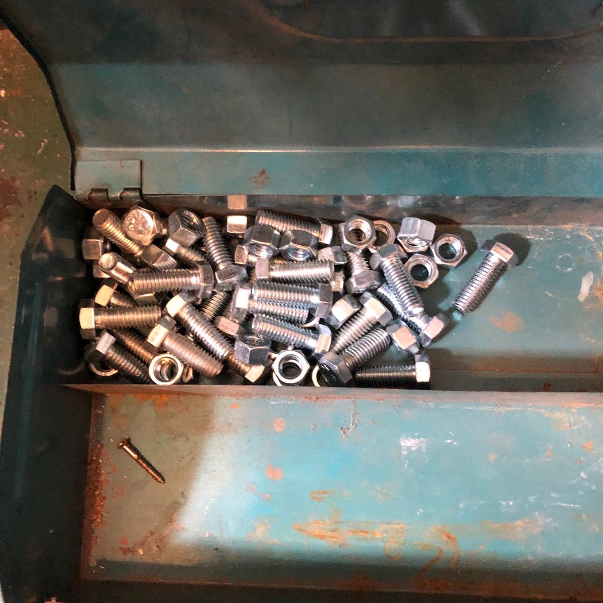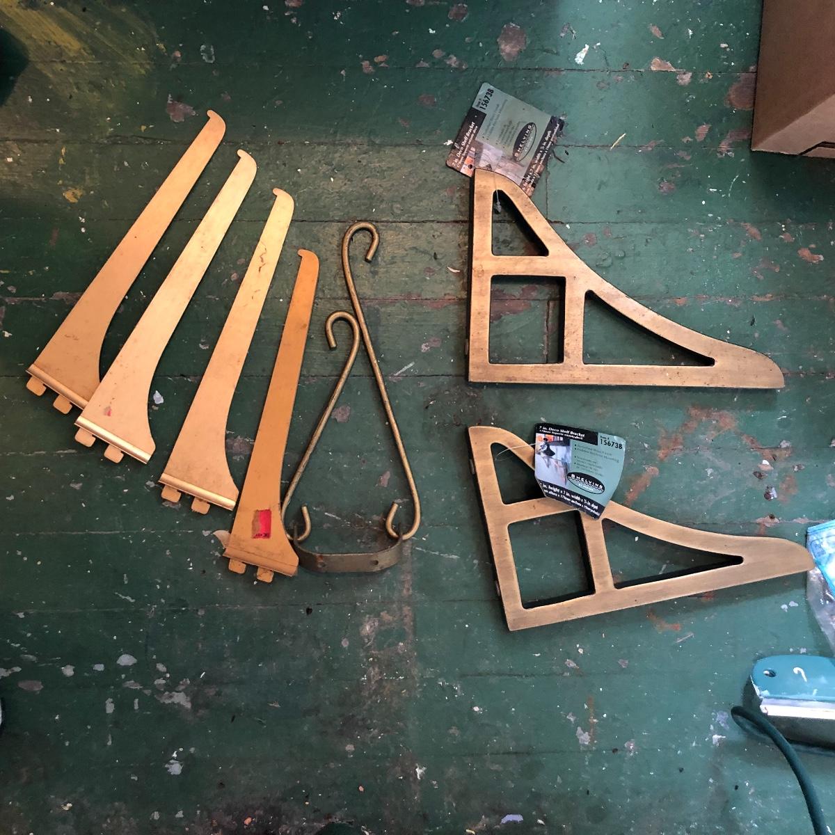 This huge lot has a blue tub full of brass hardware that includes handles, pulls, locks and much more. The small blue toolbox is metal and measure 6.5” x 11” x 30'. Other hardware includes casters both plastic and heavy duty metal, screws, bolts, hinges, shelves and again much more. Painting supplies includes roller, tray, brushes and yes you guessed it “🦆.much more.