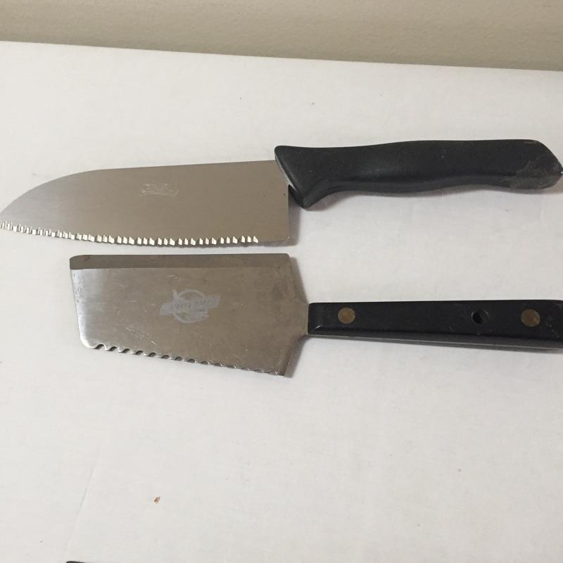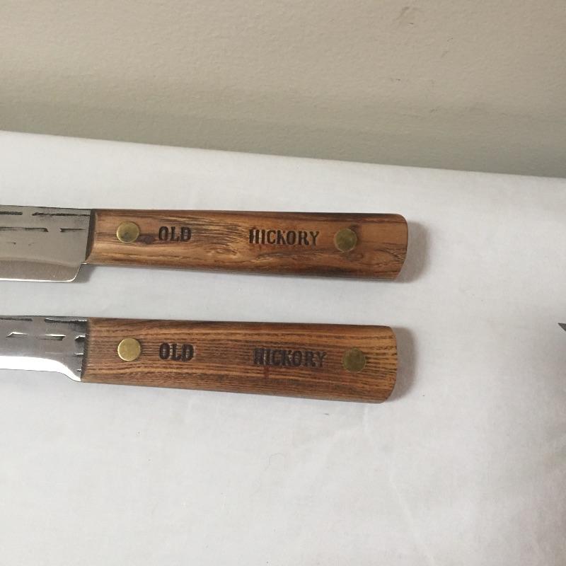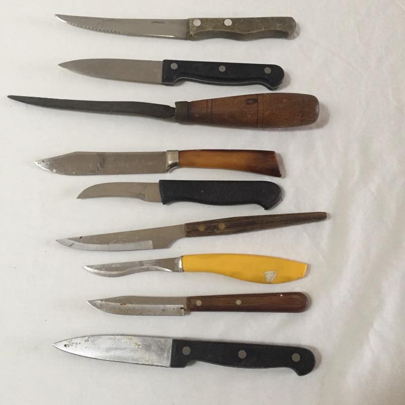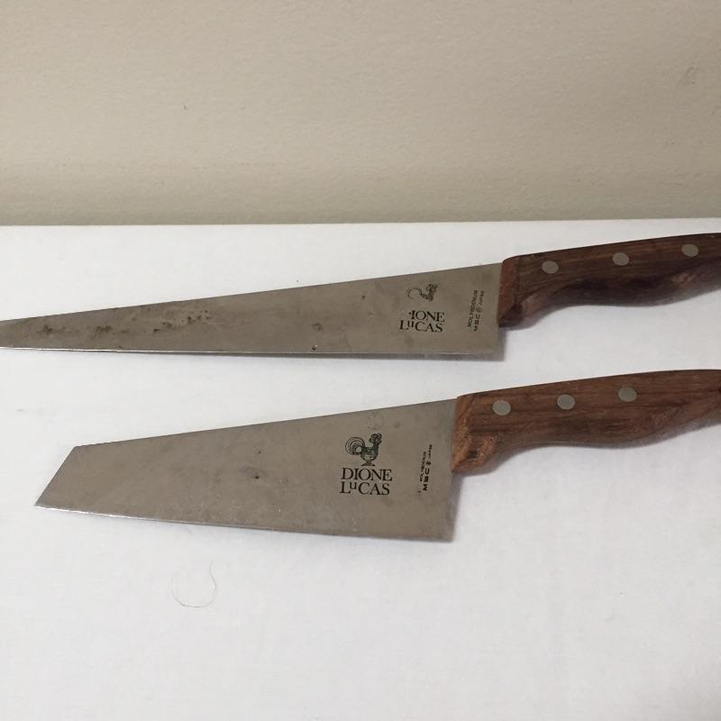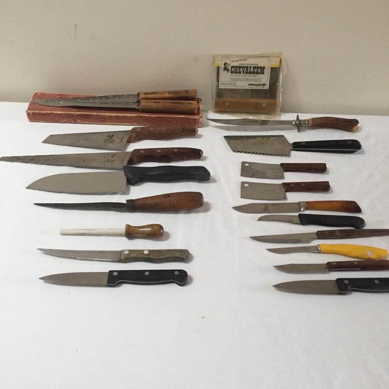Assortment of kitchen knives including Dione Lucas , Old Hickory , a chevaleem , sharpening stone and more. Take your favorites to complete your collection and donate the rest.