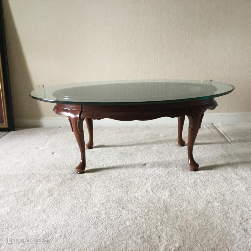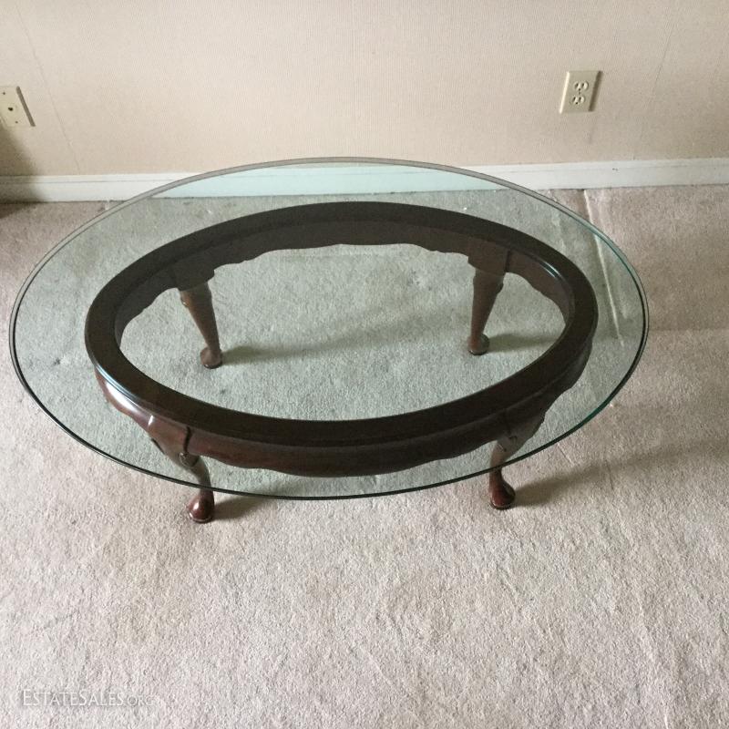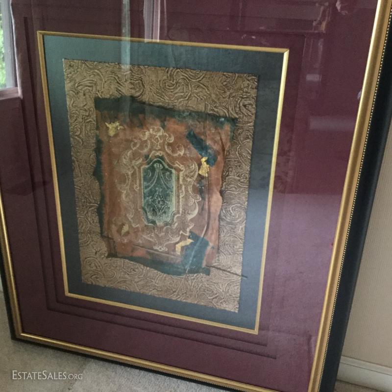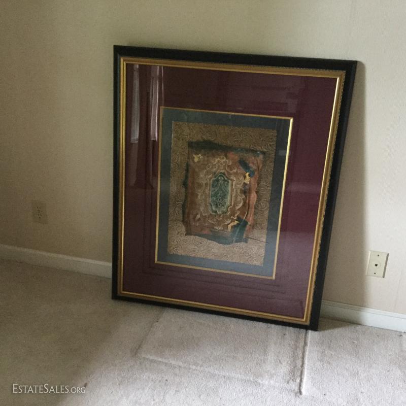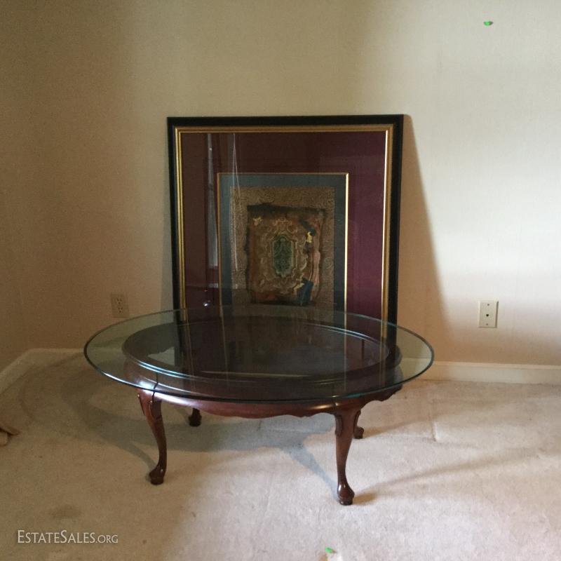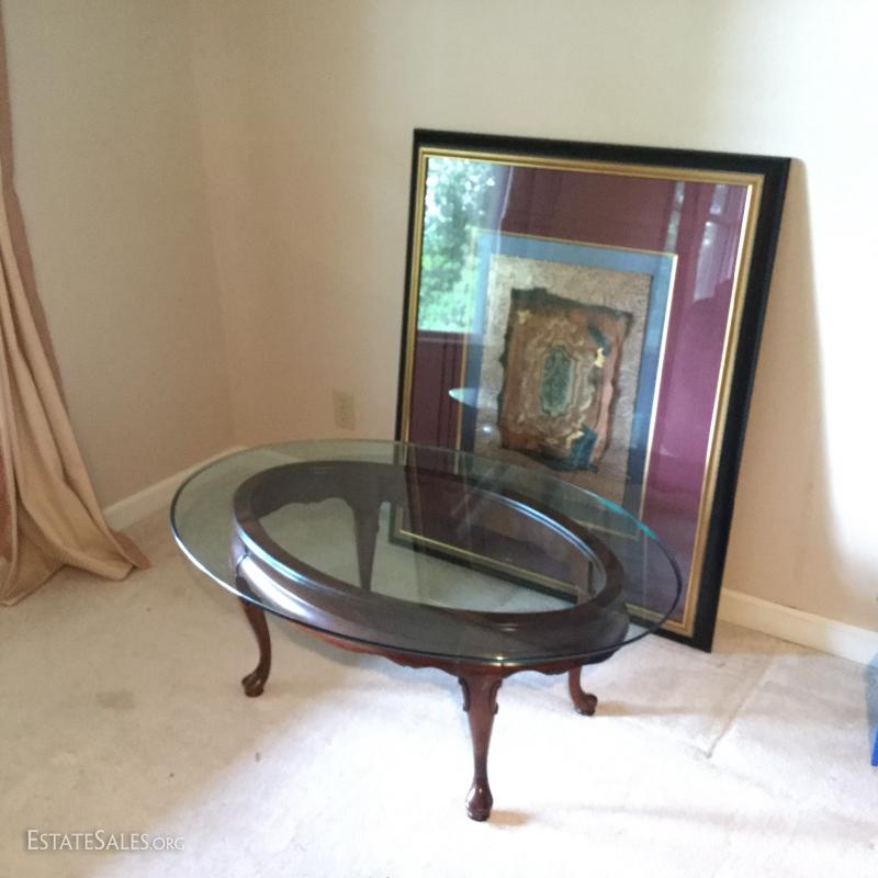 Large framed art, 43"l x 36"w. Gold and red tones with black frame. Wood coffee table with glass top, 44"l x 30"w.