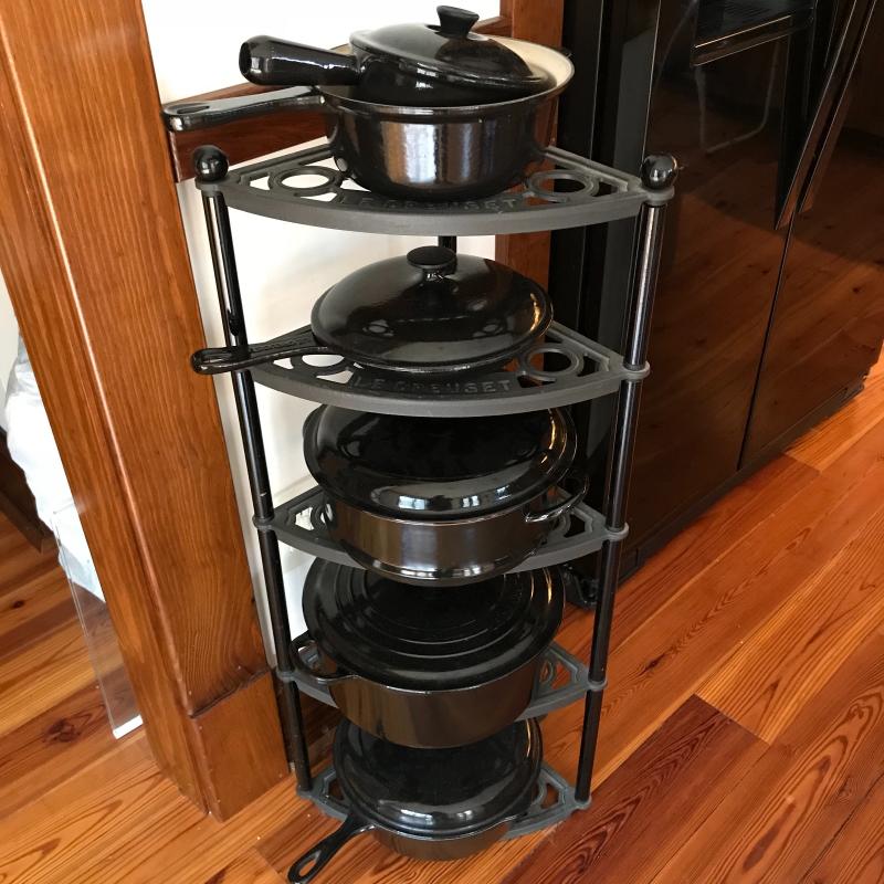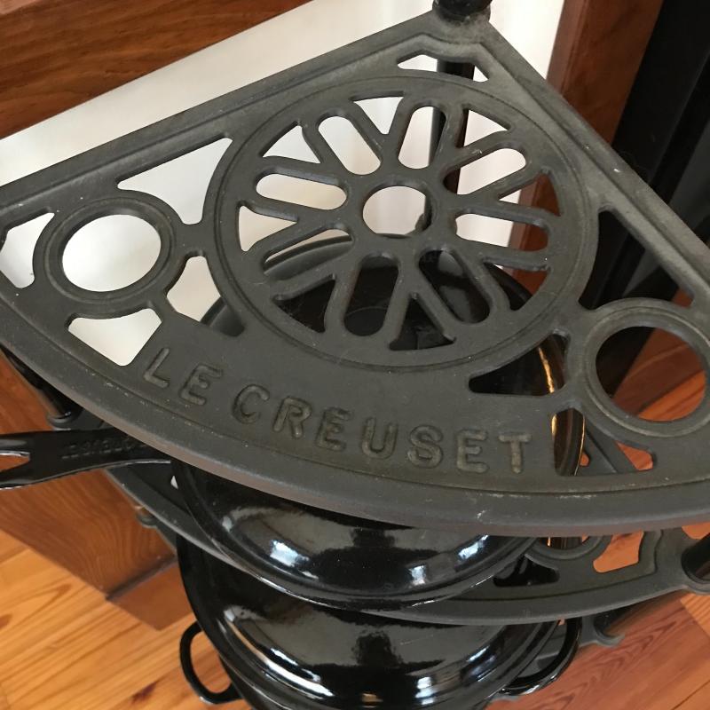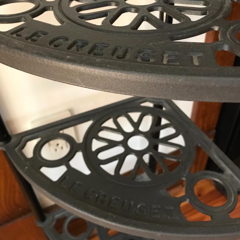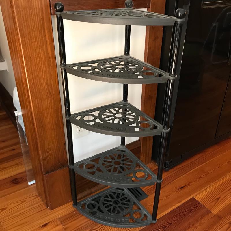 Le Creuset shelf is approx. 35” tall and 11” deep. Five cast iron shelves. Great for storing your pans. Pans in photo are NOT included. They are available in lot 79. No shipping available. Local pickup only in Asheville, NC.