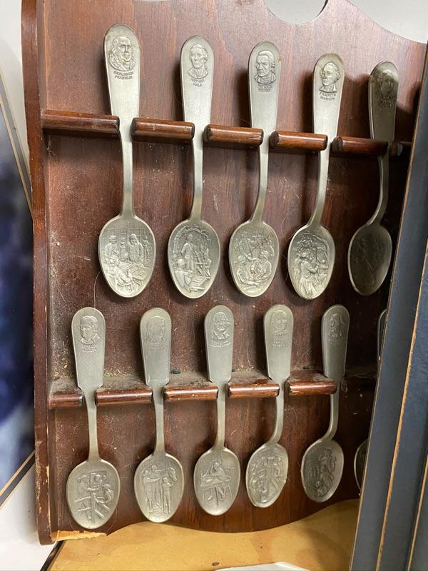 Lot of one owl framed owl photograph, duck print , wooden mid century goose decor, one bird print, and set of bicentennial spoons.
