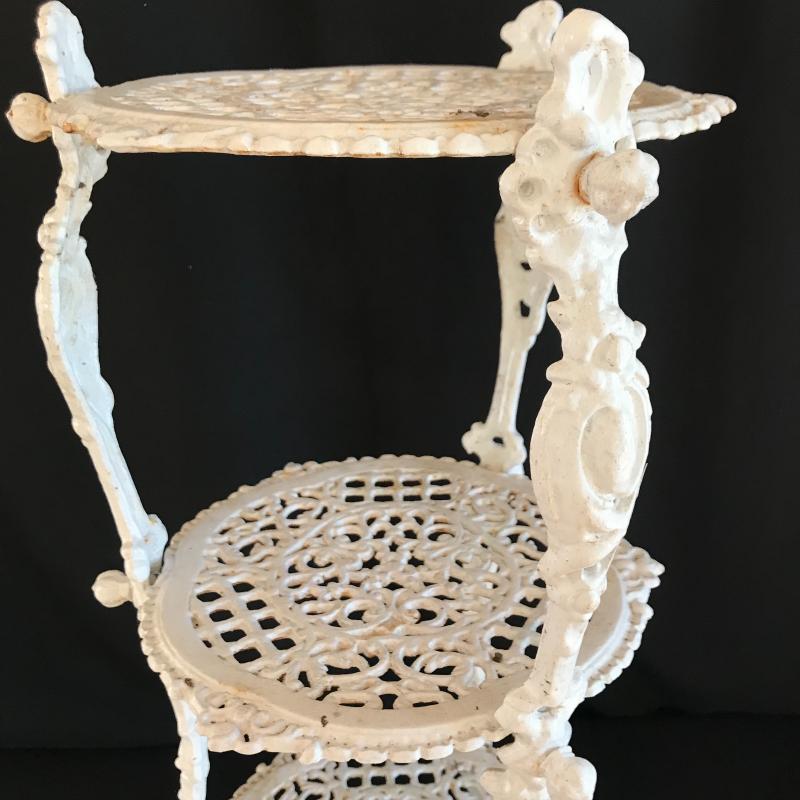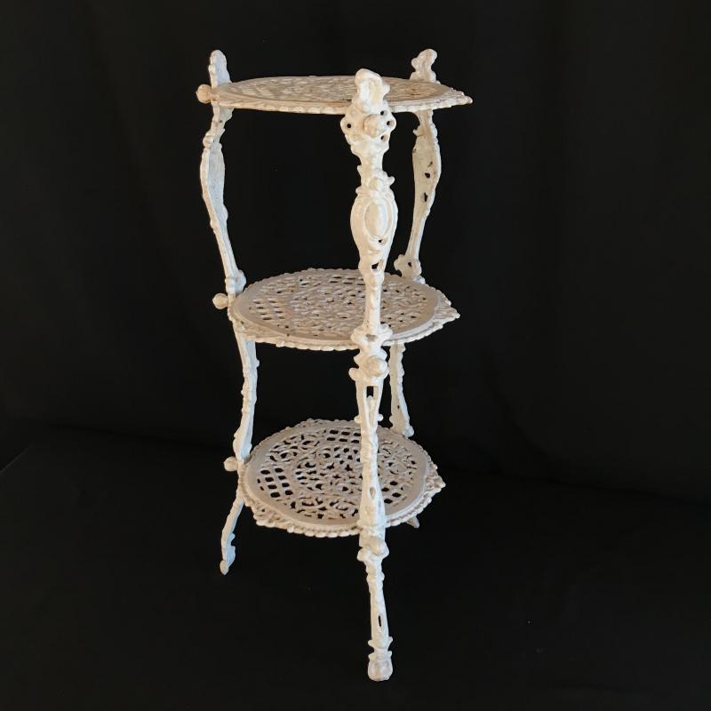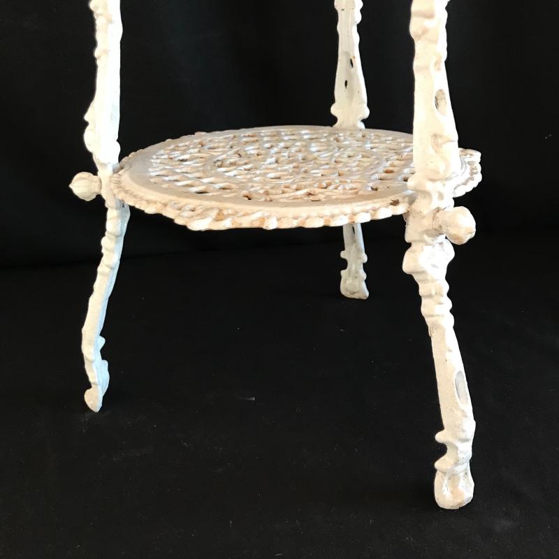 Heavy wrought iron painted tiered shelf. Three sturdy shelves with beautiful design. Three legged. Painted white. 12” d at widest leg x 26”h. No shipping. Local pick up only in Asheville, NC