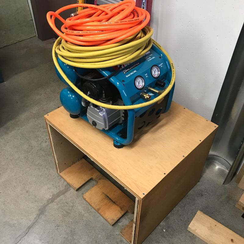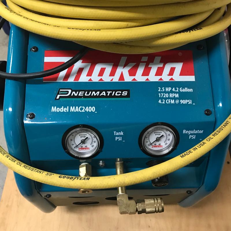 2.5 Hp and 4.2 Gallon Mikita Air Compressor. Custom wood insulated box included for noise reduction. Two hoses also included. Lot is available for local pick up in Asheville, NC only.