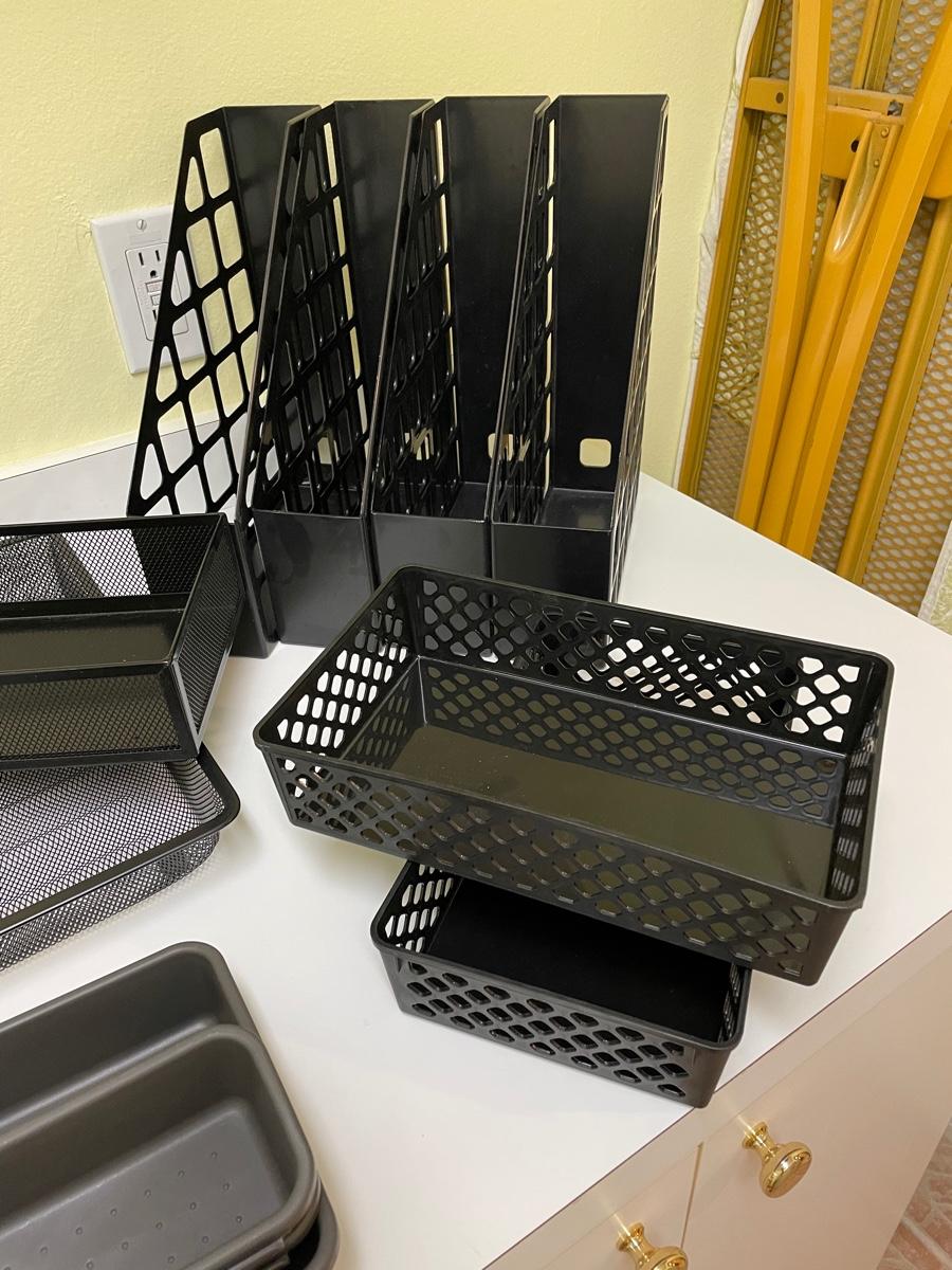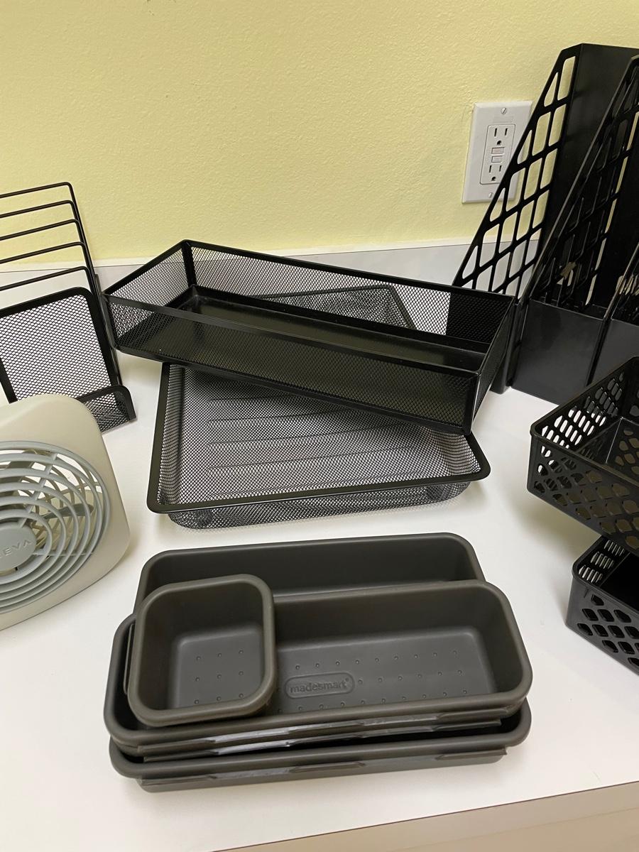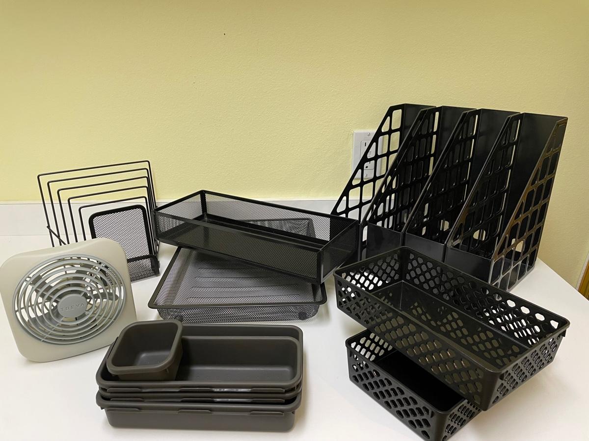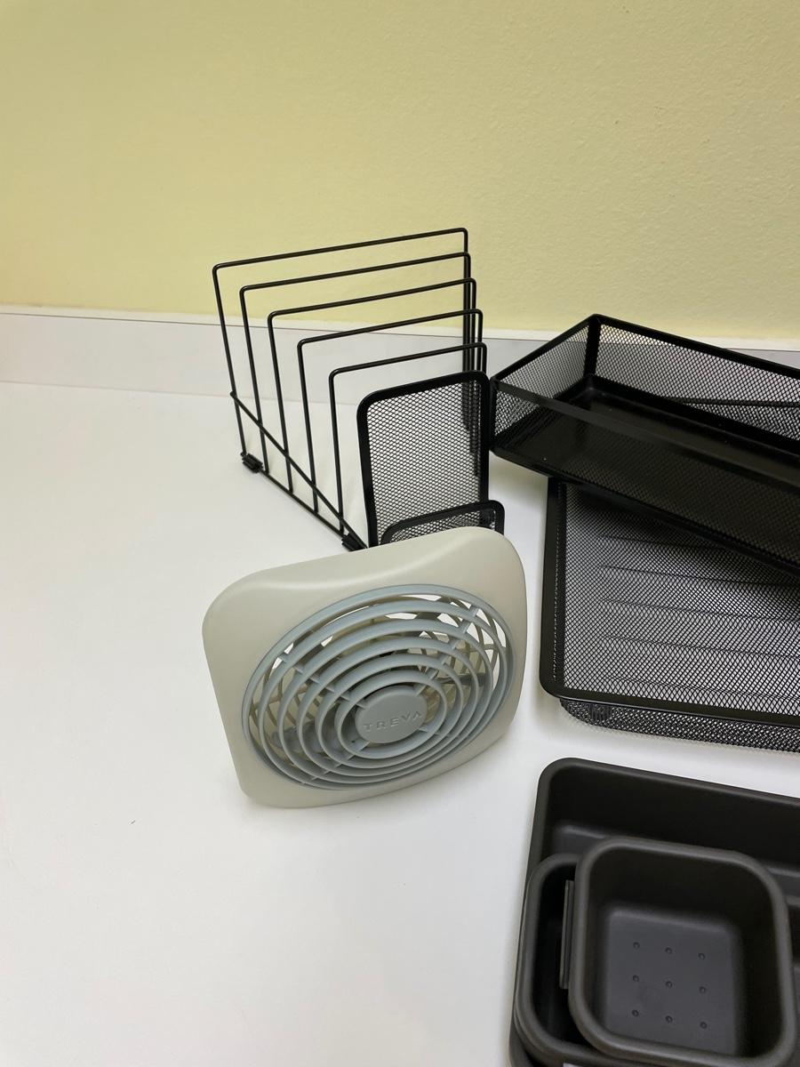 File stand, 4 magazine holders, 2 mesh trays, 2 plastic trays, drawer organizers, battery-operated fan