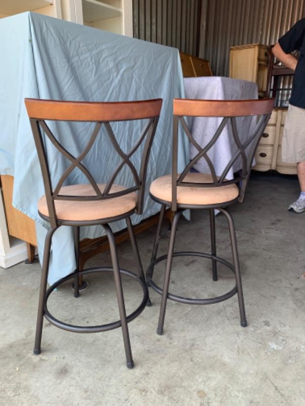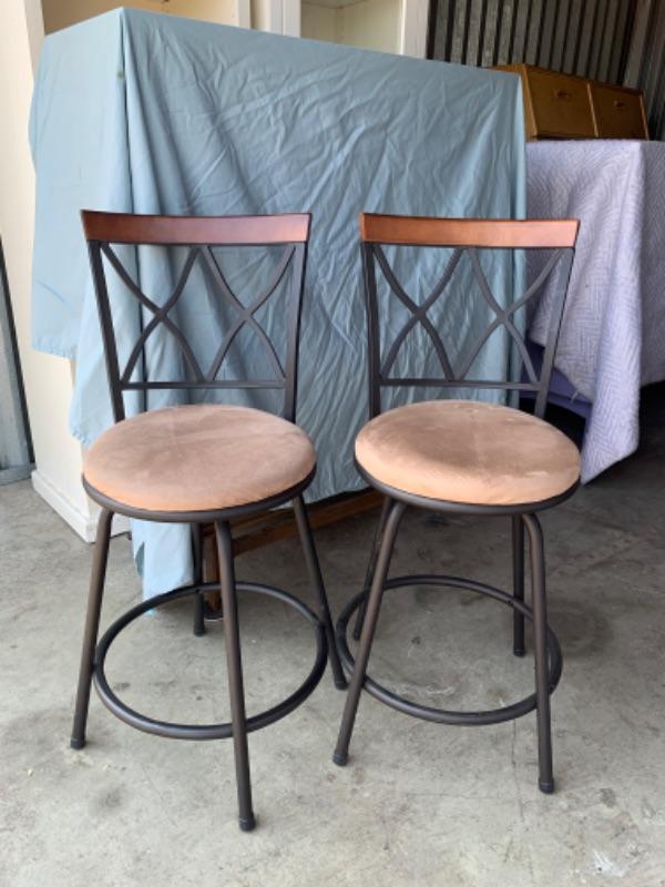 Dark brown metal frame with wood accents and tan microfiber swivel seat. Very little use and in immaculate condition. Measures 15” diameter seat, 15 1/2” across top of back and 37” from floor-to-seat.