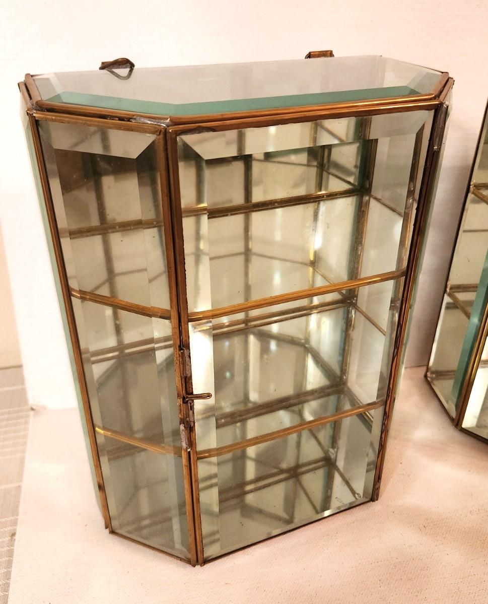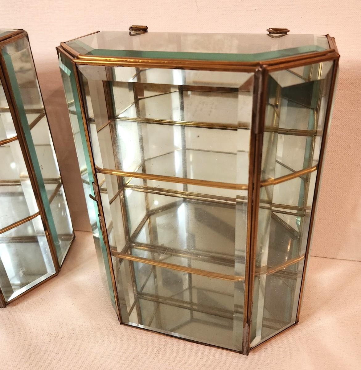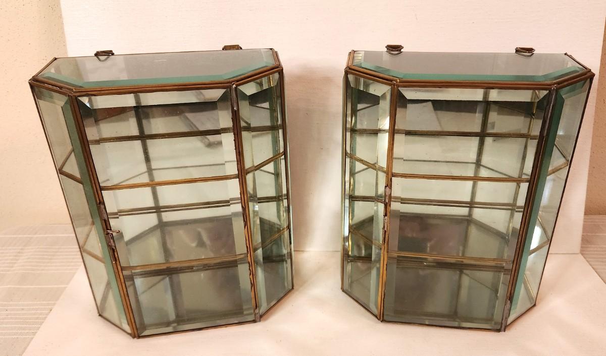Nice pair of beveled glass small curio cabinets - 8" wide, 10" tall, 5" deep. Can be hung on wall or stand alone on table. Good condition.