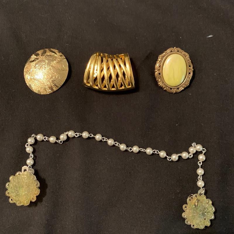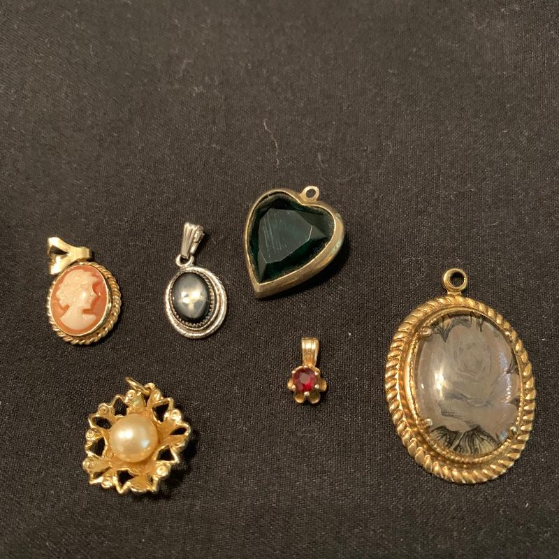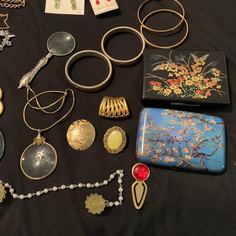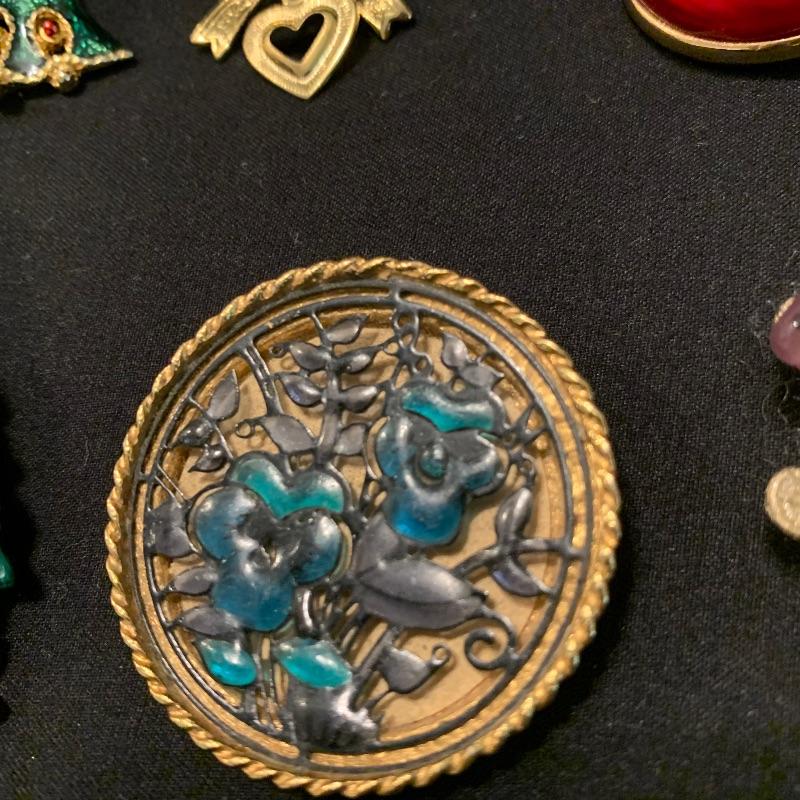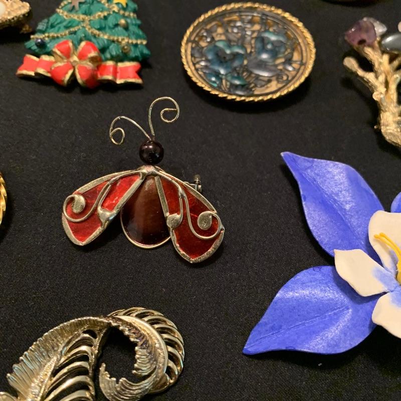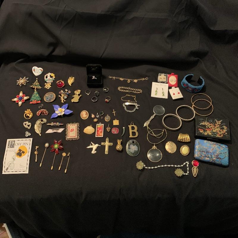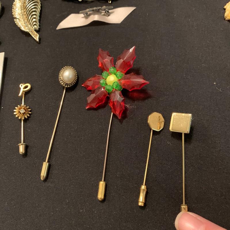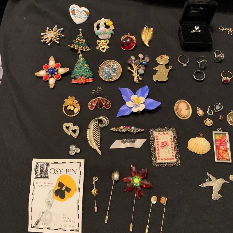 This lot has a large selection of pins from holiday style and every day flare pins including six stick pins and one well done rose needle point pin/pendant combo. There are several pendants in this lot from delicate cross to chunky brass B and pineapple. A lovely cameo pin pendant combo is a nice vintage feature as well as seven rings mostly between sizes 7 & 8, to include two mood rings one faux engagement set and a iridescent shell like ring. The ring with the faux ruby centerpiece has an adjustable band. Four pairs of stud earrings and few bracelets, scarf accessories and two cases finish out this bountiful lot of goodies. Shipping available.