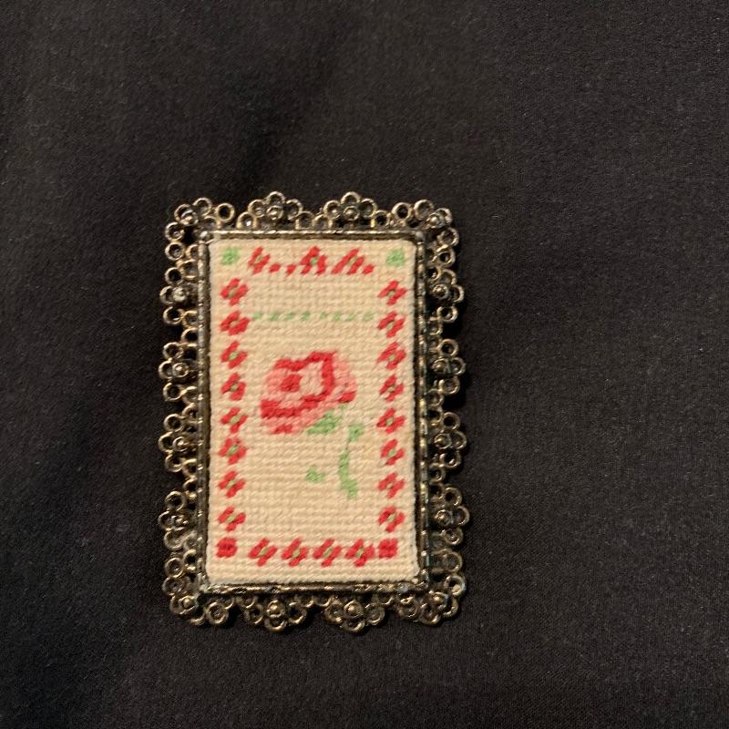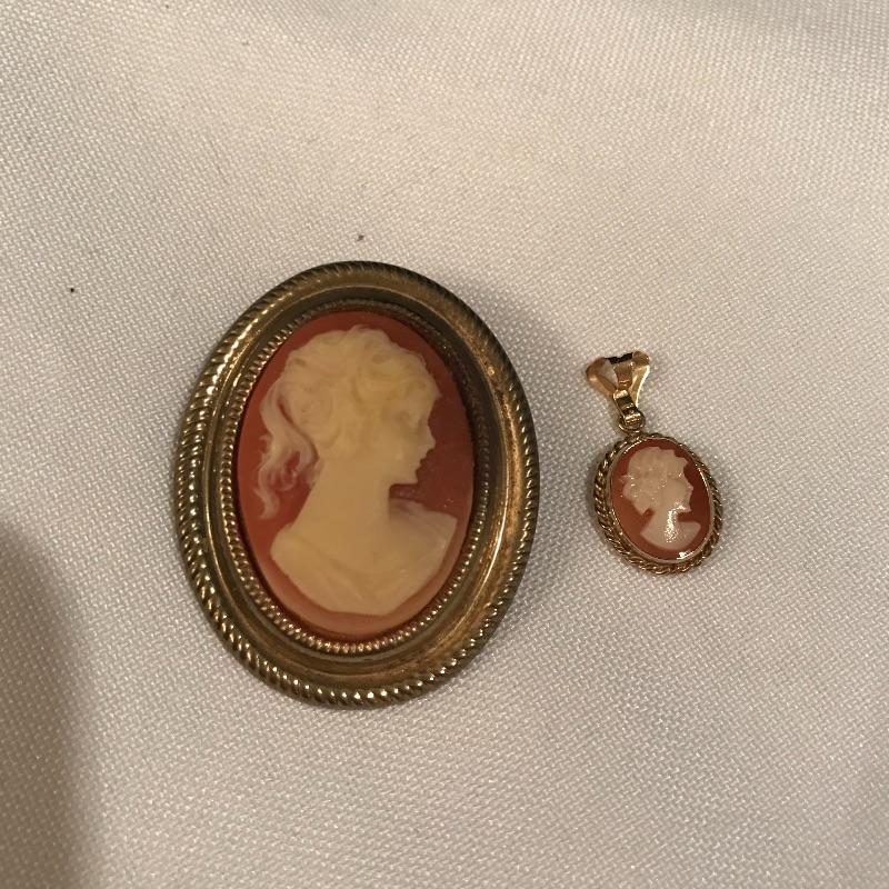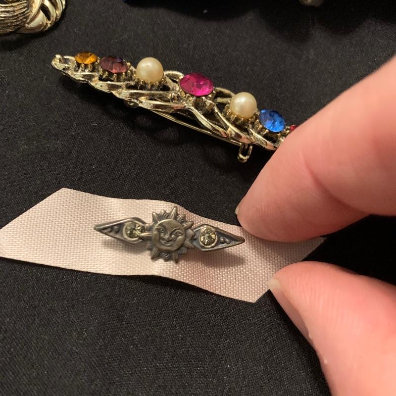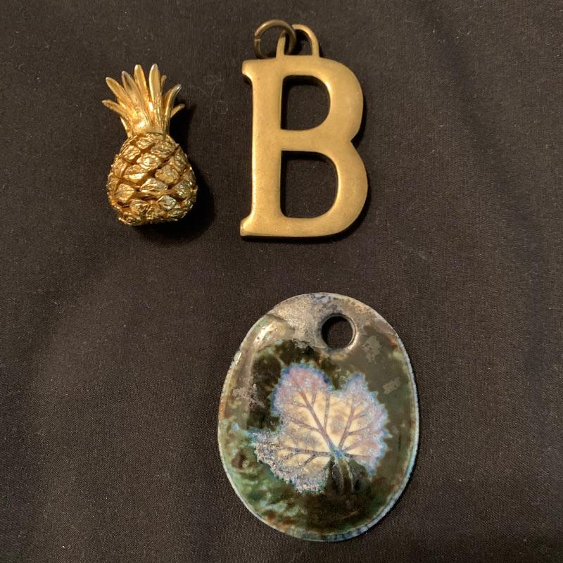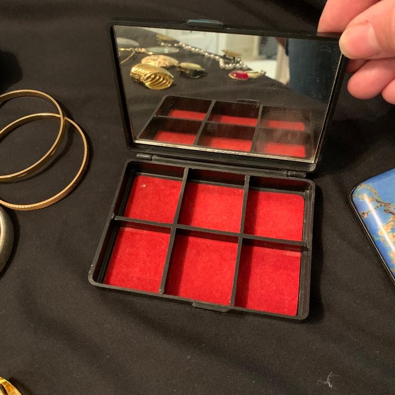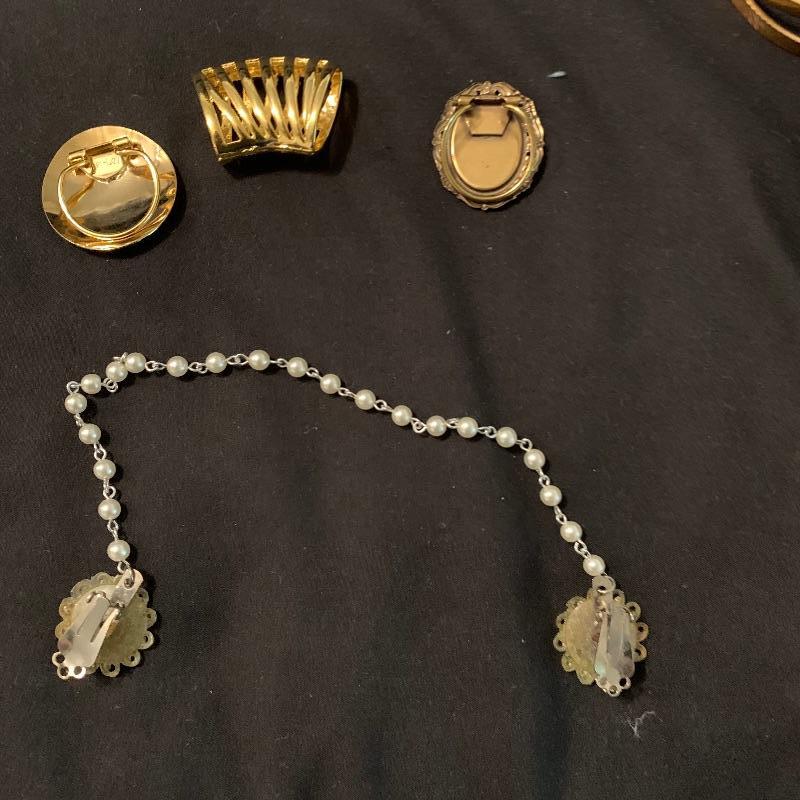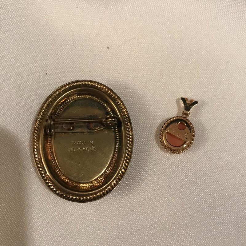 This lot has a large selection of pins from holiday style and every day flare pins including six stick pins and one well done rose needle point pin/pendant combo. There are several pendants in this lot from delicate cross to chunky brass B and pineapple. A lovely cameo pin pendant combo is a nice vintage feature as well as seven rings mostly between sizes 7 & 8, to include two mood rings one faux engagement set and a iridescent shell like ring. The ring with the faux ruby centerpiece has an adjustable band. Four pairs of stud earrings and few bracelets, scarf accessories and two cases finish out this bountiful lot of goodies. Shipping available.