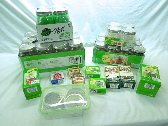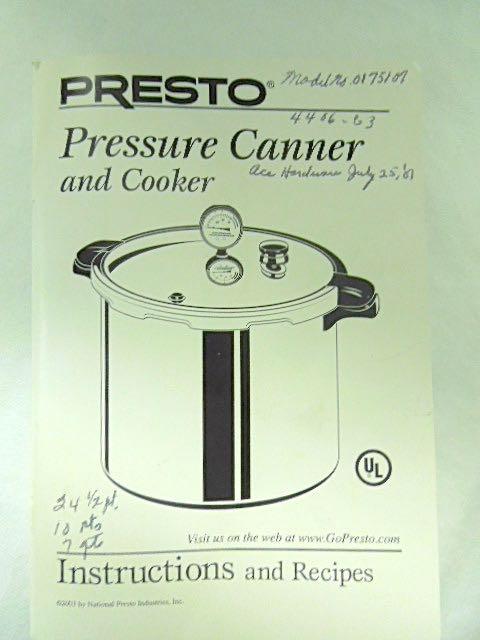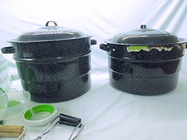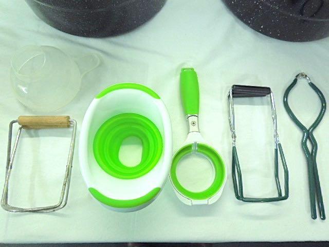 Huge lot full of like new items which will get you well on your way to canning your fruits and vegetables. One Presto Pressure Cooker model 0175107 (clean); 2 large enamel stock pots with two rack inserts for lifting jars out; a stand for setting hot stock pots on; 4 wide mouth pint jars with lids; 15 wide mouth quart jars with lids; 11 regular mouth quart jars with lids; 4 glass canisters; a metal collander; a metal fruit press with wooden crusher; 4 vintage style wide mouth quart jars with lids; 2 plastic funnels; 2 handheld jar lifters; a jar opener; 2 boxes holiday lids with bands; 1 box wide mouth lids with bands; 2 boxes wide mouth lids; 3 boxes regualr lids; 1 box egualr lids with bands; 1 box wide mouth bands; eight 4 oz. jars with bands.