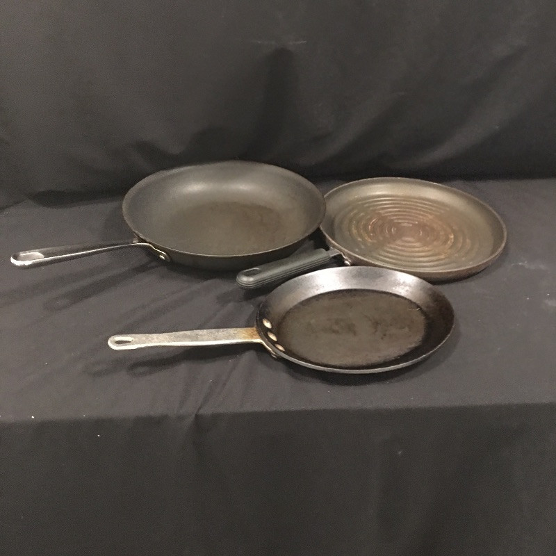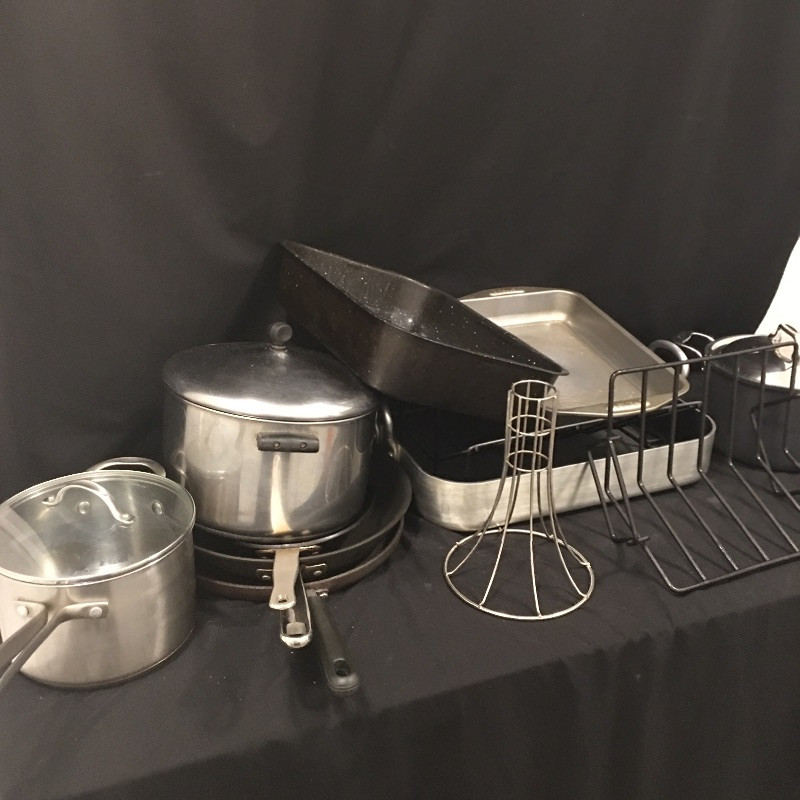 Cooks delight with this large Chefs roasting pan, three skillets, two pans with lids, pot with lid and more, see pictures.