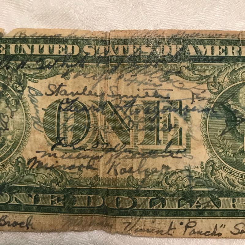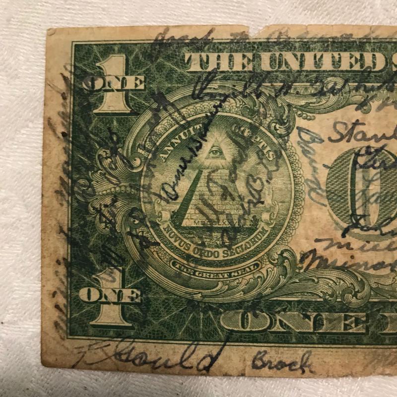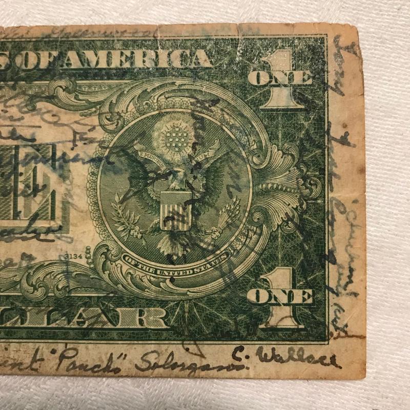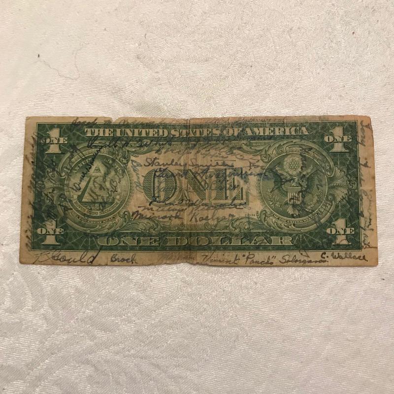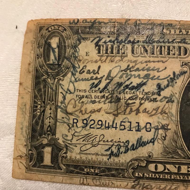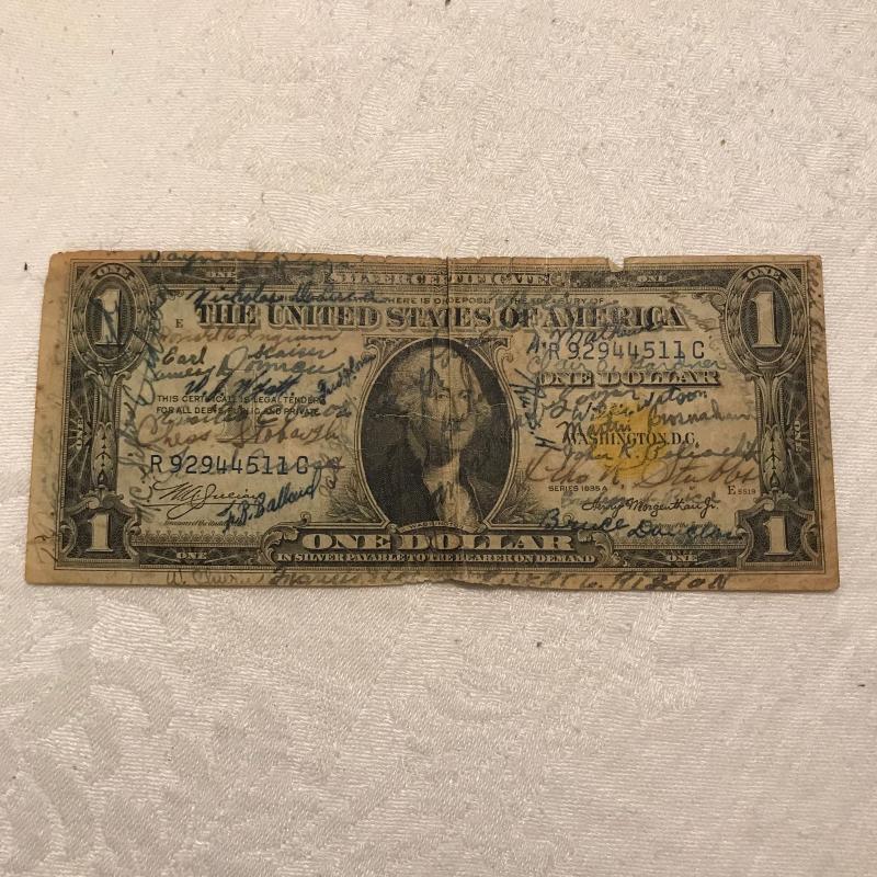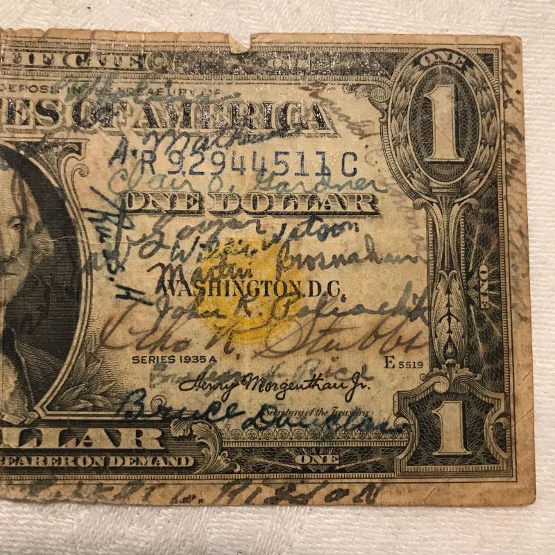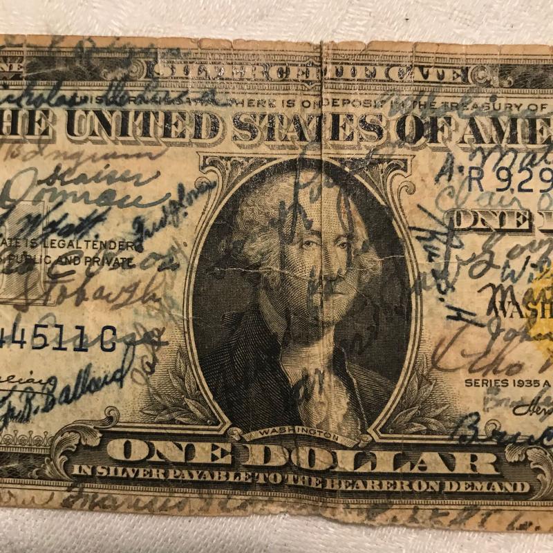 This One Dollar Bank Note has been signed by many people and is called a “short snorter”. Typically signed by people traveling together. The year on this silver certificate note is 1935A so it was likely signed in the war, although that is not verified. Lot of names are still legible. Great historic piece for your collection. Shipping available