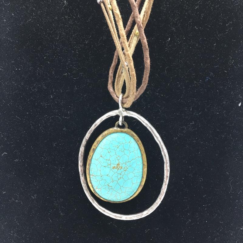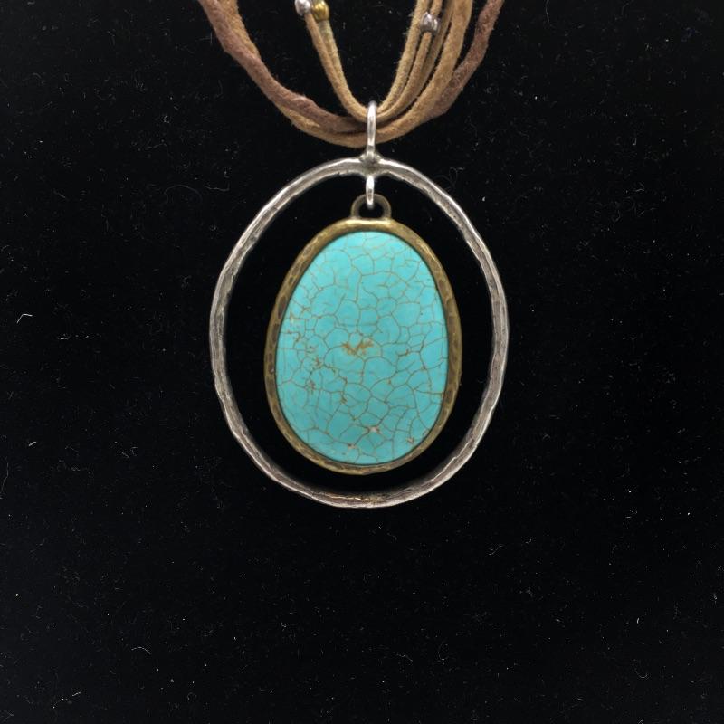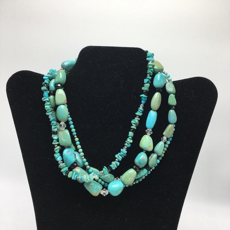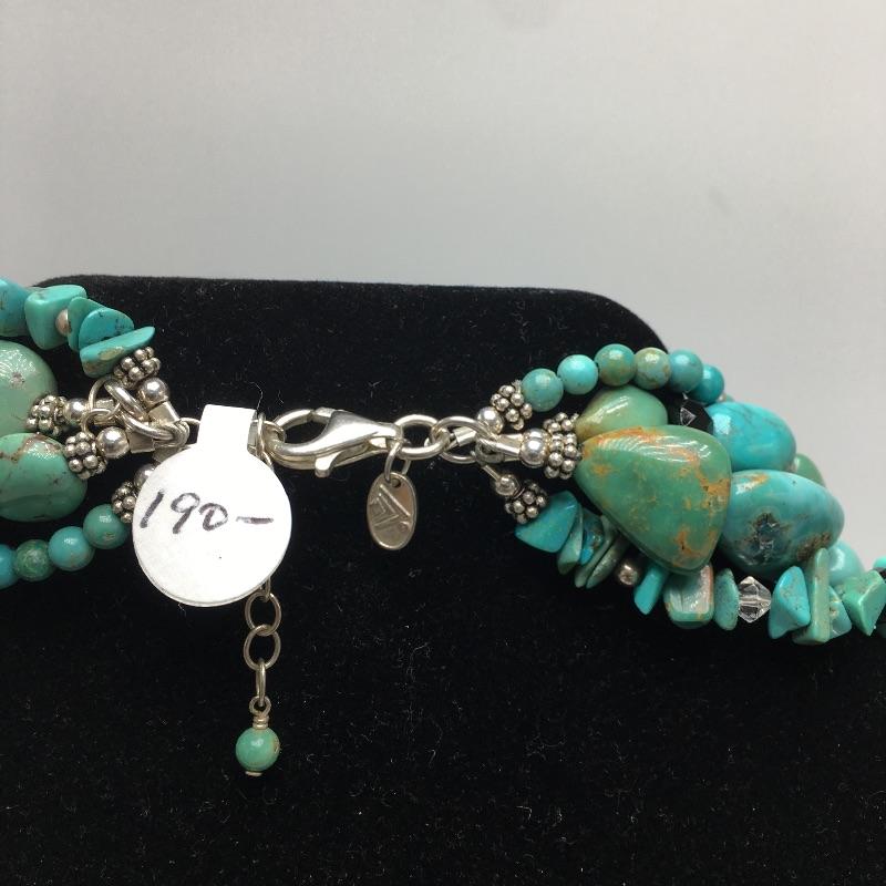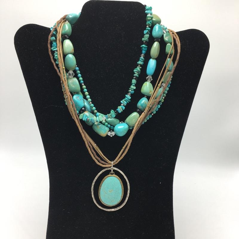 Pair of Silpada necklaces includes four strand turquoise, obsidian, crystal and sterling silver bead necklace with a lobster clasp that measures 16” with a 2” extender and a double halo necklace in bronze, sterling silver and brilliant howlite that adjusts 18”-20” long