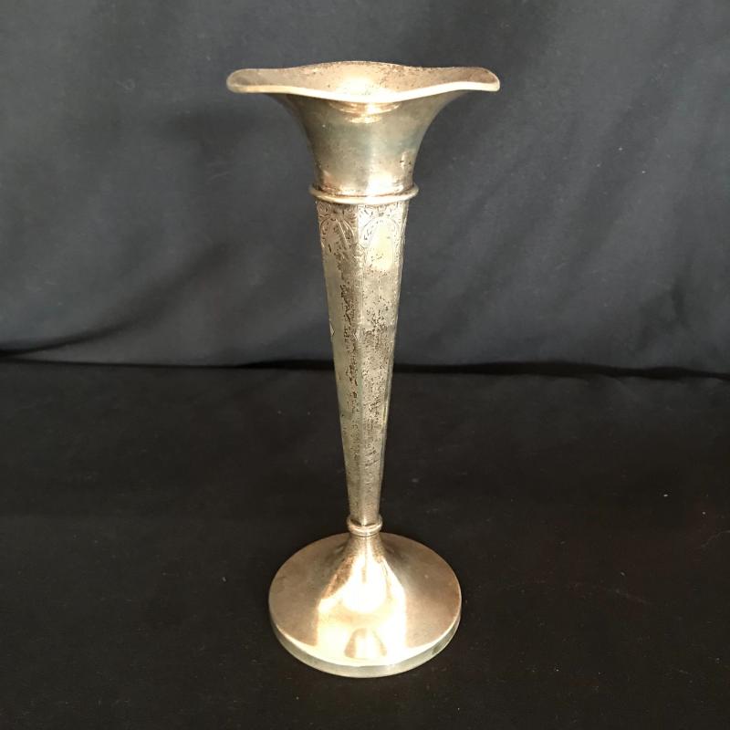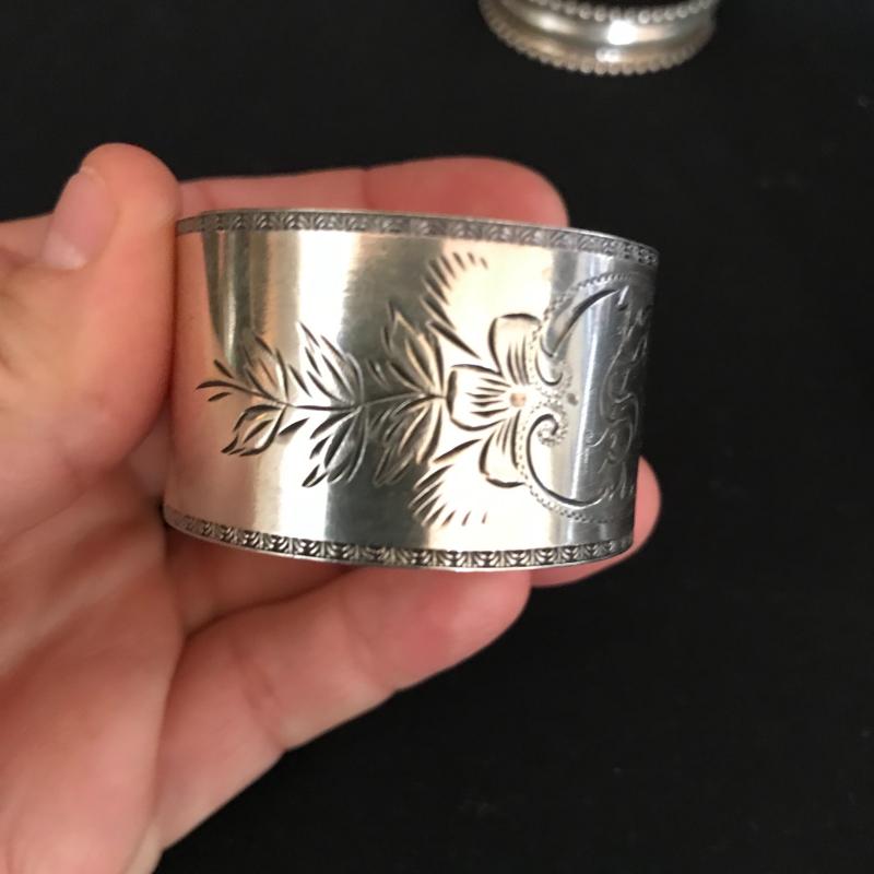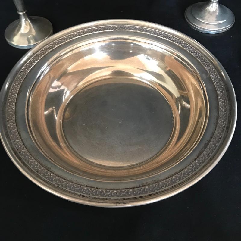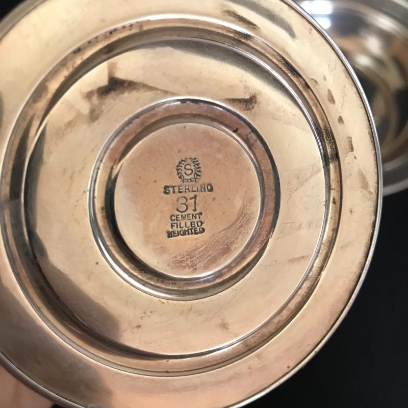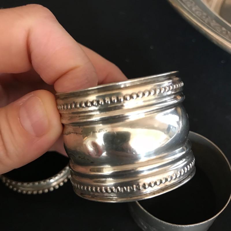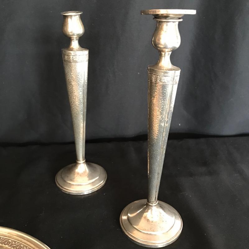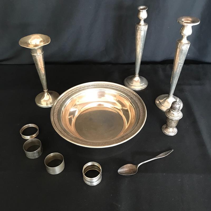 Ten pieces of Sterling Silver in various styles. Three candlesticks, one salt shaker, four napkin rings, one spoon, and one lovely bowl. Shipping available. Starting price is near melt value.