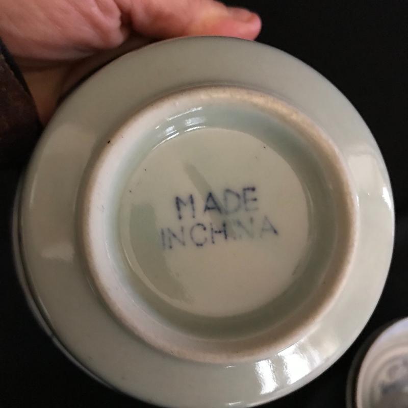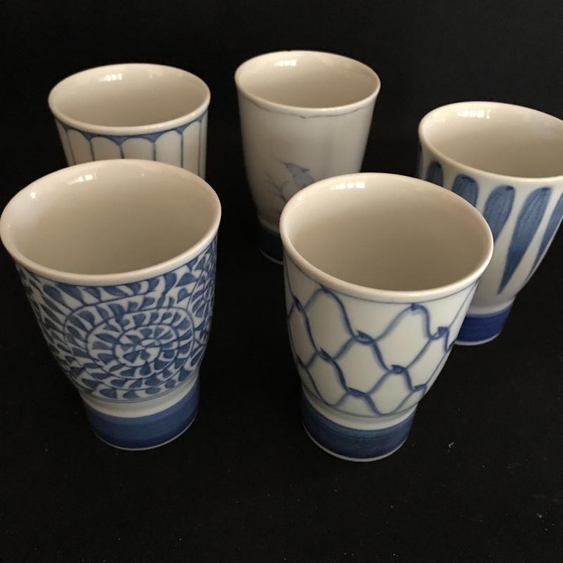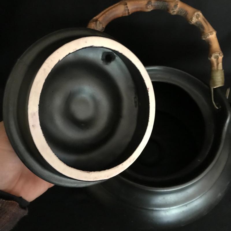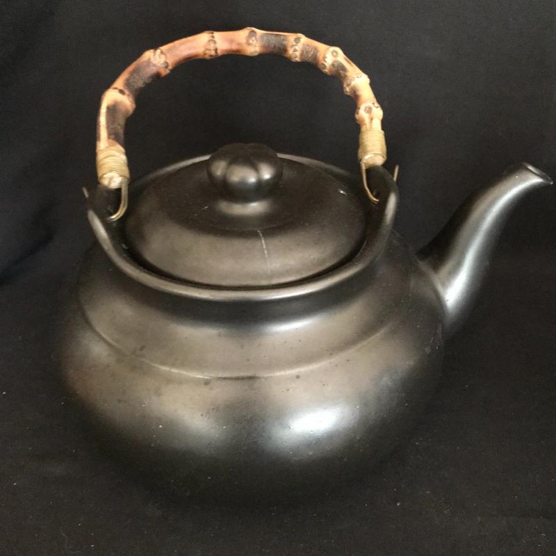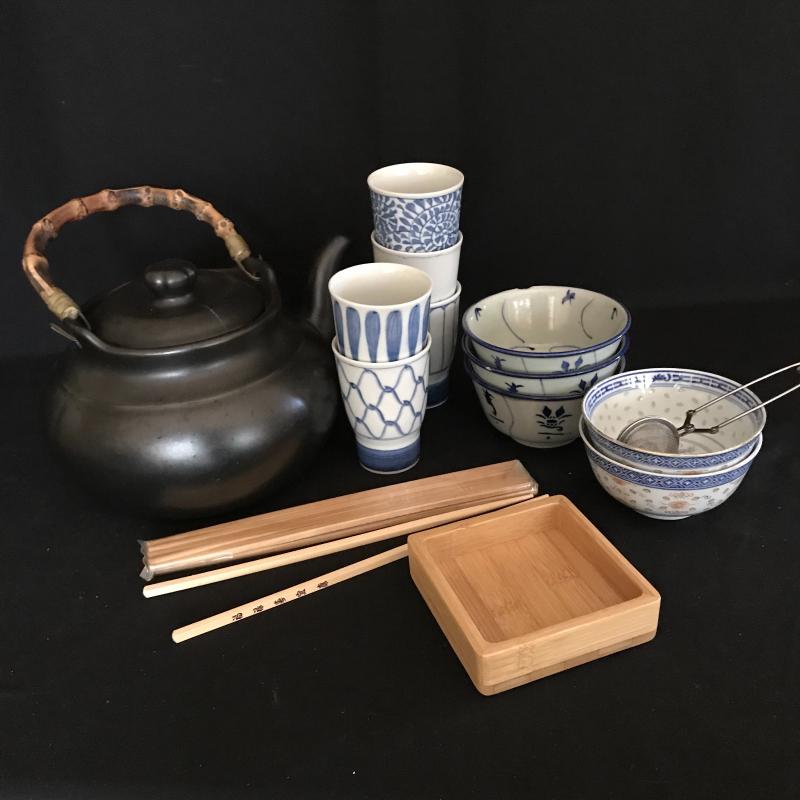This lot includes black ceramic teapot (usable on stove tops), five blue and white tea cups, five bowls, 6 pairs of chopsticks, and a tea strainer. Teapot is approx. 10.5 tall including bamboo handle.