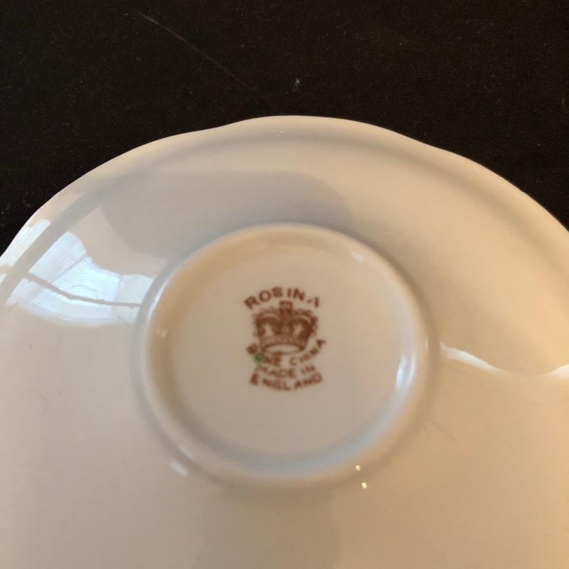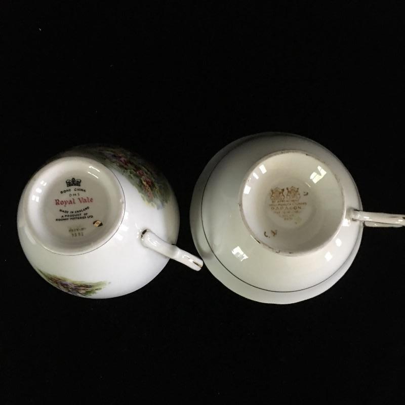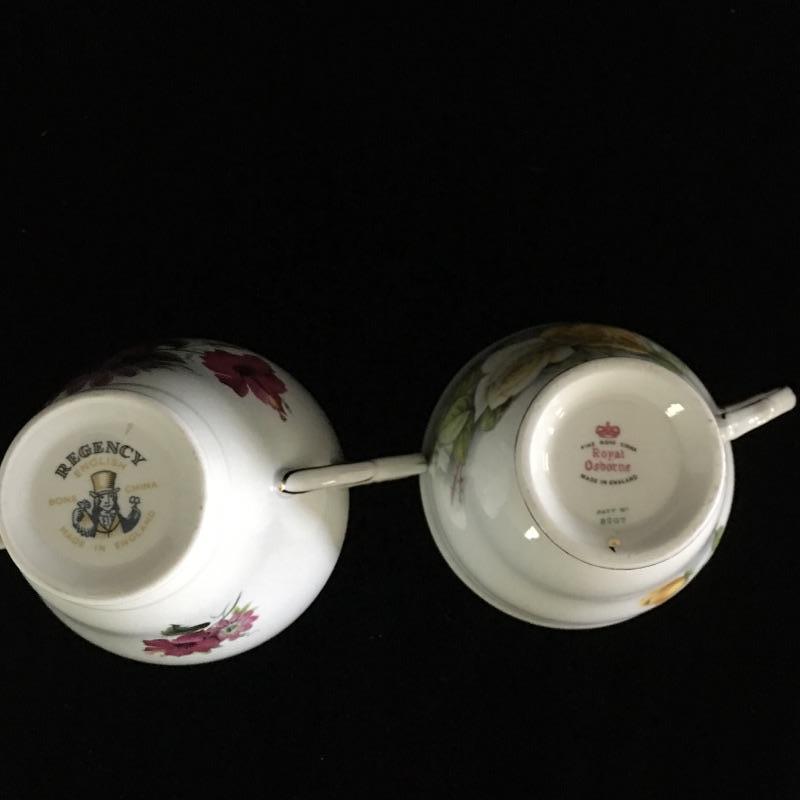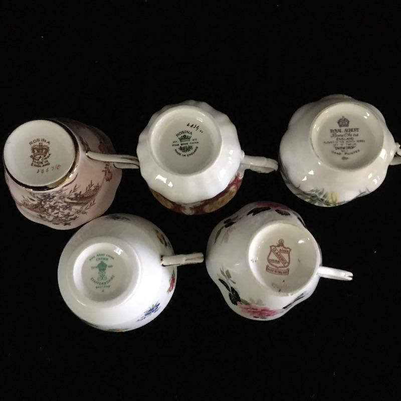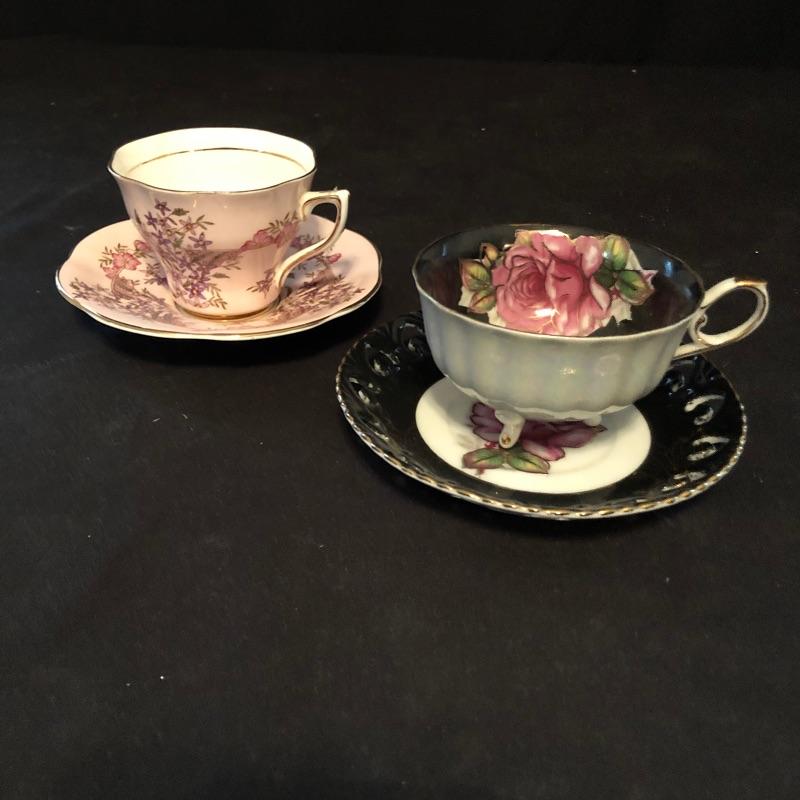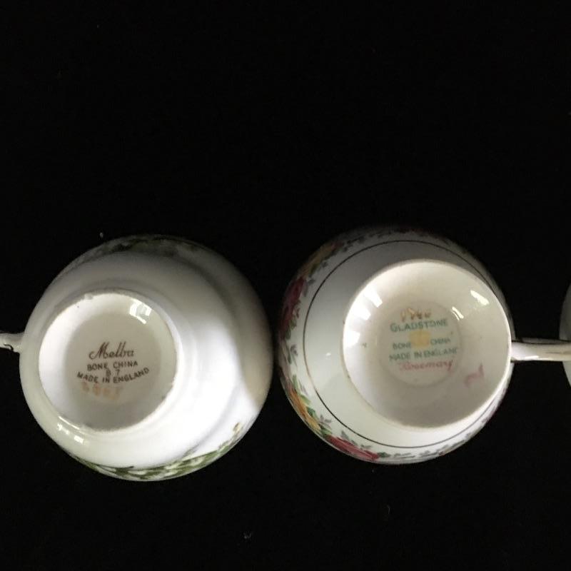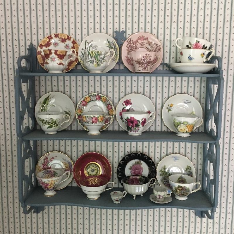 Lovely teacup collection with thirteen matching teacups and saucers by Robina, Robin Vale, Melba and more. Lot also includes two shelves for display. The unpainted shelves are made to be hung on a wall at an angle.