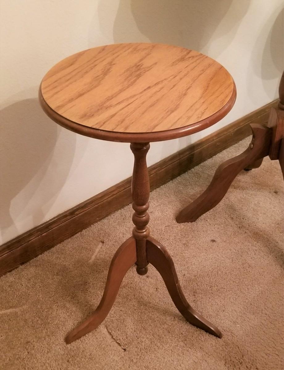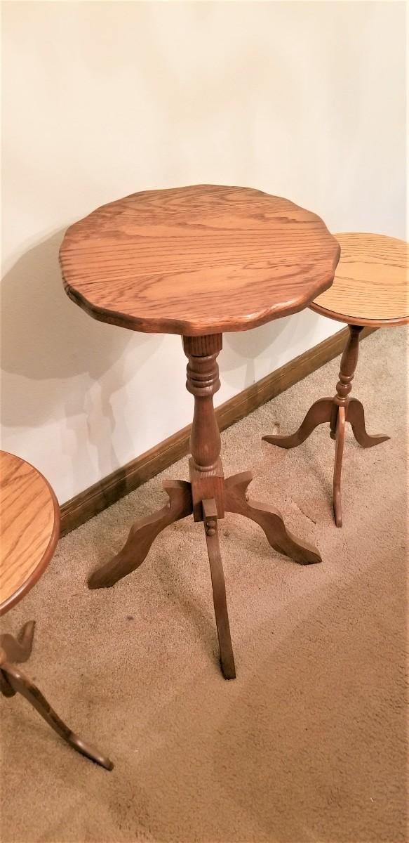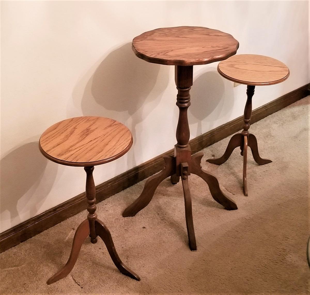 Three contemporary pedestal tables - fern/plant stands. Large one is solid wood - smaller ones are composite/particle board. Largest is 29.5" tall, 14.5" across. Smaller ones are 21" tall. All in good condition.