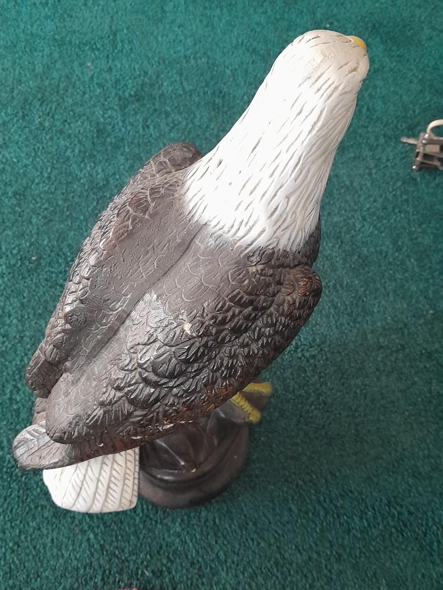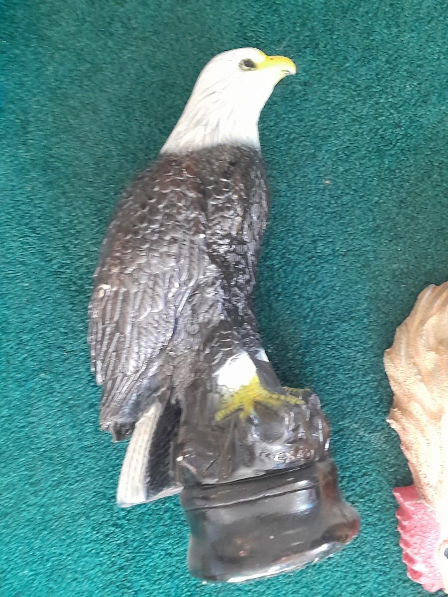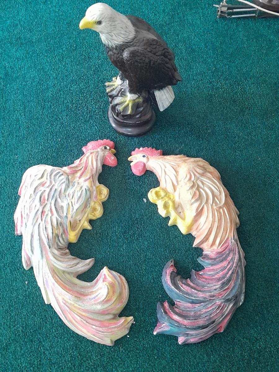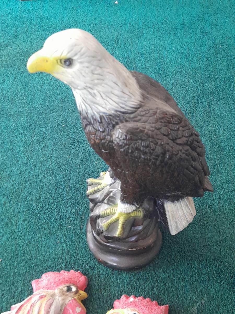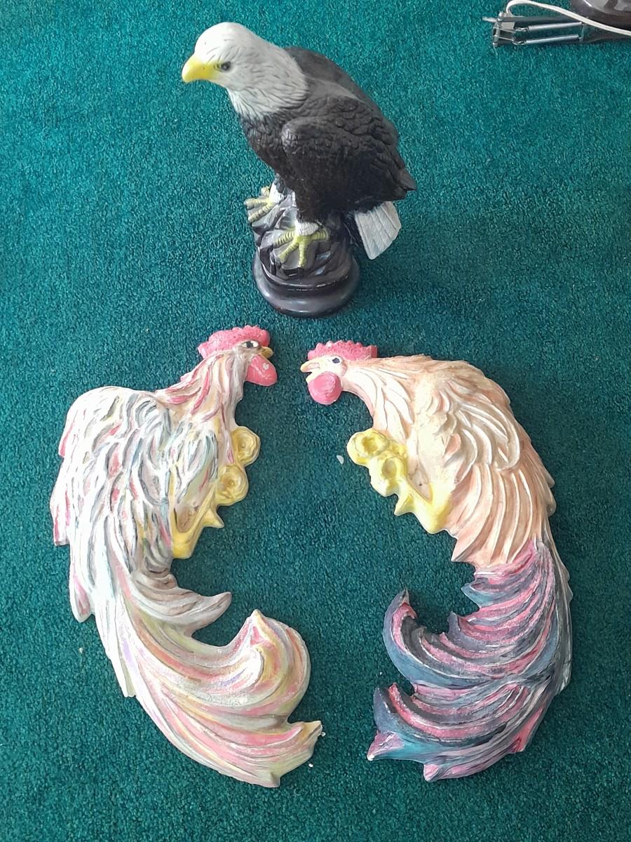 TWO CHALKWARE ROOSTERS, AND AN EAGLE STATUE 19"