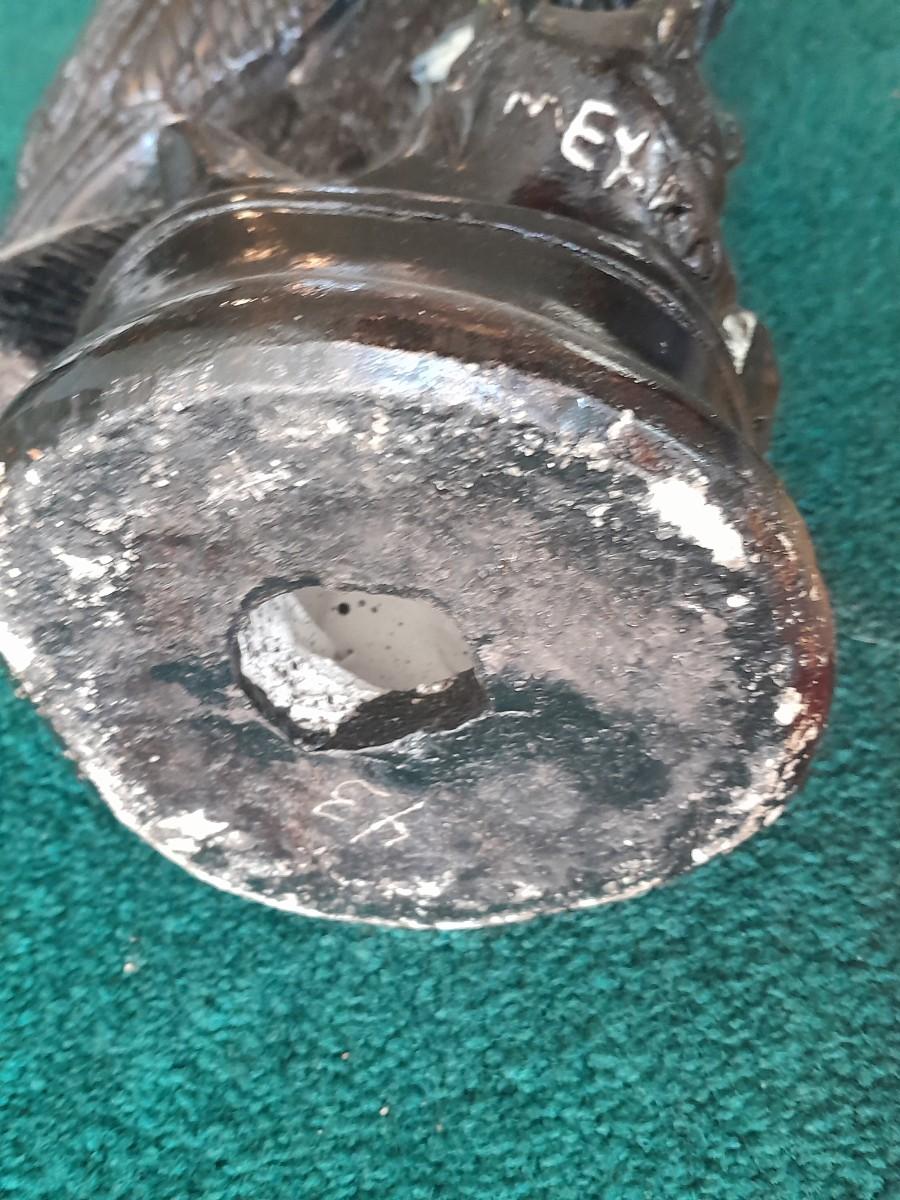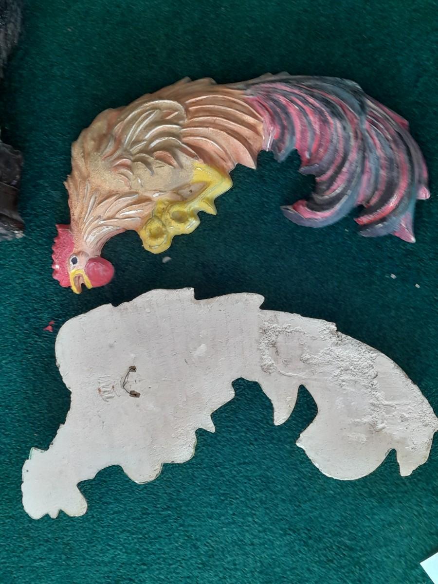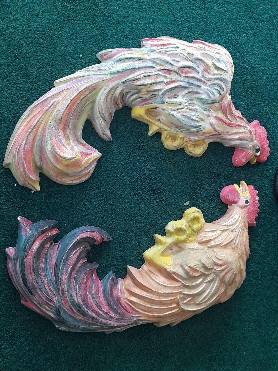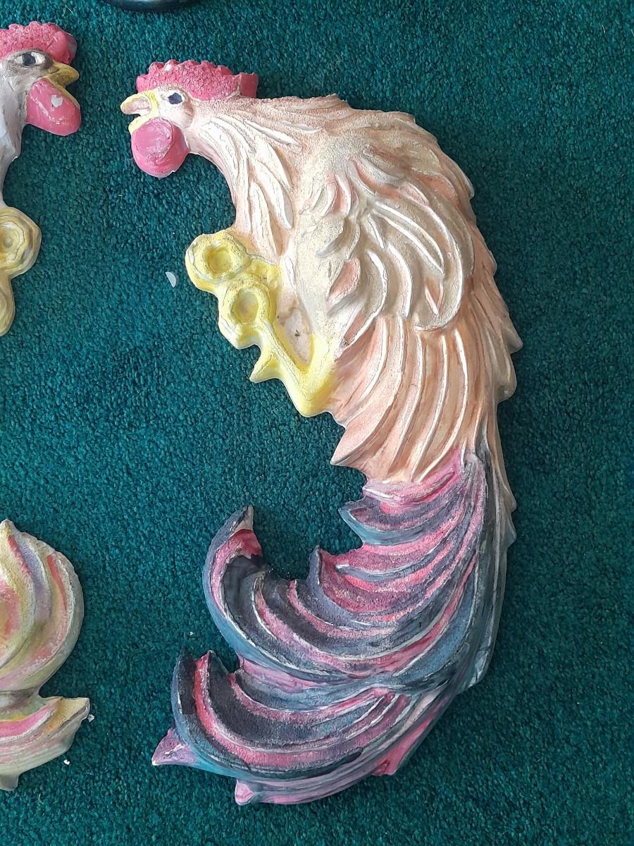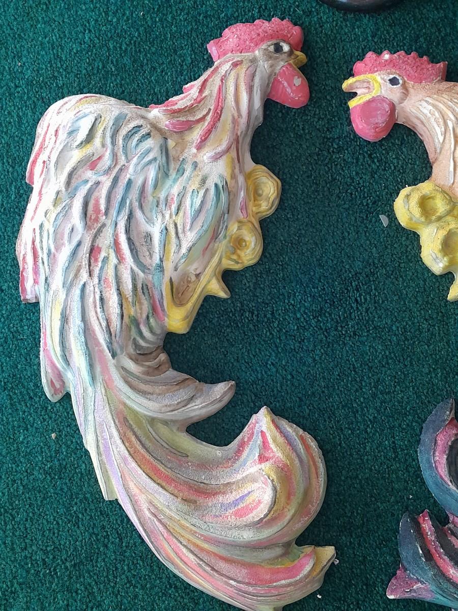TWO CHALKWARE ROOSTERS, AND AN EAGLE STATUE 19"