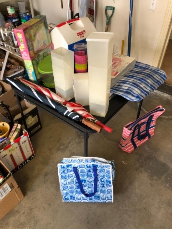 Lot 78. Two golf umbrellas, plastic containers, coolers, refrigerator plastic storage, cooler set,  insulated bags, flip flops size 10, etc.--WAS $35““NOW $17.50