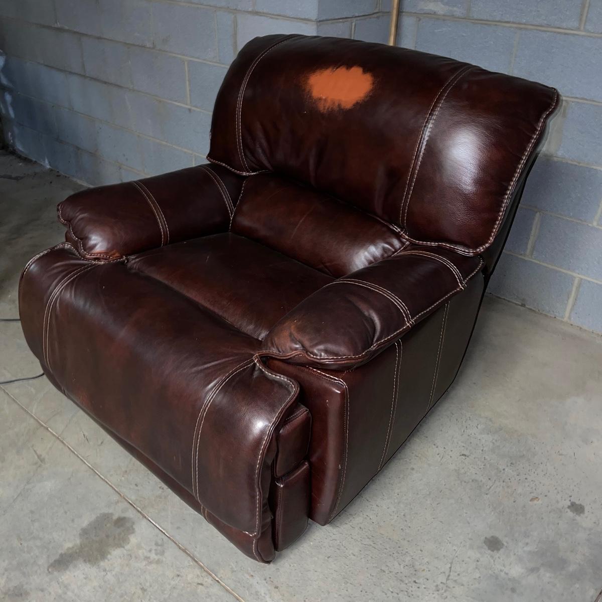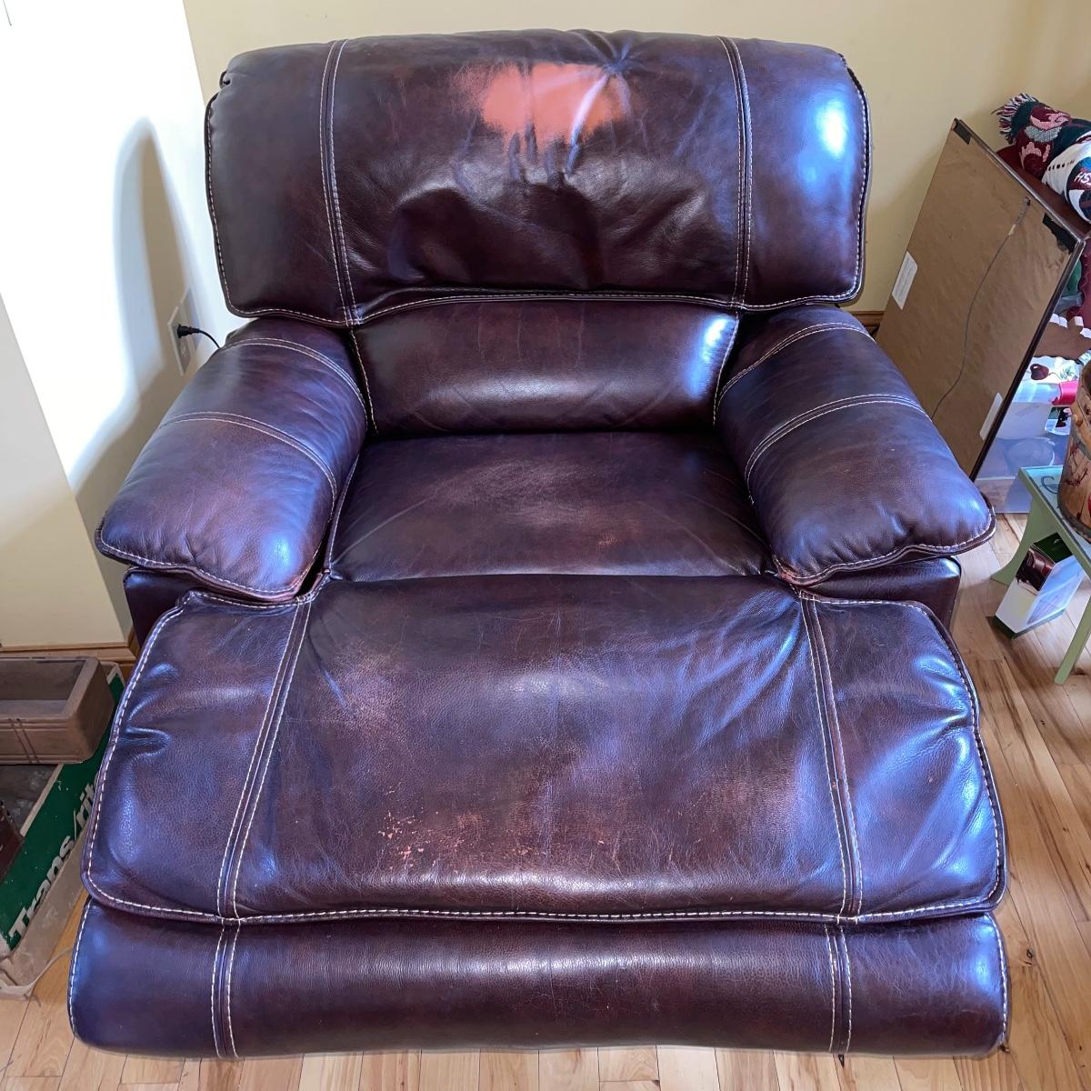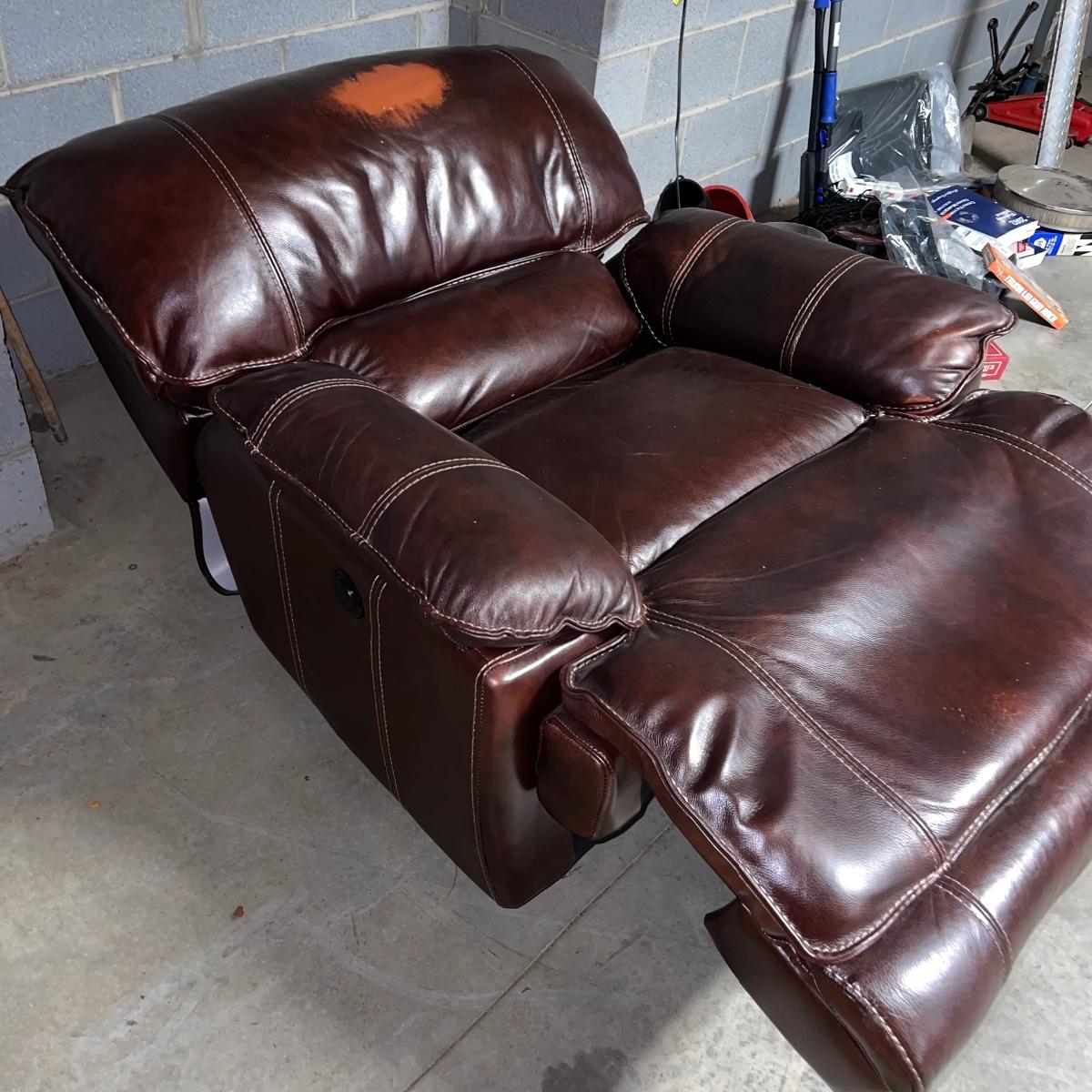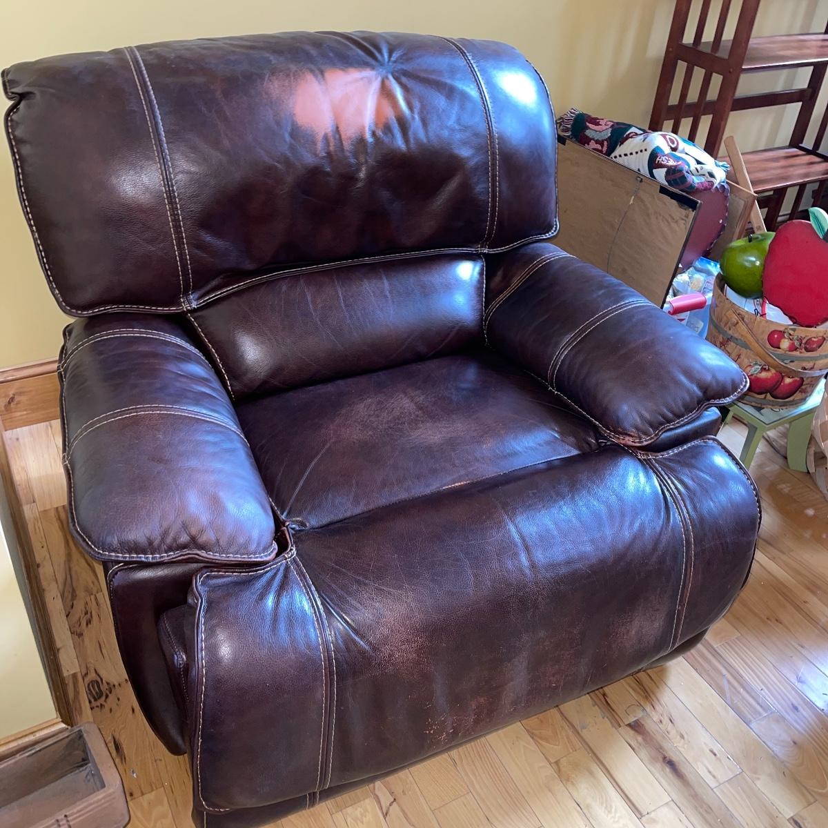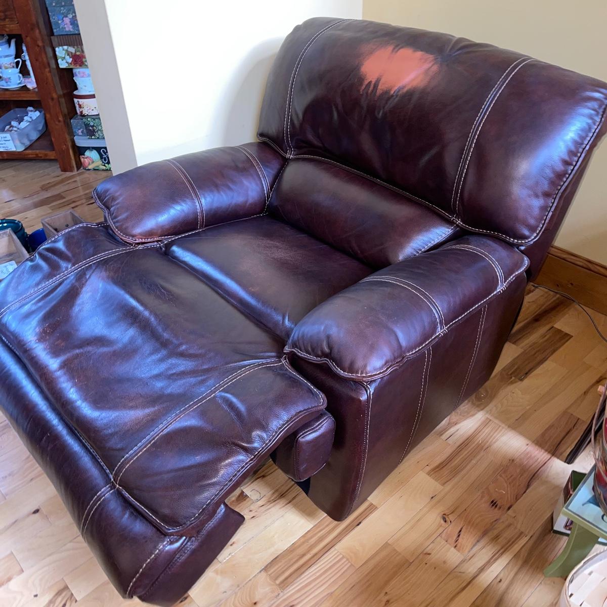 These comfy leather-like recliners are the perfect addition to any living space. At 45” x 43” x 40” when in upright position, these chairs are size able and are ideal for relaxing, reading, or anything in between. When reclined fully, they are just under 70” from the top of the headrest to the base of the foot rest. They are not too heavy, just bulky. The soft leather-like upholstery is easy to clean and has a very mild texture. Grab a book or a good show and start reclining!