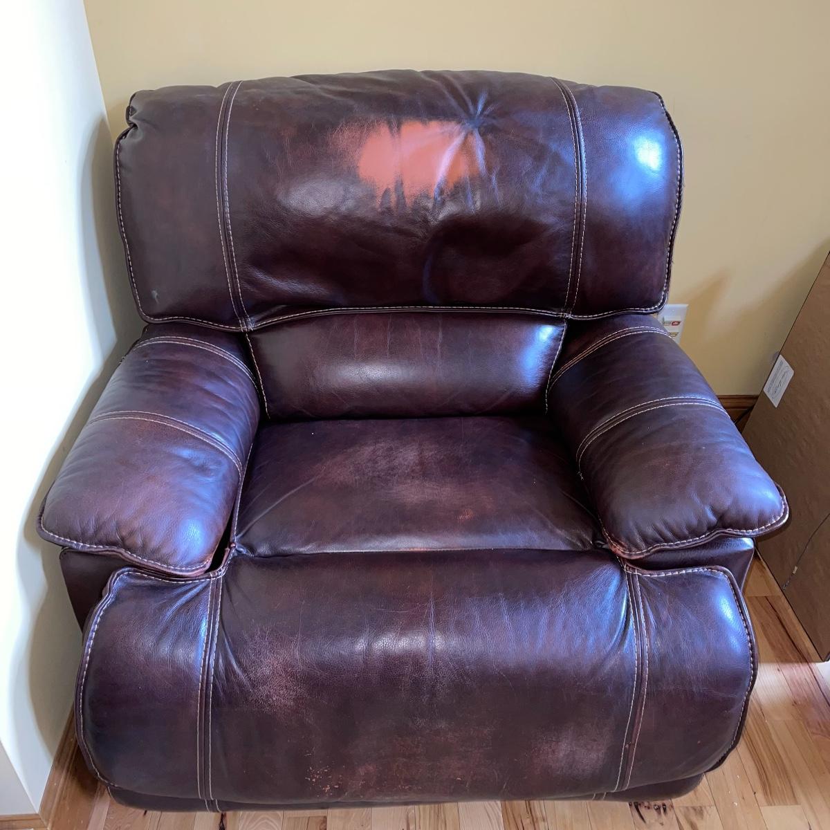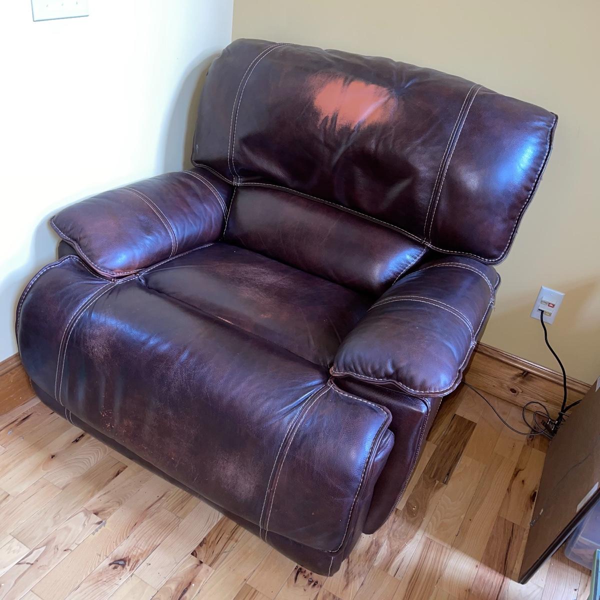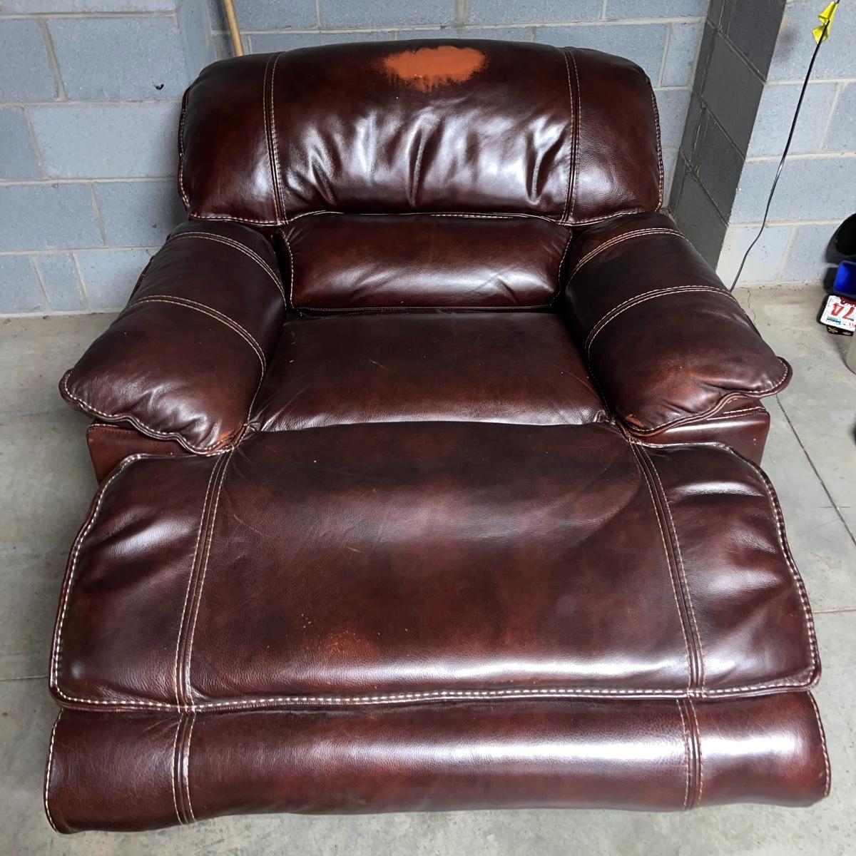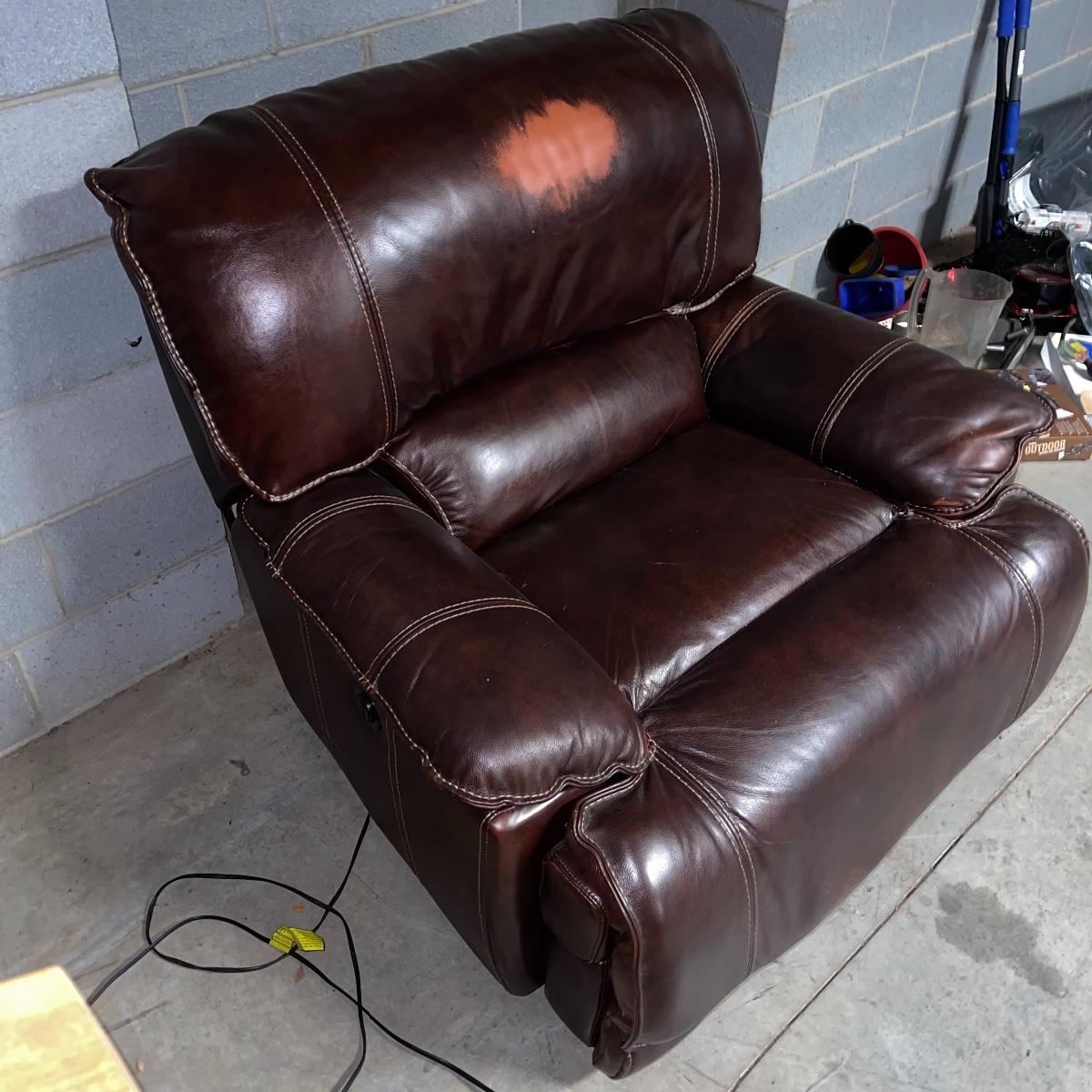 These comfy leather-like recliners are the perfect addition to any living space. At 45” x 43” x 40” when in upright position, these chairs are size able and are ideal for relaxing, reading, or anything in between. When reclined fully, they are just under 70” from the top of the headrest to the base of the foot rest. They are not too heavy, just bulky. The soft leather-like upholstery is easy to clean and has a very mild texture. Grab a book or a good show and start reclining!