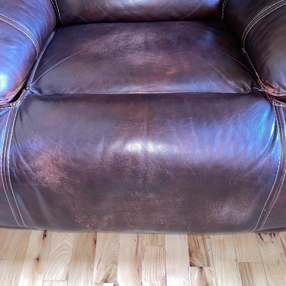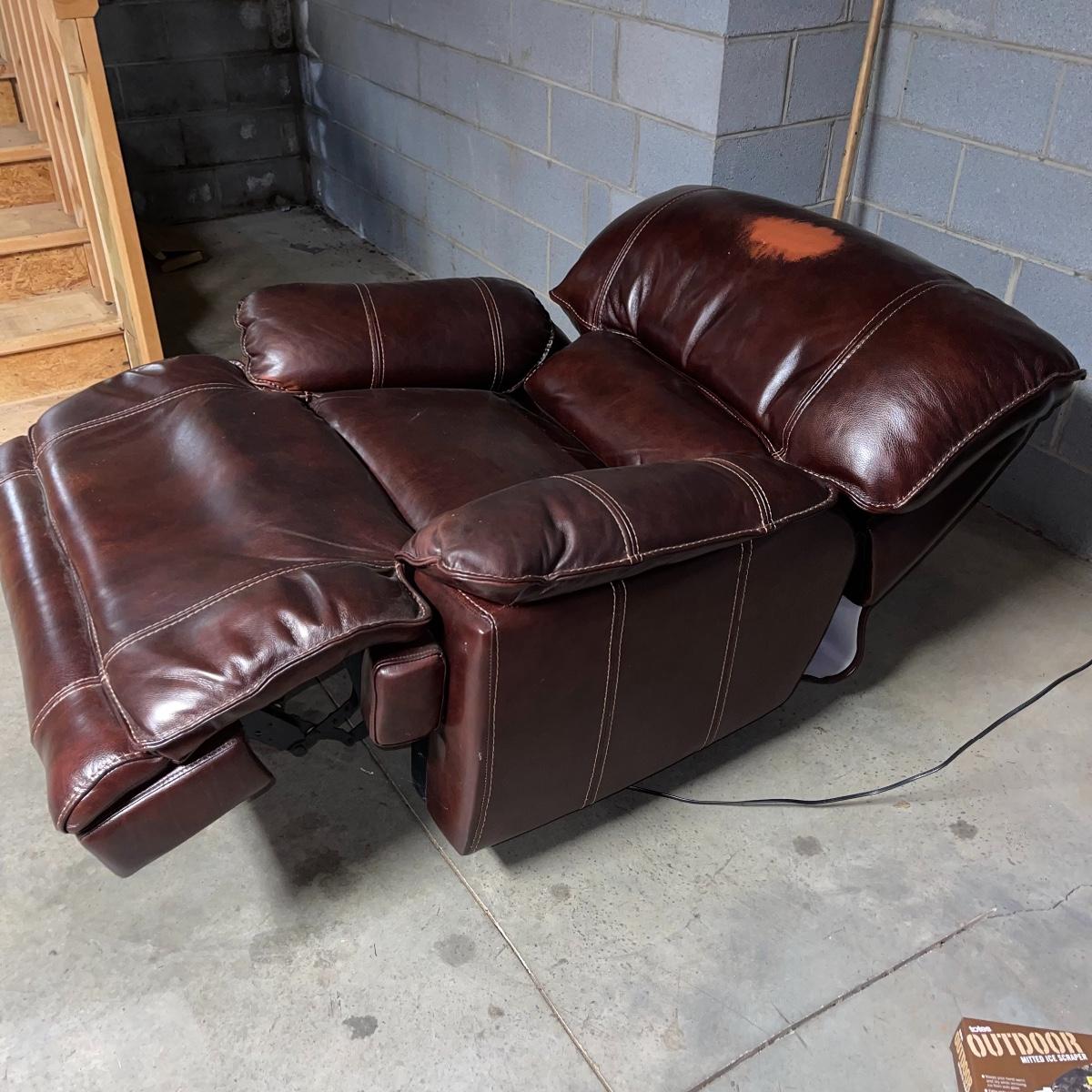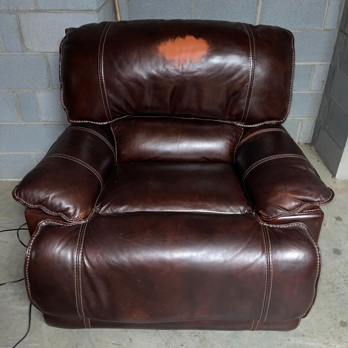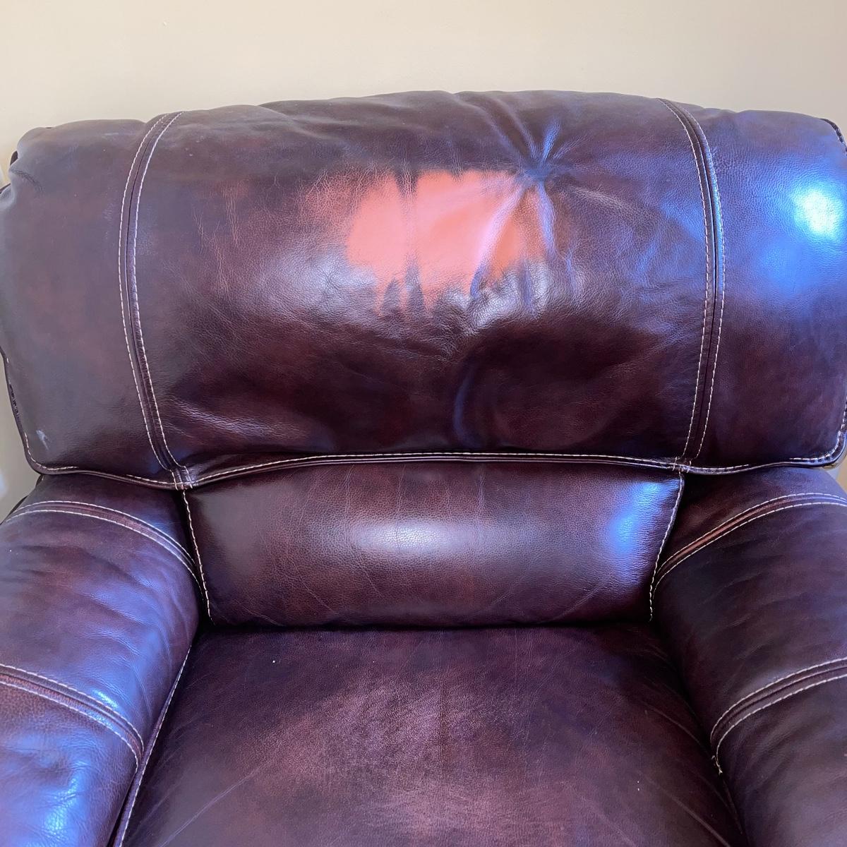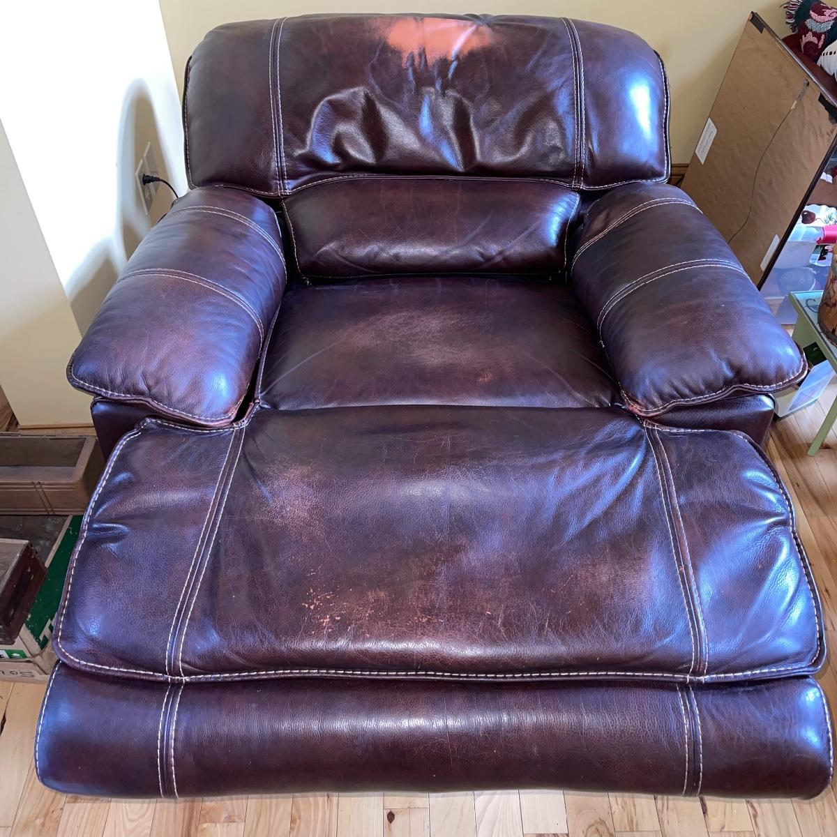 These comfy leather-like recliners are the perfect addition to any living space. At 45” x 43” x 40” when in upright position, these chairs are size able and are ideal for relaxing, reading, or anything in between. When reclined fully, they are just under 70” from the top of the headrest to the base of the foot rest. They are not too heavy, just bulky. The soft leather-like upholstery is easy to clean and has a very mild texture. Grab a book or a good show and start reclining!