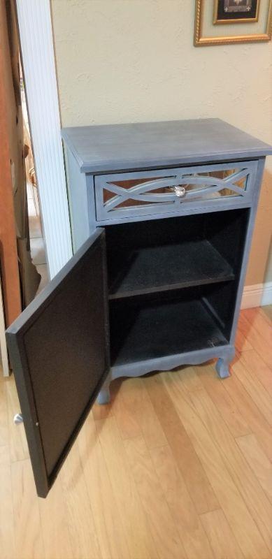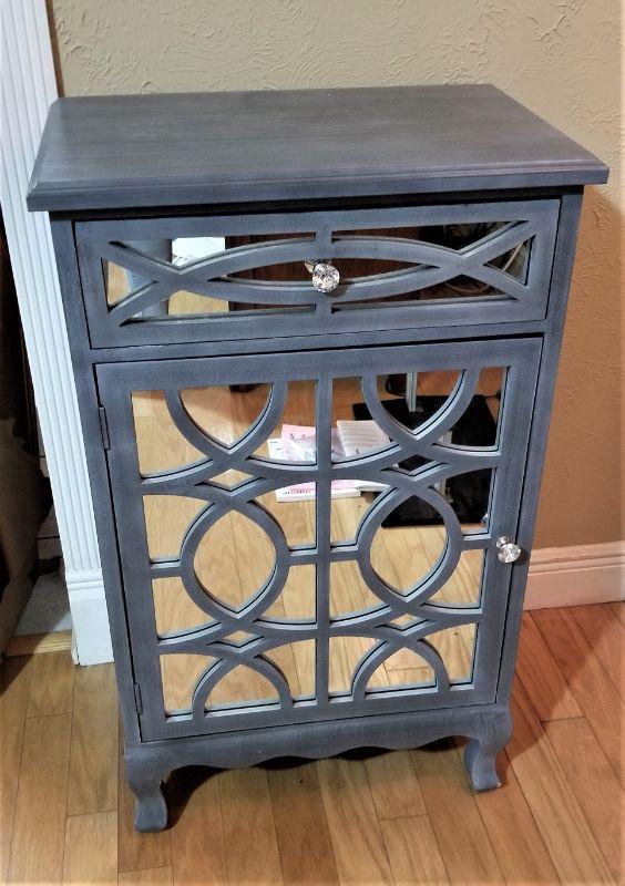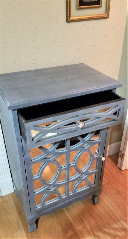 Love the look AND the color - very cute contemporary mirrored cabinet with drawer. Measures 23" across, 15" deep, 37.5" tall. Good condition. Glass knobs.