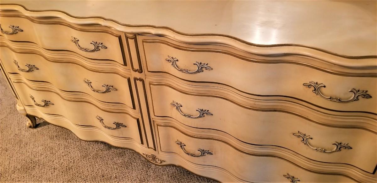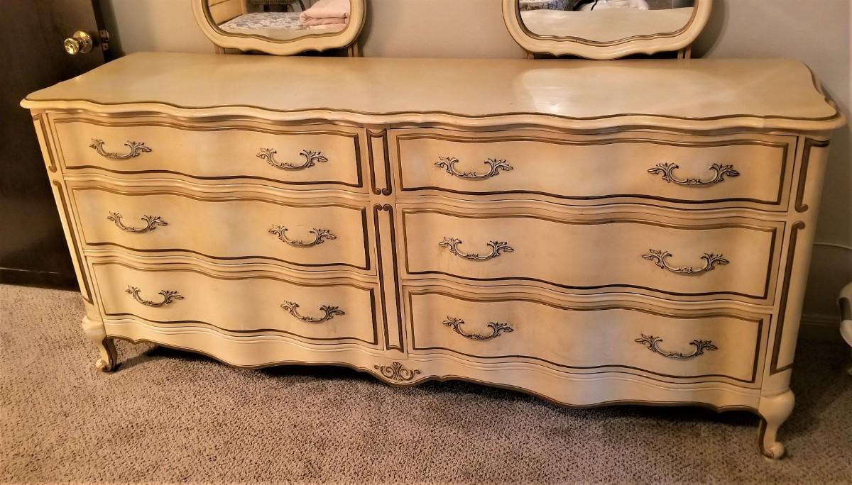Vintage French Provincial Style bedroom dresser, six drawers, 2 mirrors. Mirrors can be removed. 21" deep, 33" tall (not counting mirrors), 75" across. No maker noted. Vintage condition, usual "scuffage". Original hardware.