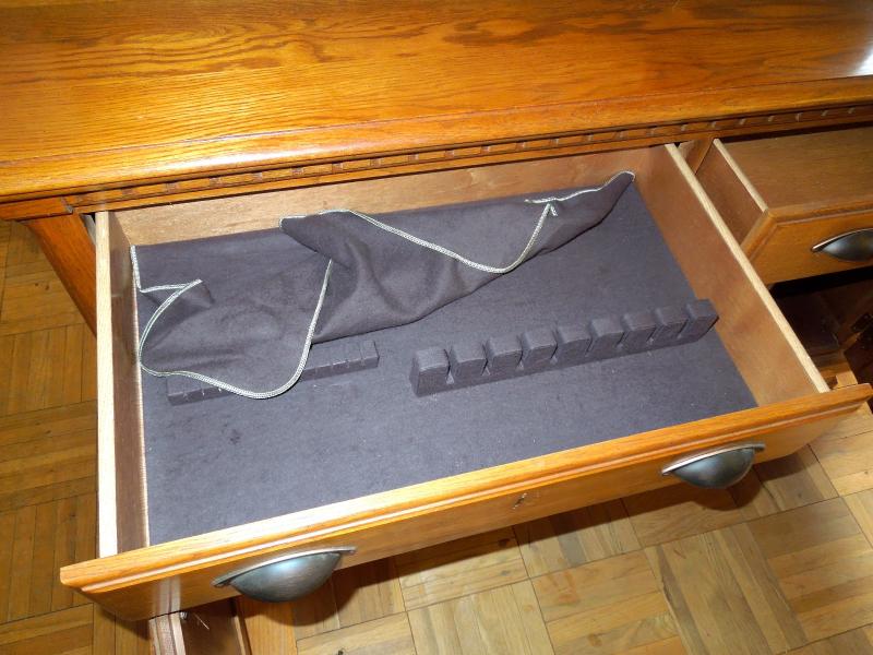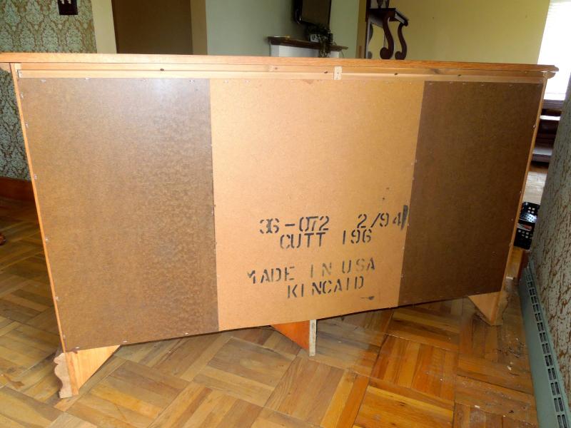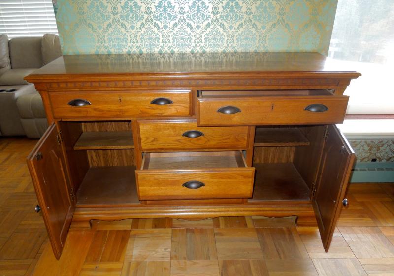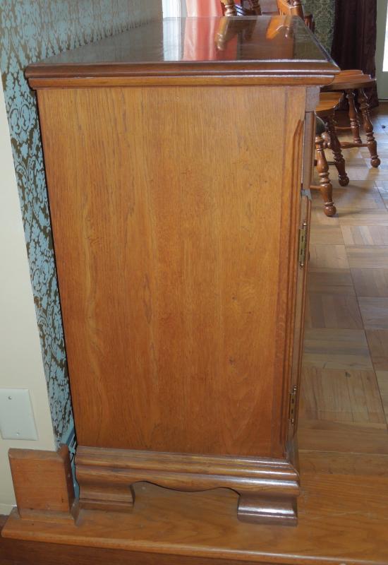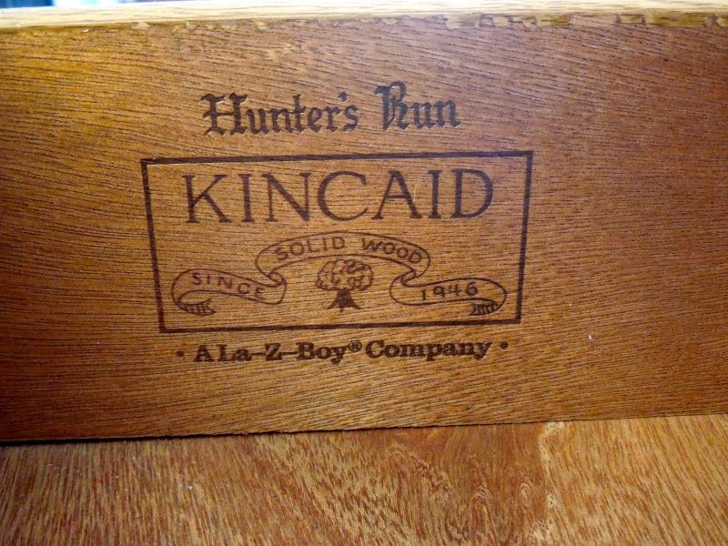 From the Kincaid "Hunter's Run" collection. Chippendale style with dentil molding and bracket feet. Has a customized drawer with tarnish free cloth for storing silverware. 5 drawers and 2 storage sections. Cherry stained oak with particle board back.