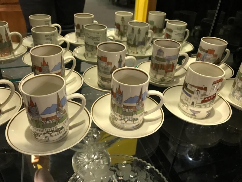 Great vintage MC set of nine unique expresso/demitasse cups and saucers. Each is gold rimmed and features a stylized hand colored cityscape of a different Eropean city.