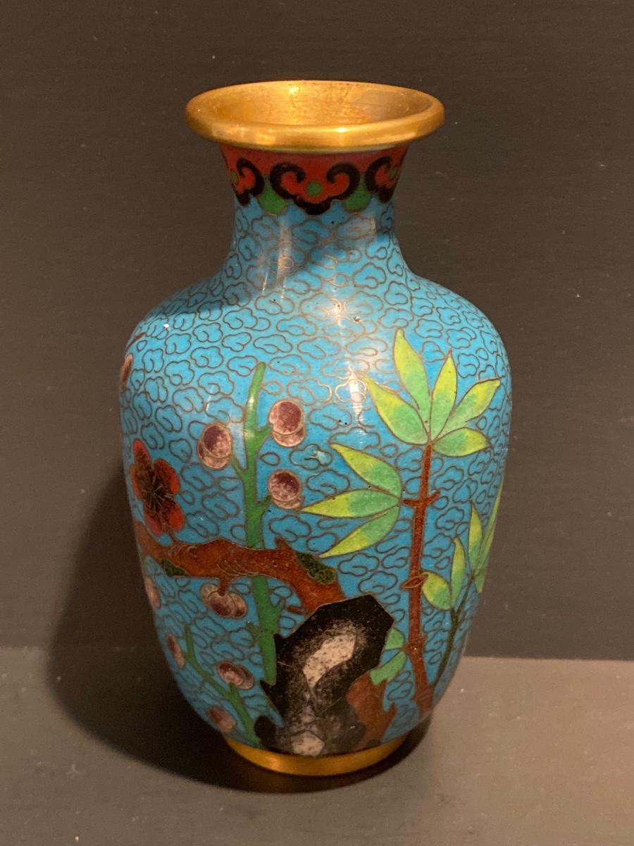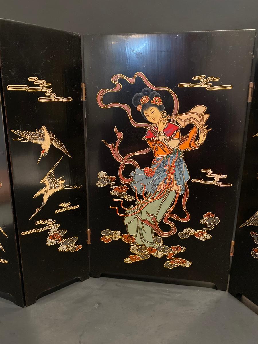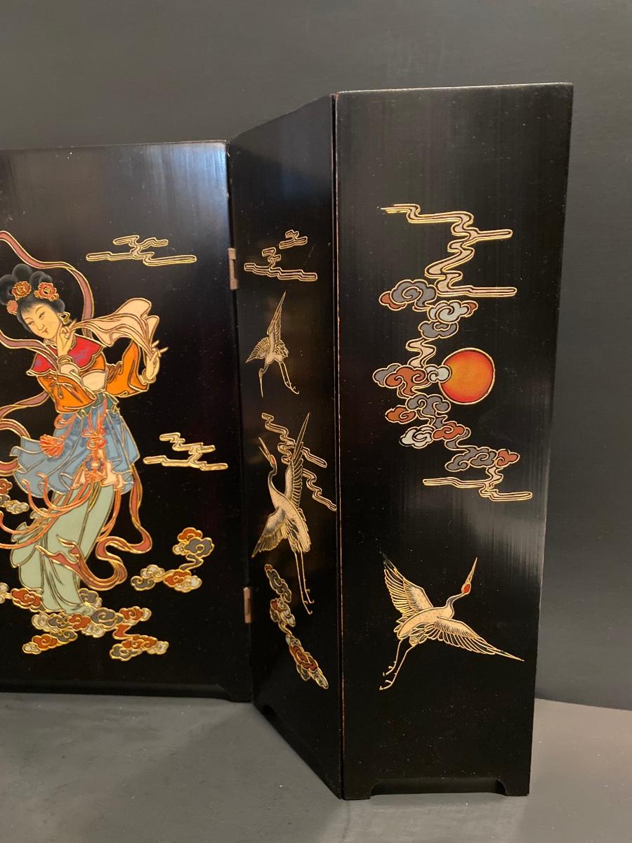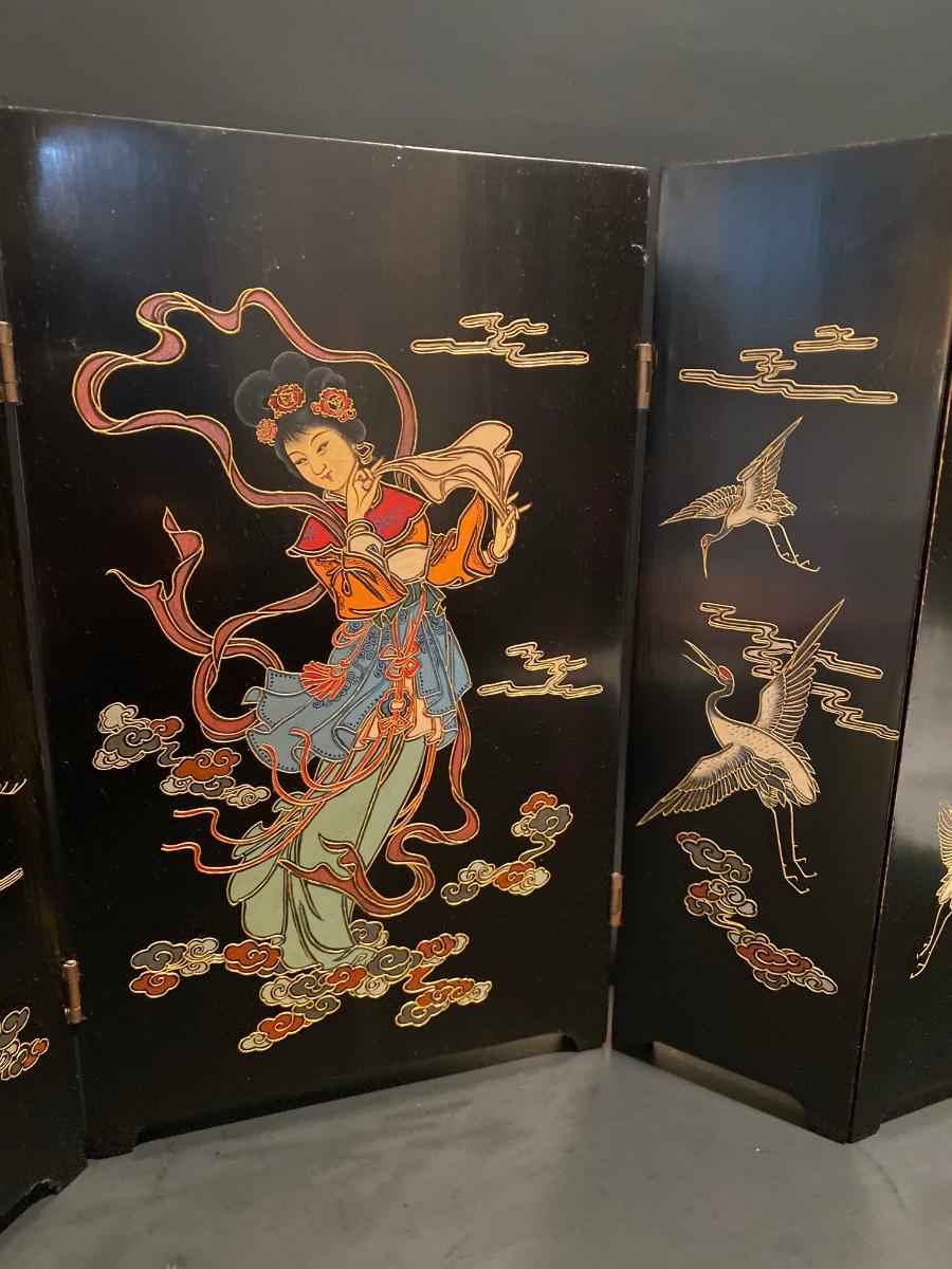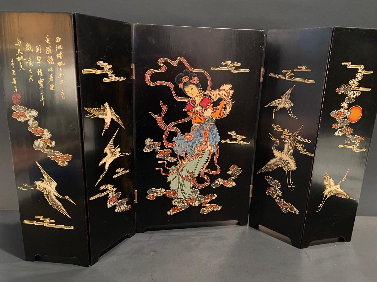 LOT 13: Asian Themed Decor: Folding Screen (12"), Blue Enamel/Brass Vase & Gold/Black Vase