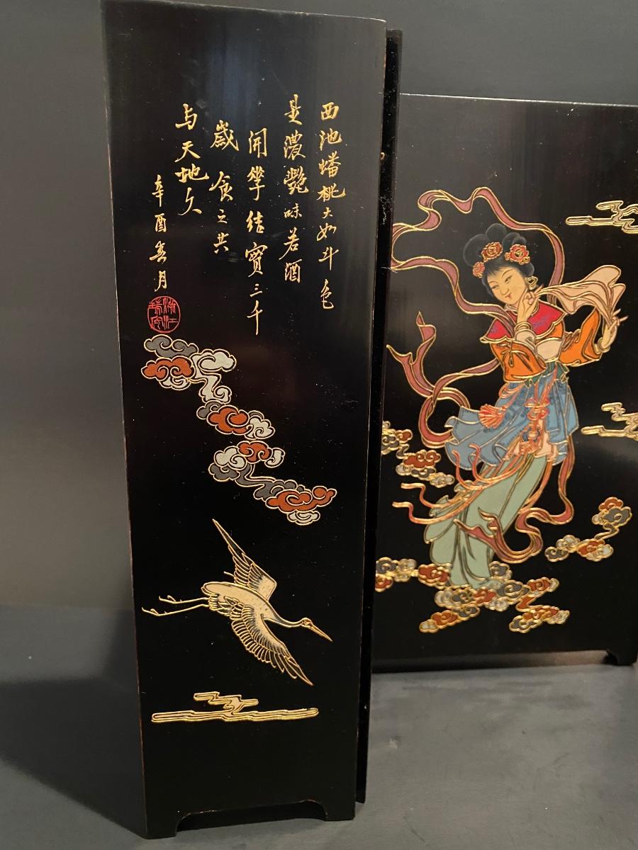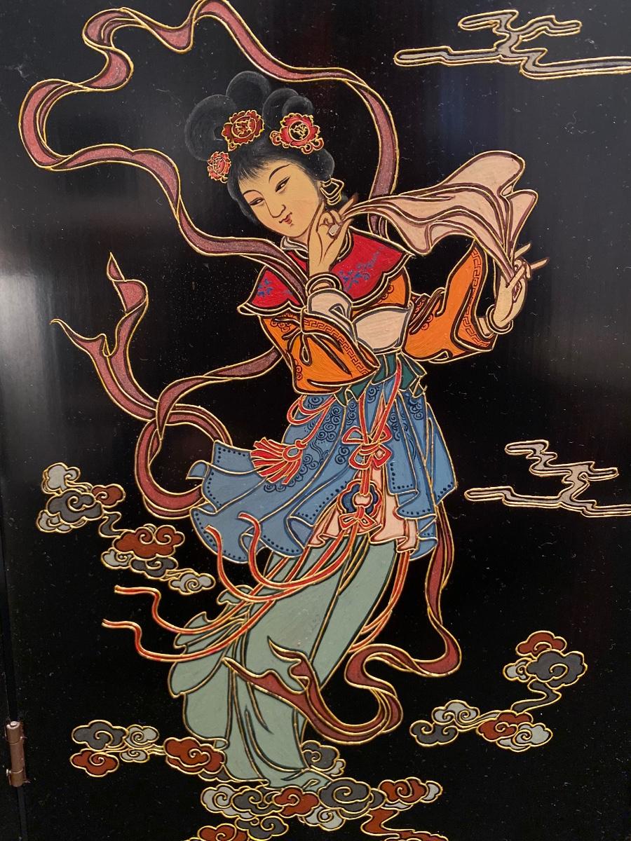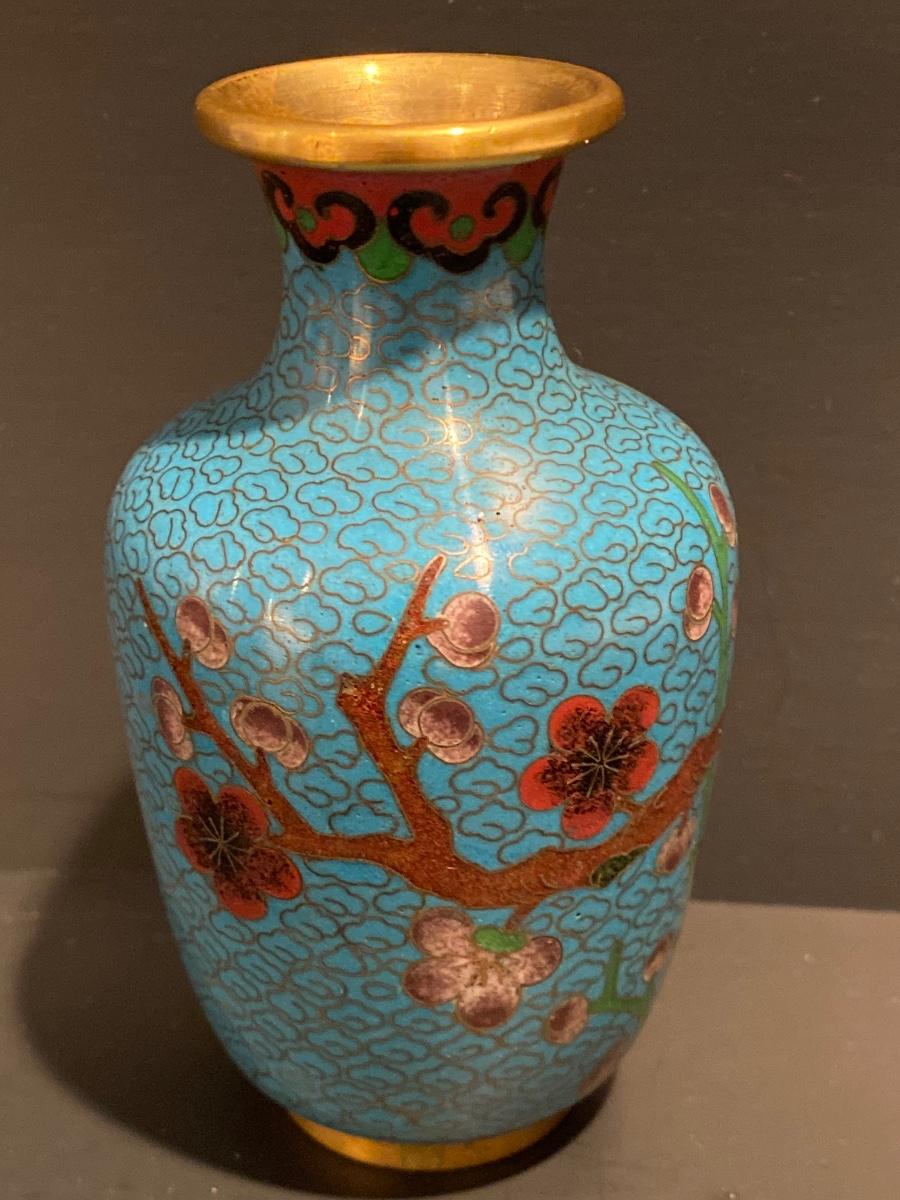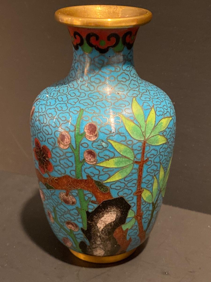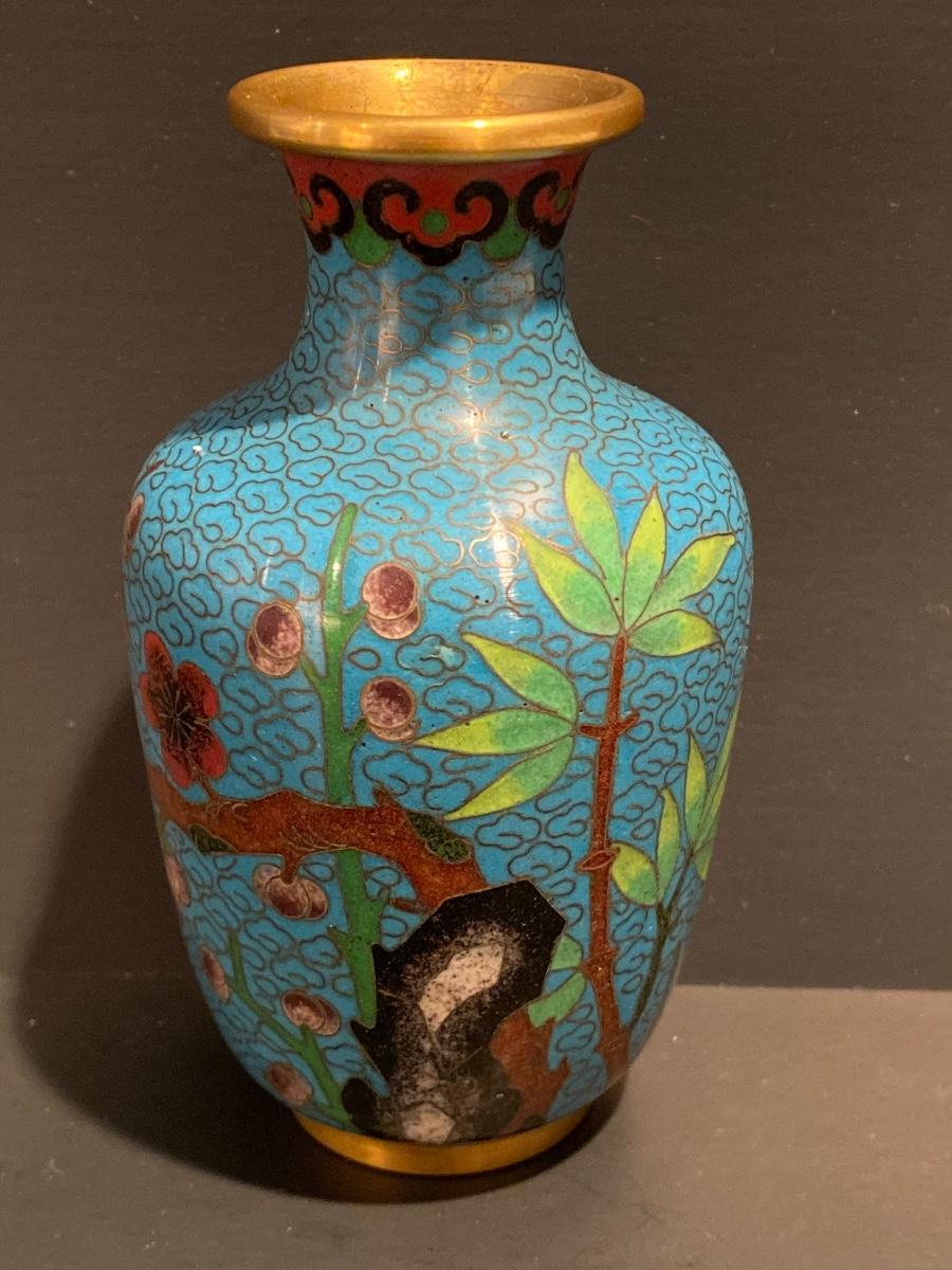 LOT 13: Asian Themed Decor: Folding Screen (12"), Blue Enamel/Brass Vase & Gold/Black Vase