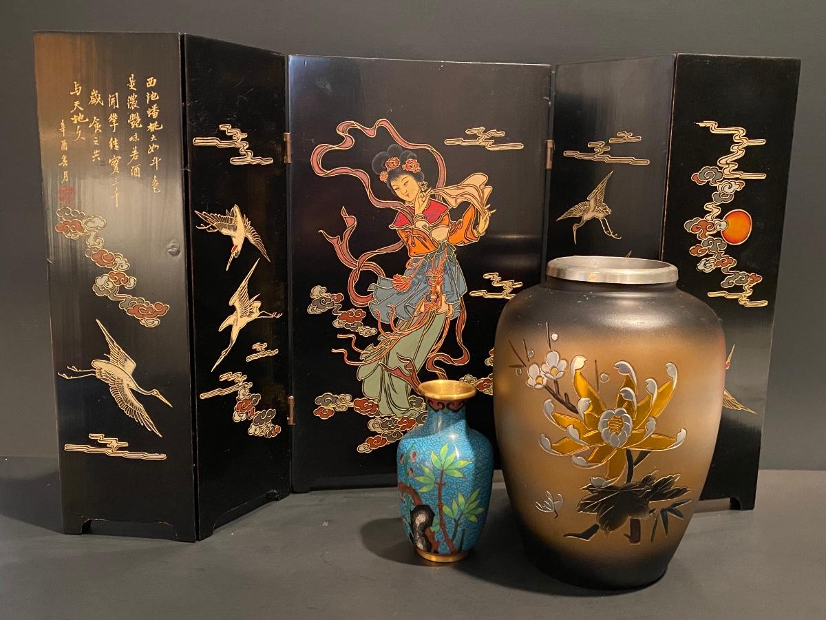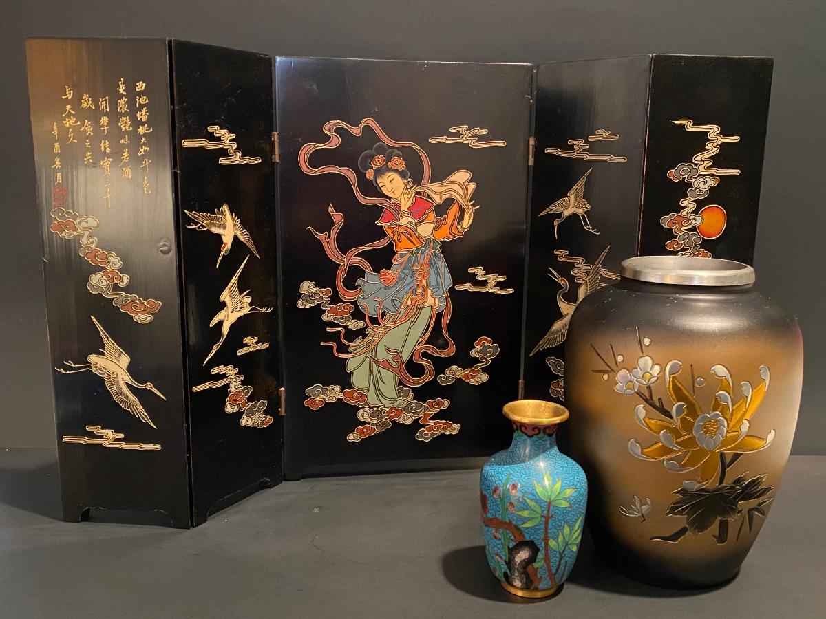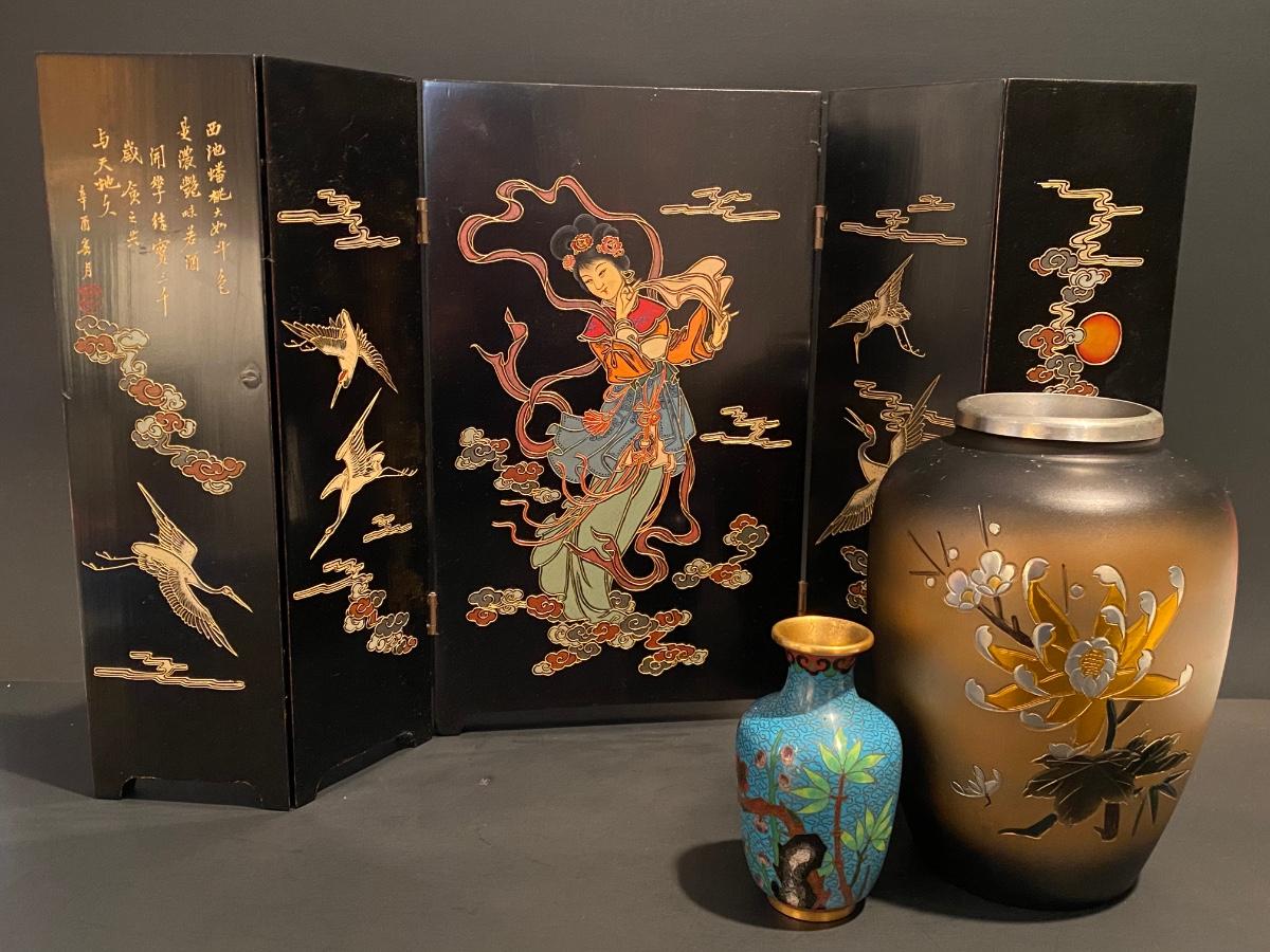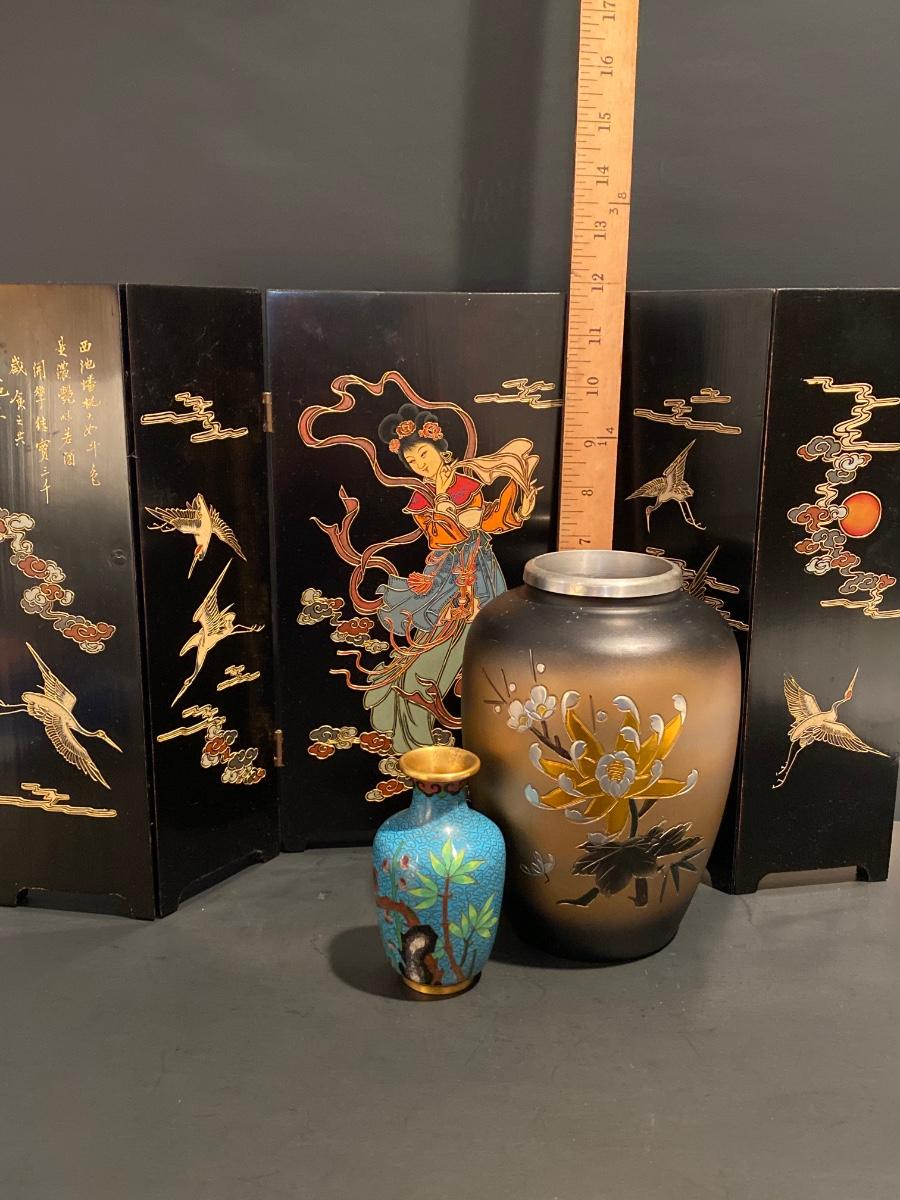 LOT 13: Asian Themed  Decor: Folding Screen (12"), Blue Enamel/Brass Vase & Gold/Black Vase
