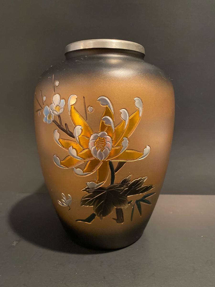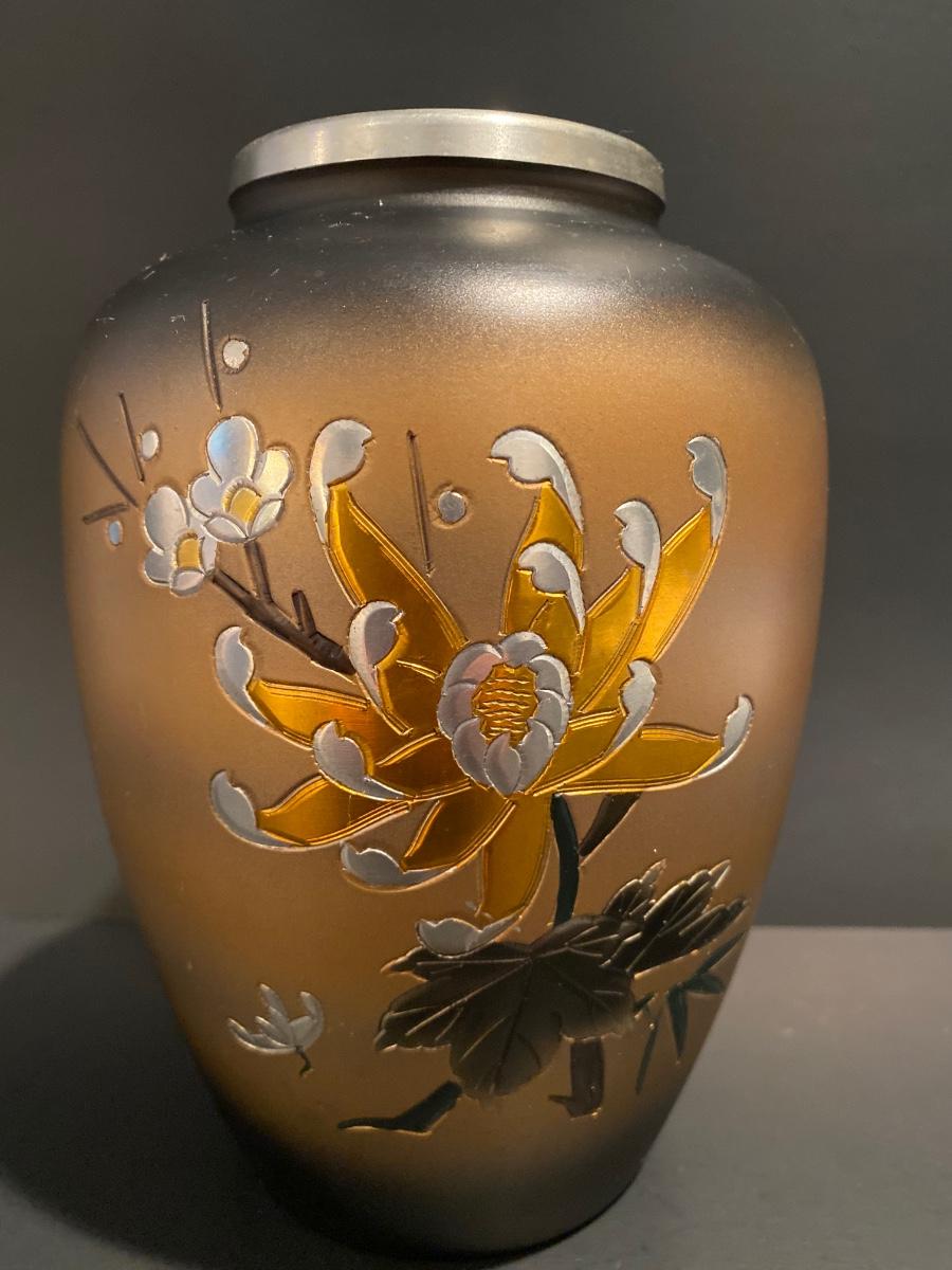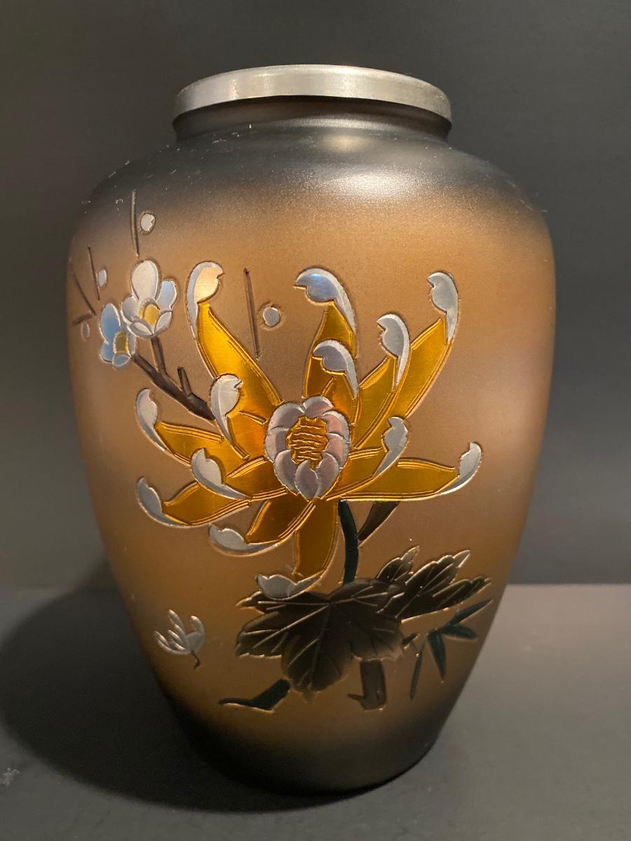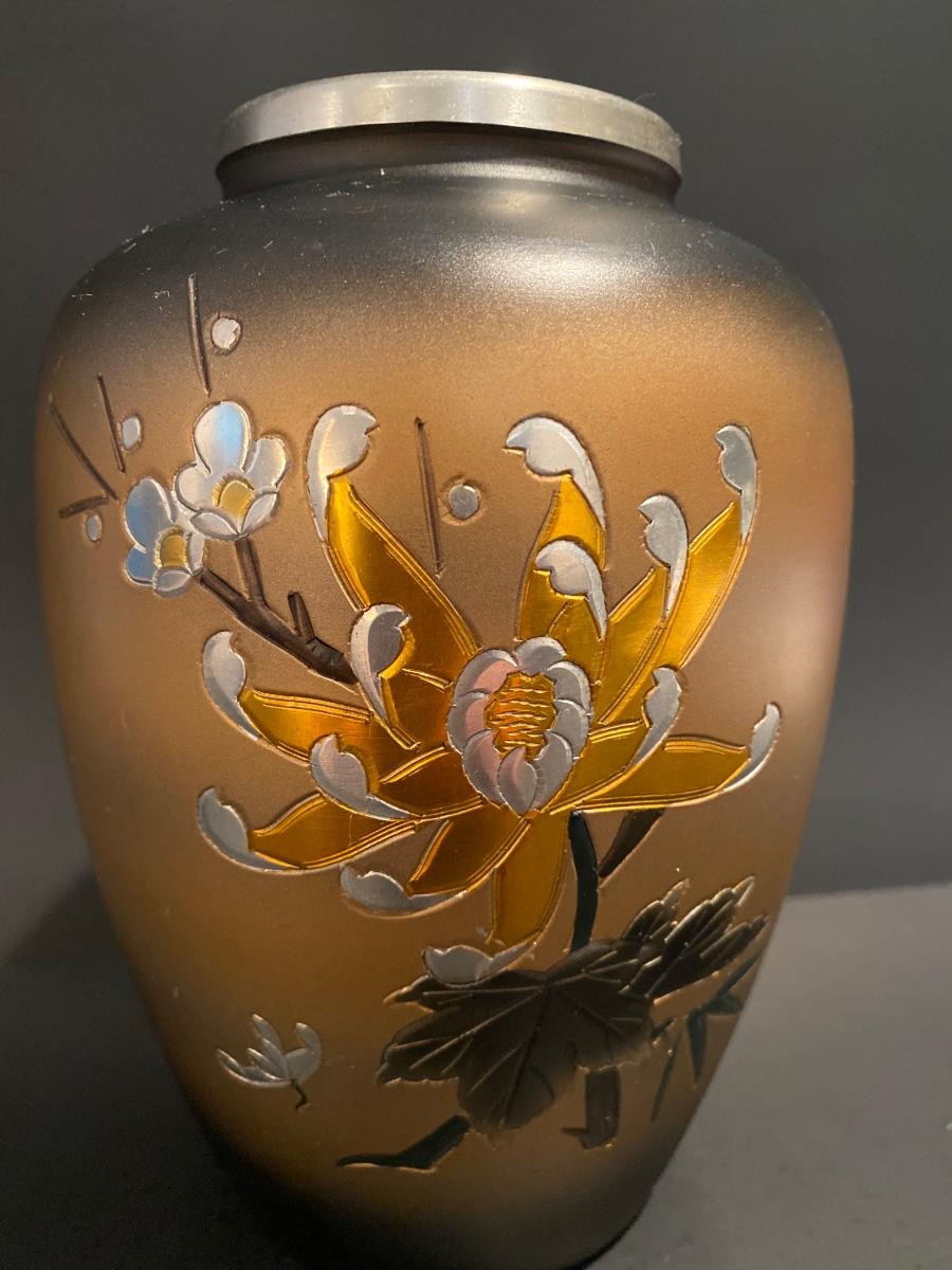 LOT 13: Asian Themed  Decor: Folding Screen (12"), Blue Enamel/Brass Vase & Gold/Black Vase