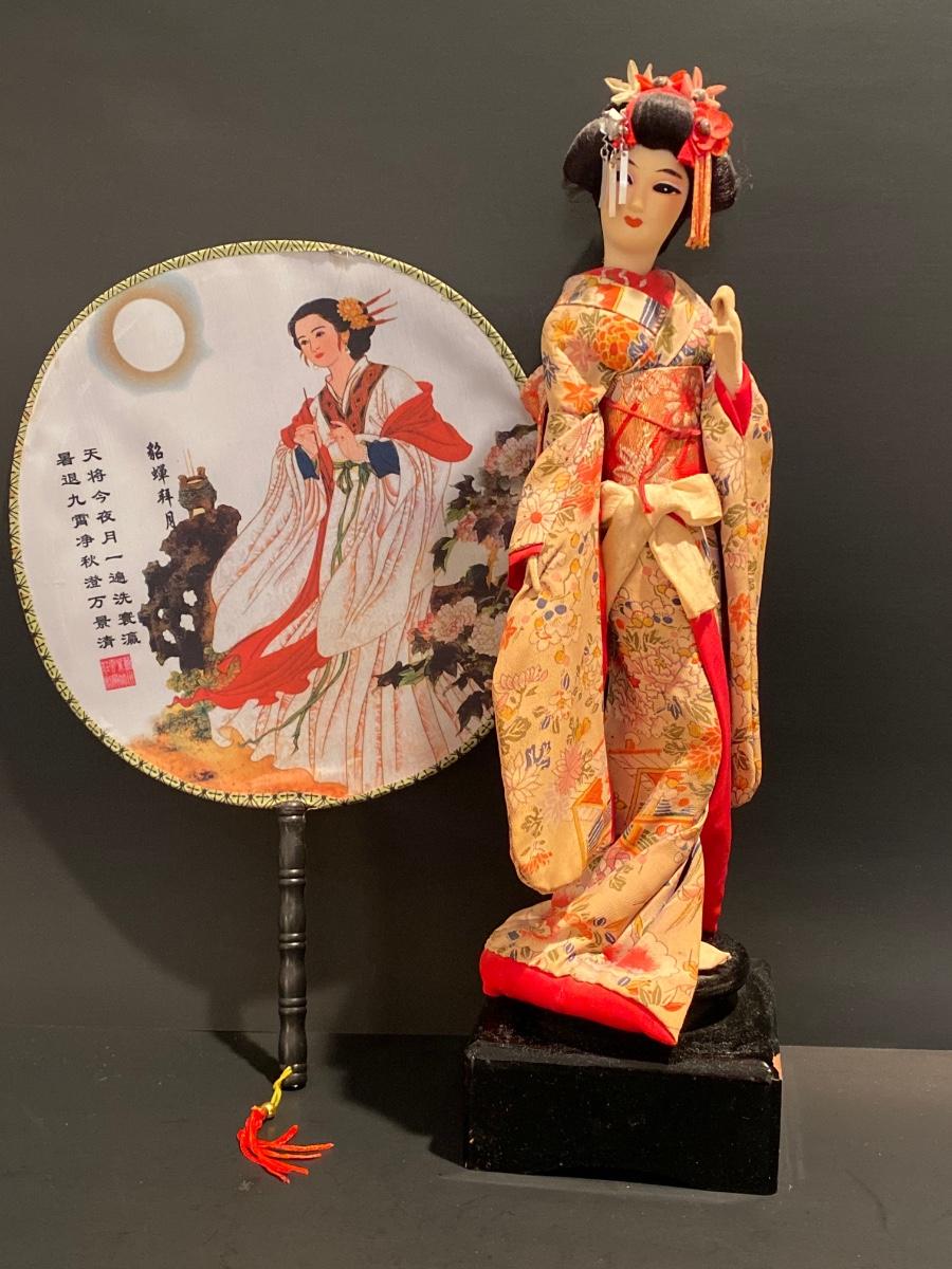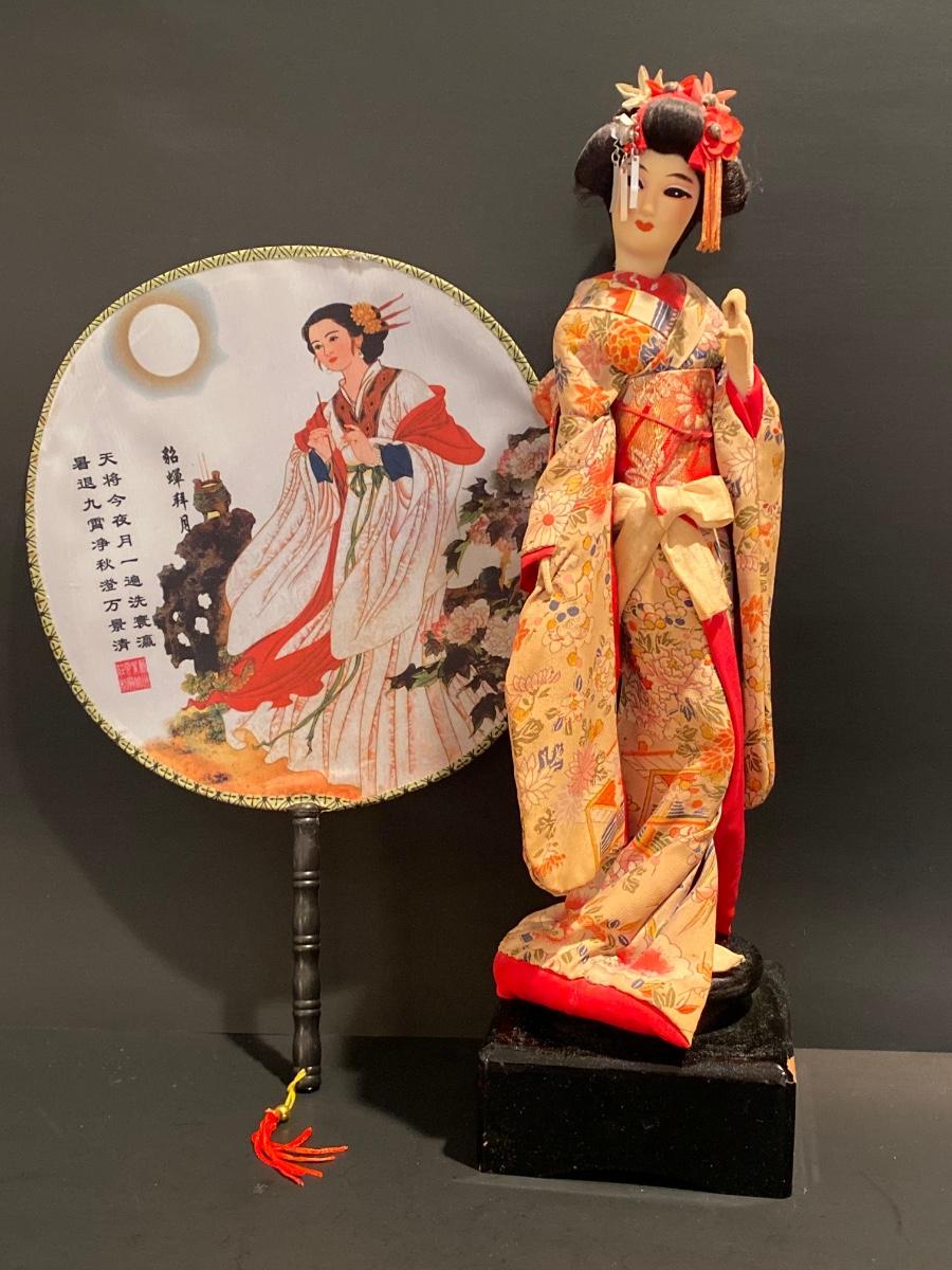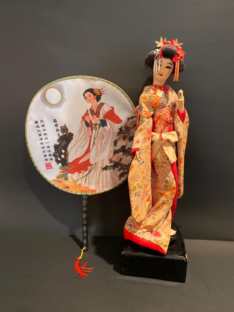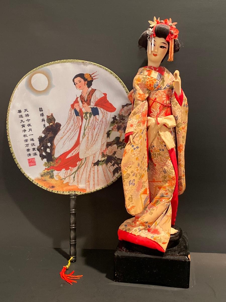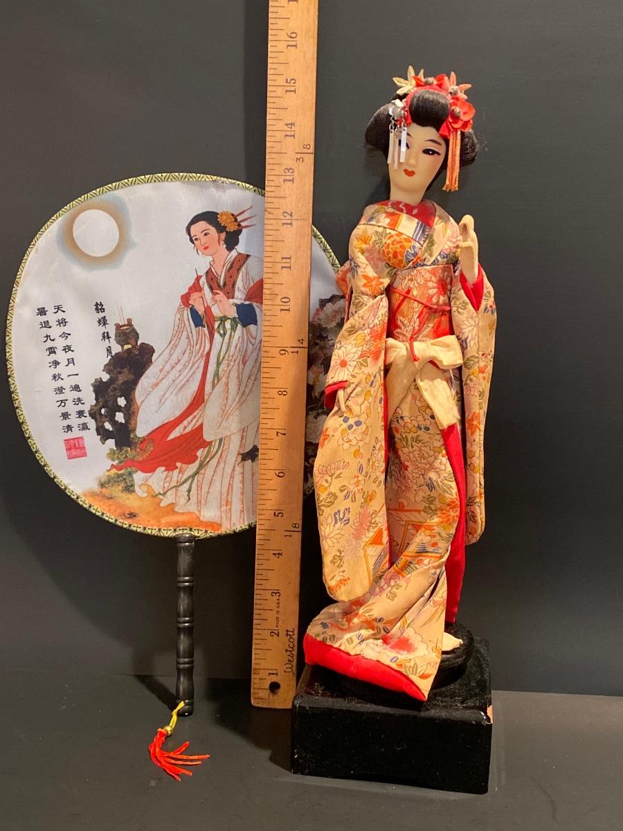 LOT Geisha Doll on Stand & Asian Themed Fan