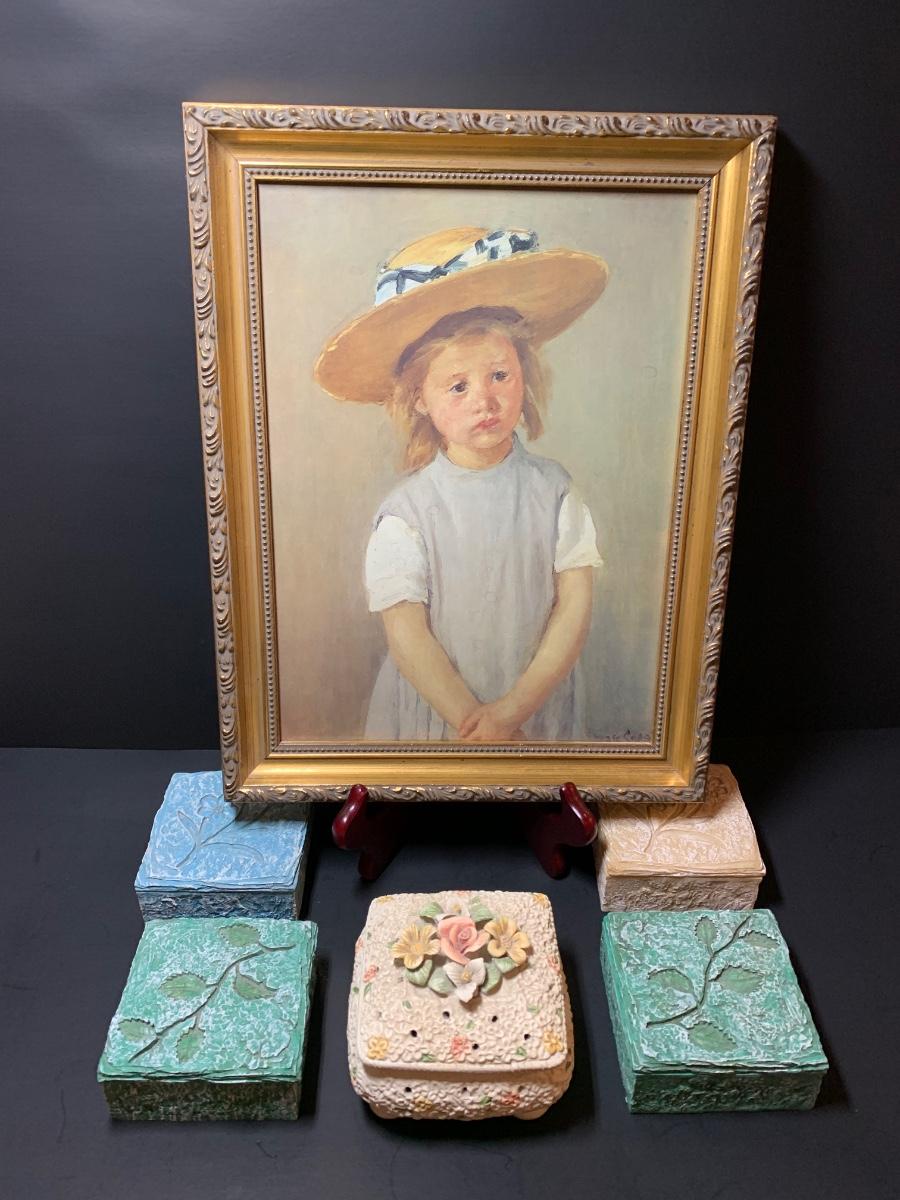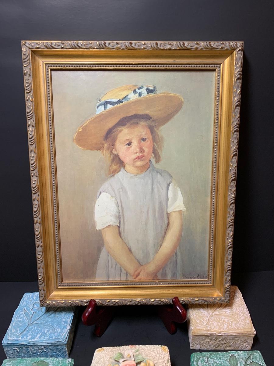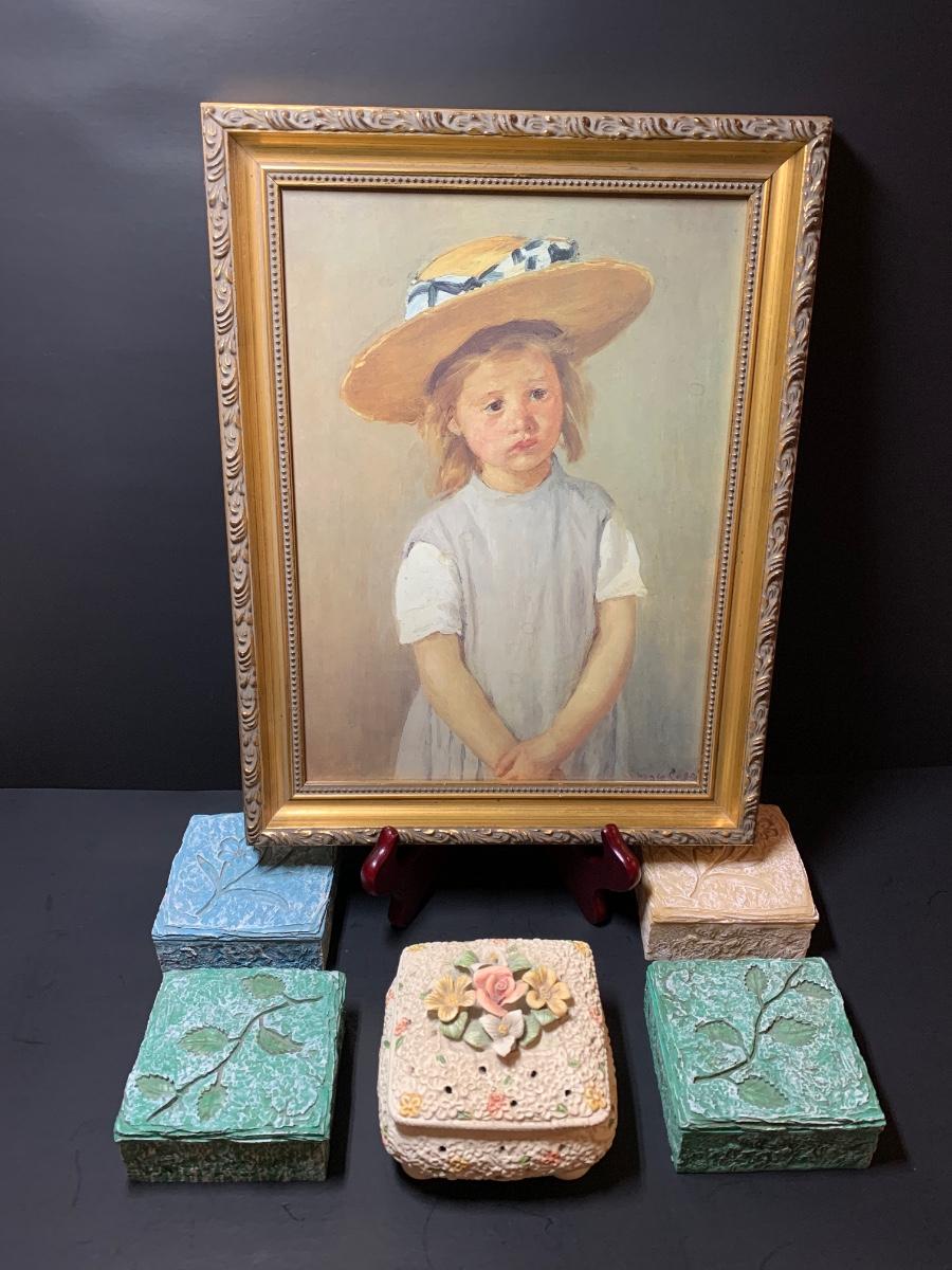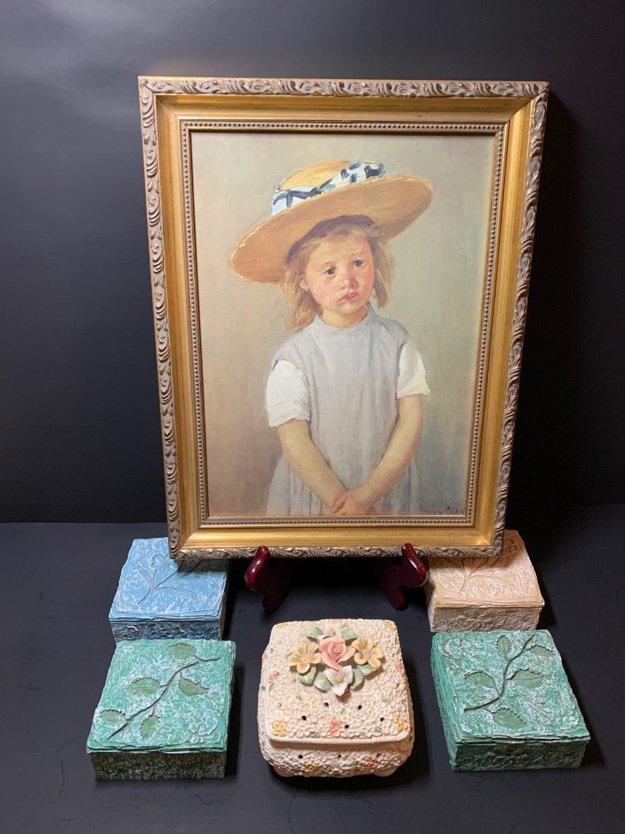 LOT 35R: Framed Numbered Print of Mary Cassatt's Child in a Straw Hat & Collection of Decorative Trinket Boxes
