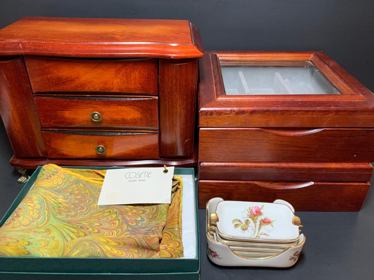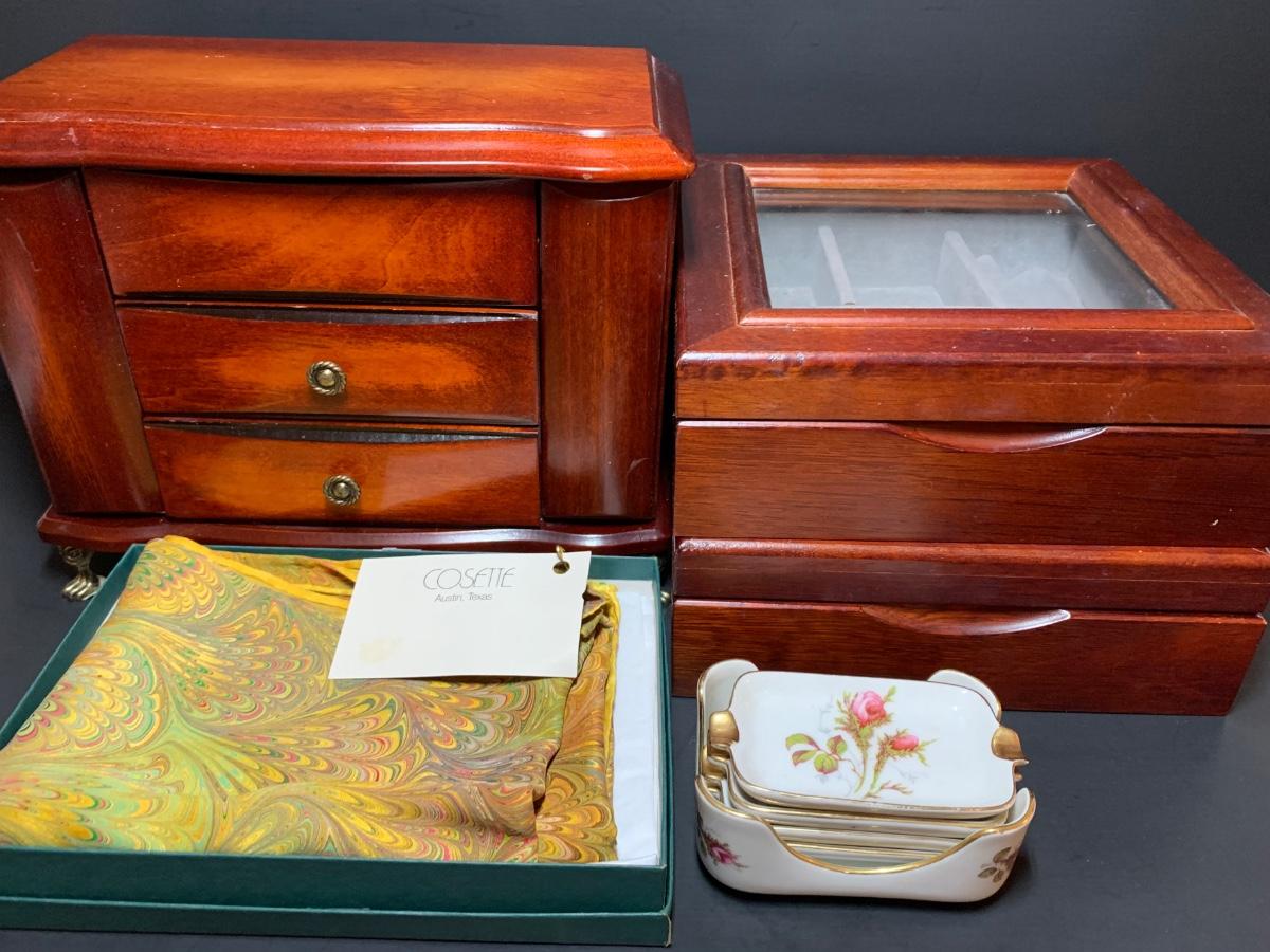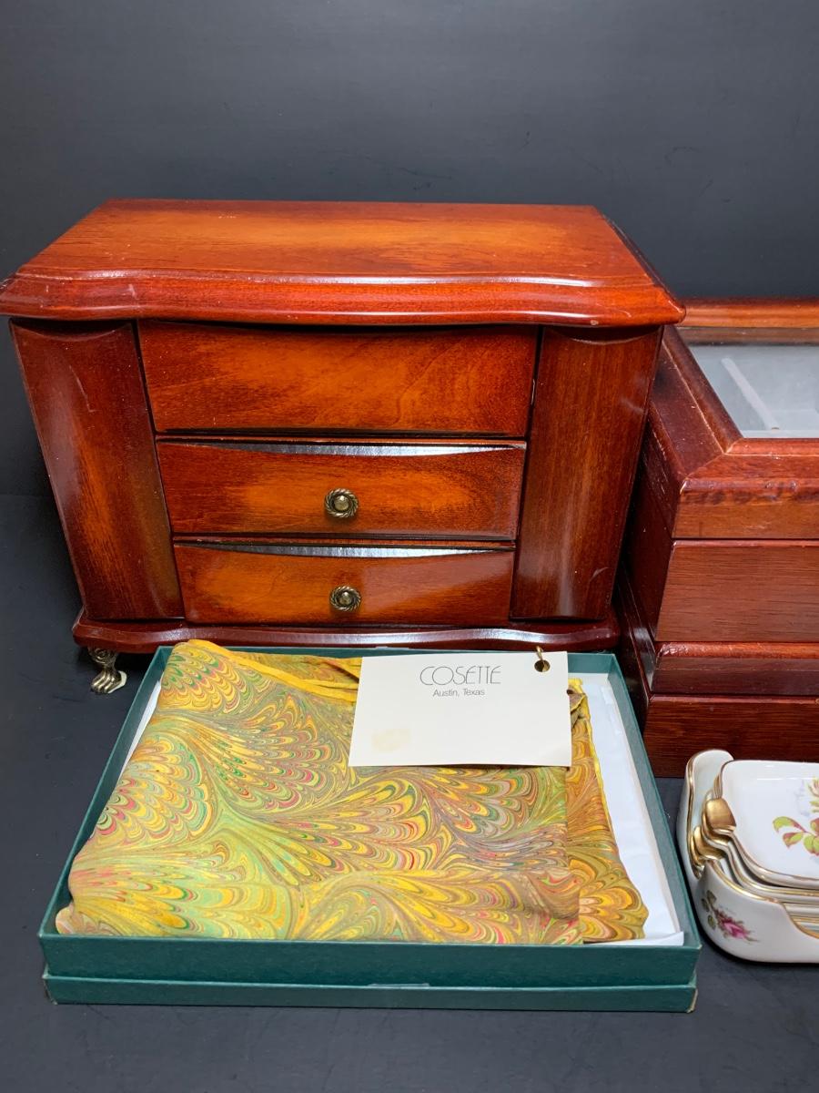 LOT 38R: Jewelry Boxes, Vintage Eschenbach Ashtray Set & Cosette of Austin Texas Scarf