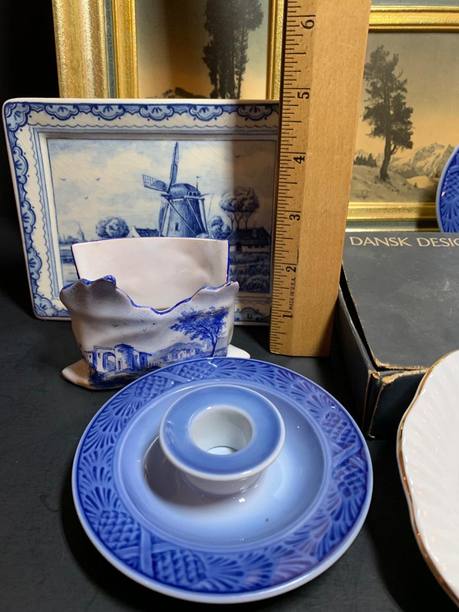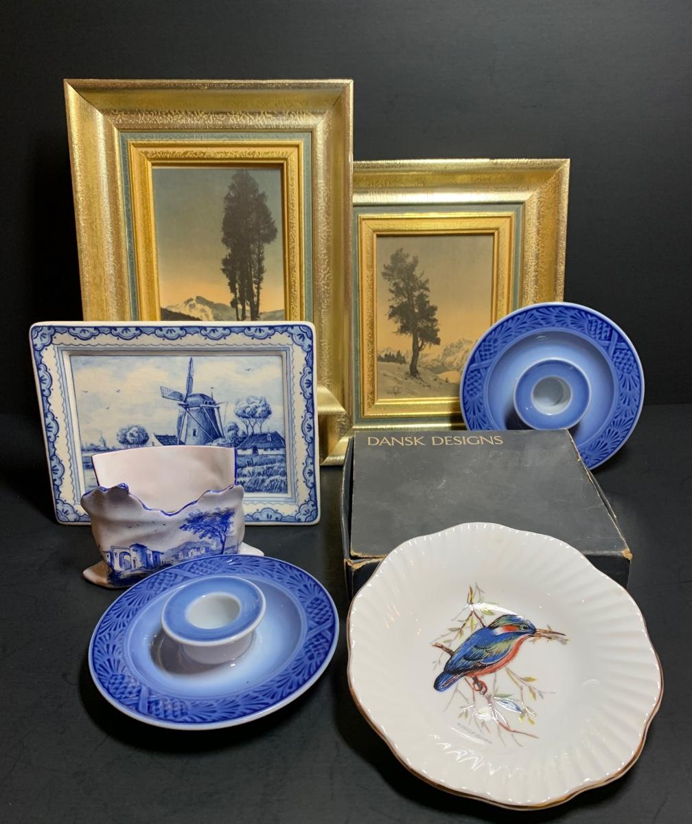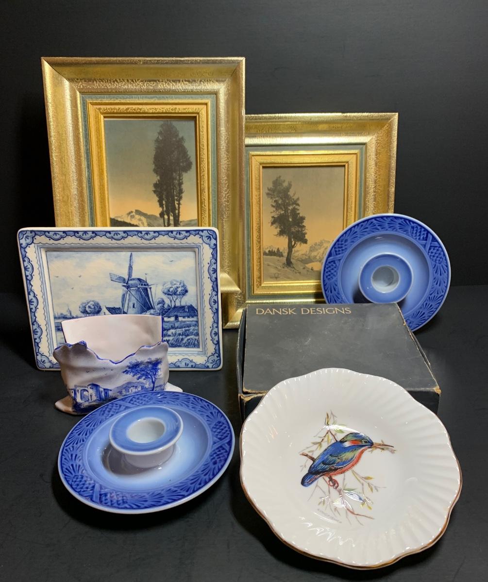 LOT 39: Delft Hanging Trivet, Royal Copenhagen Candle Holders, Dansk Candle Holder Vintage Art Prints & More