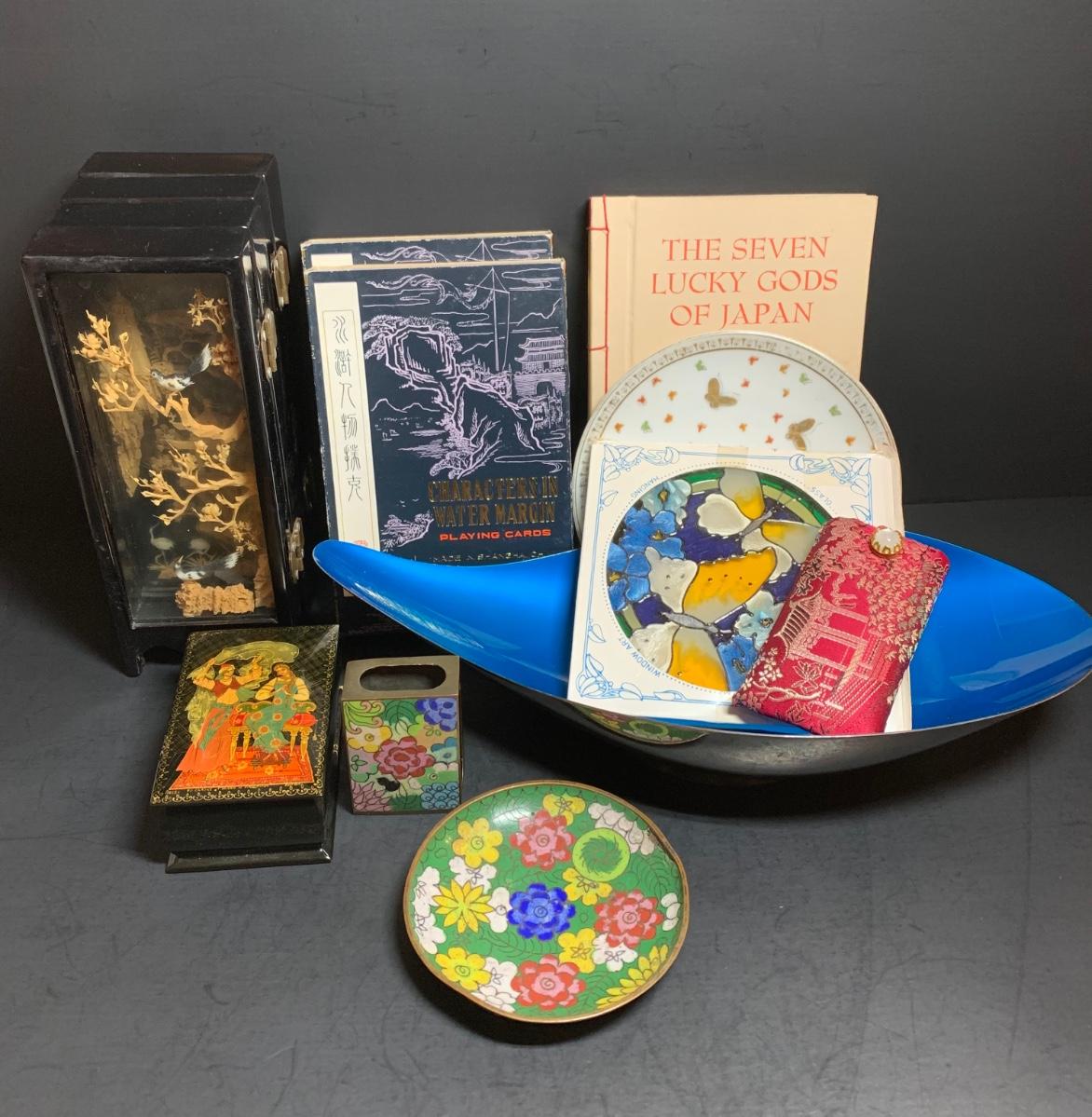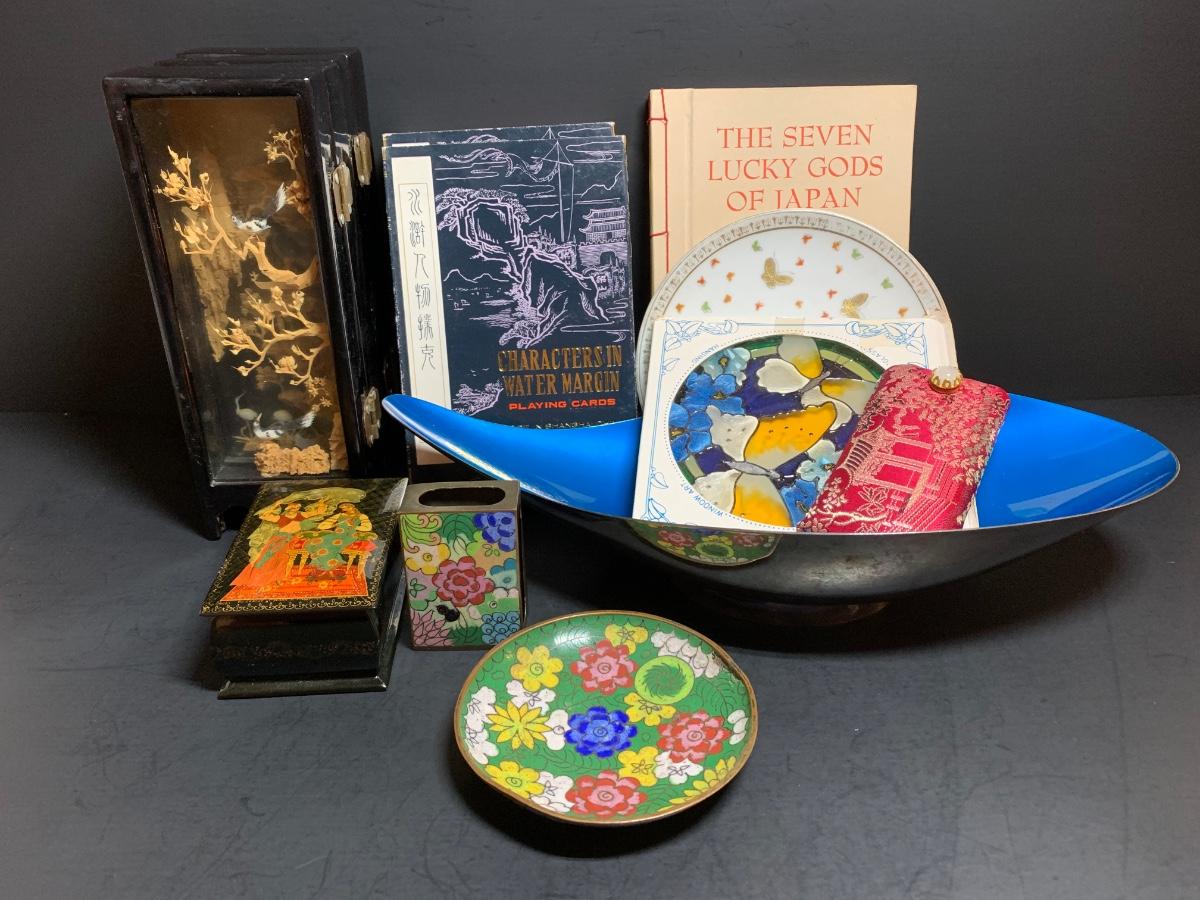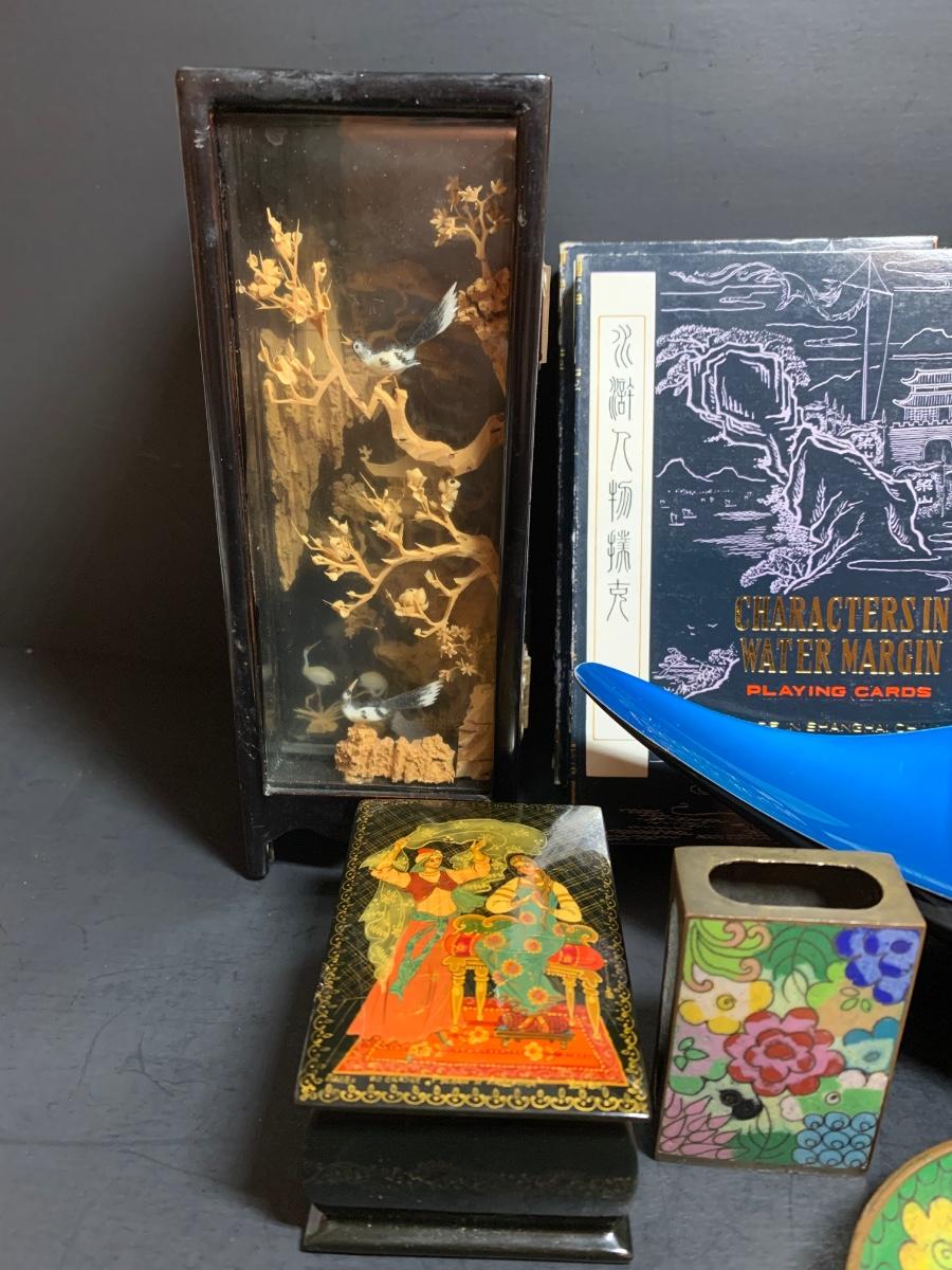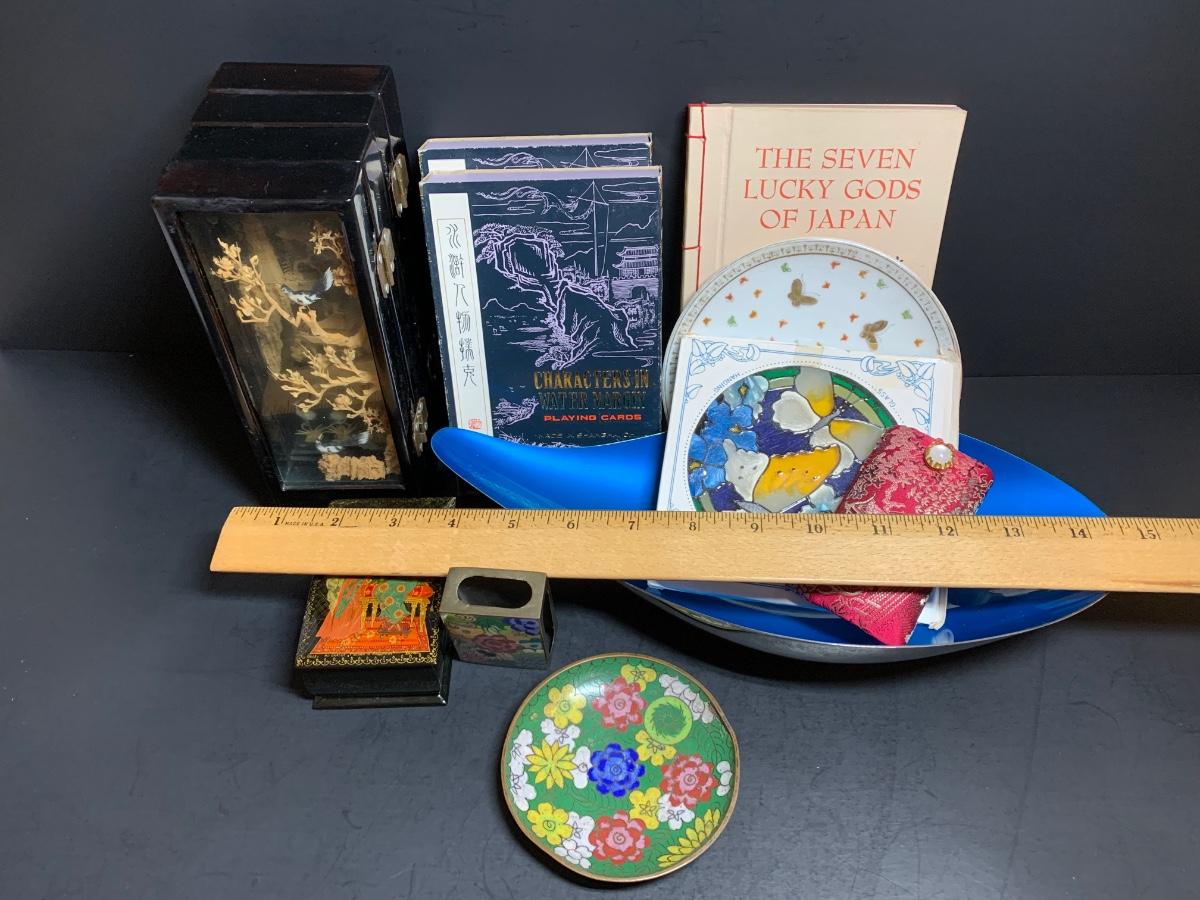 LOT 46R: Asian Themed Decor: Playing Cards, Enamel Overlay, Trinket Box, Sewing Kit & More