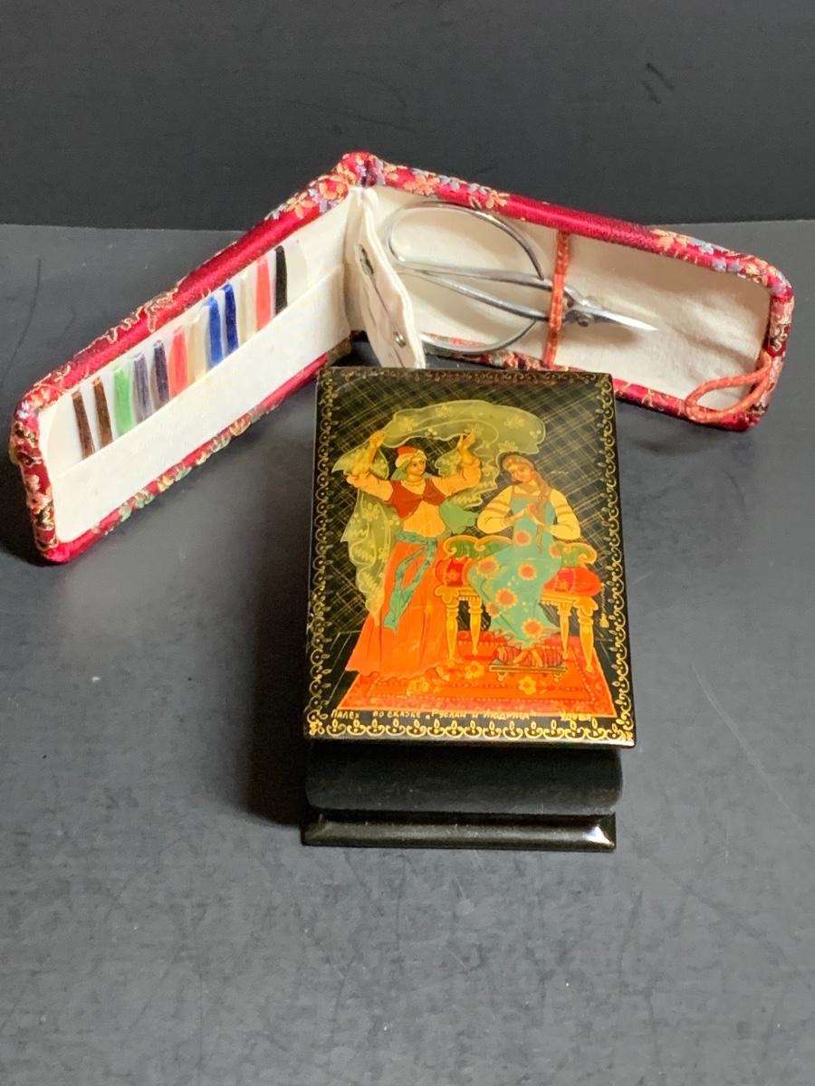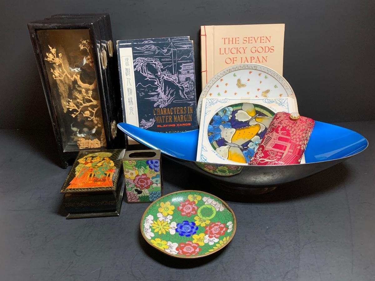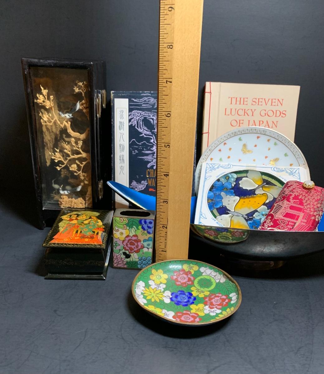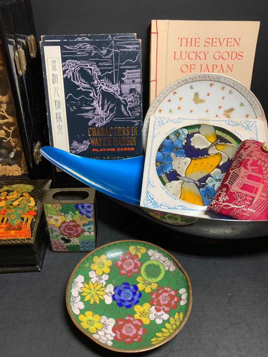 LOT 46R: Asian Themed Decor: Playing Cards, Enamel Overlay, Trinket Box, Sewing Kit & More