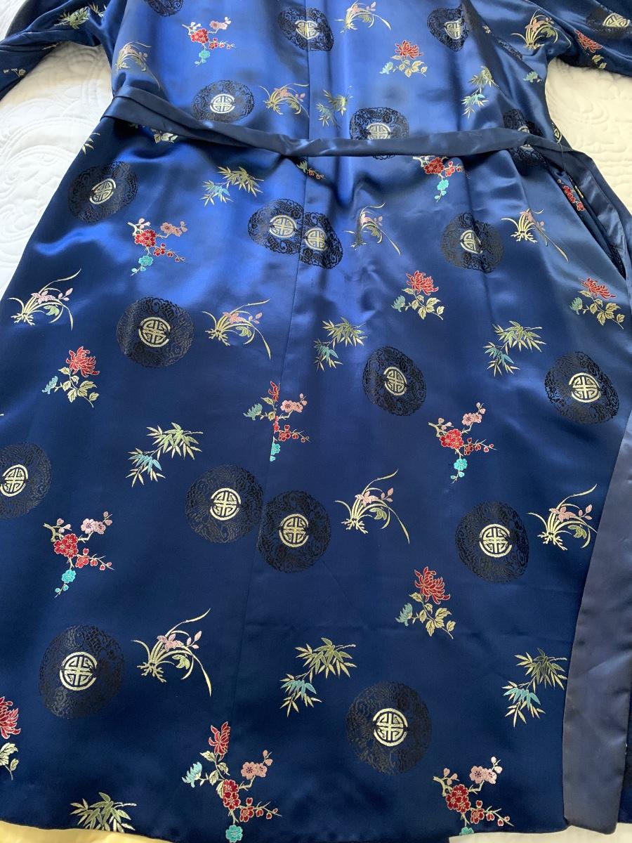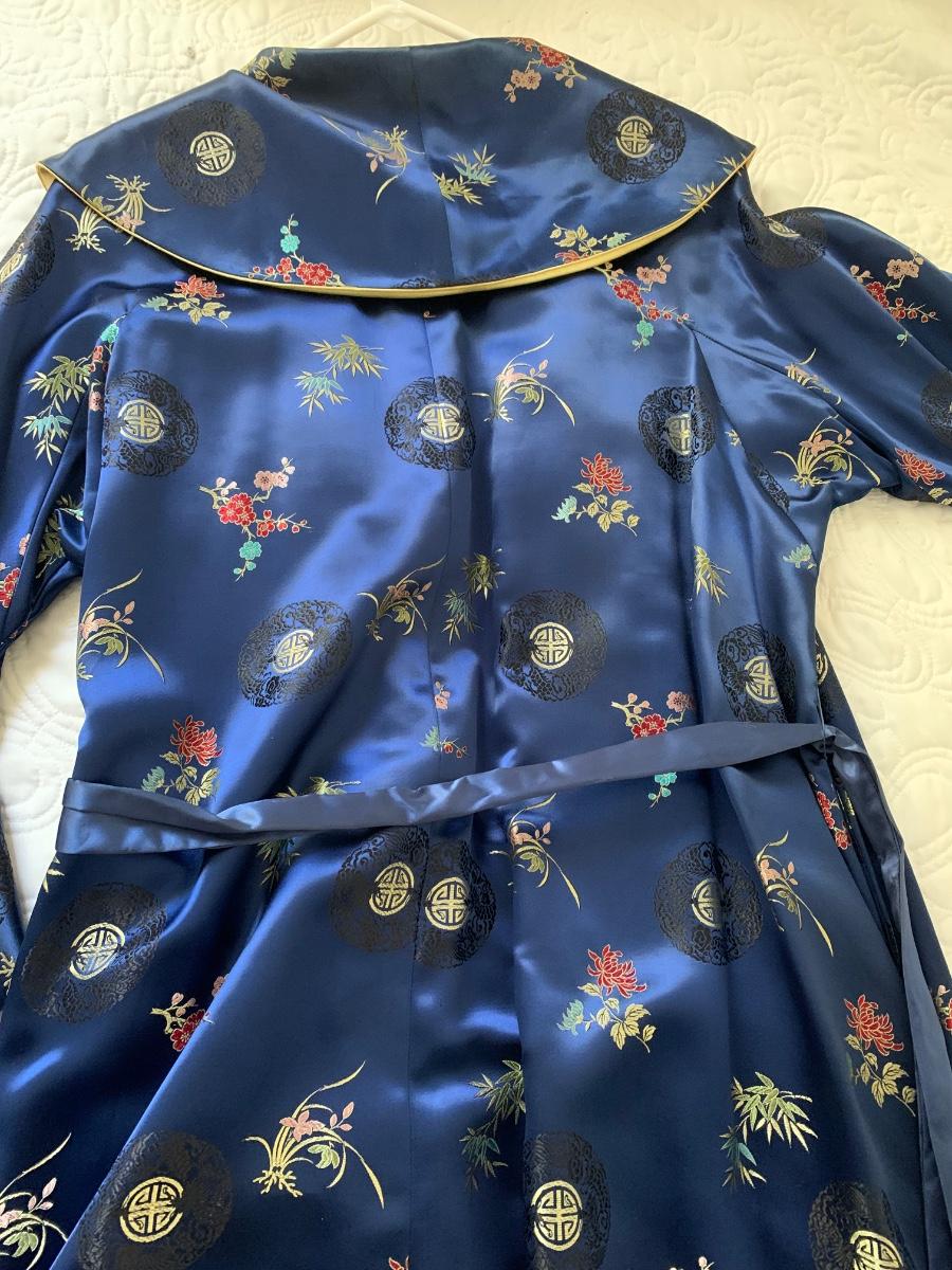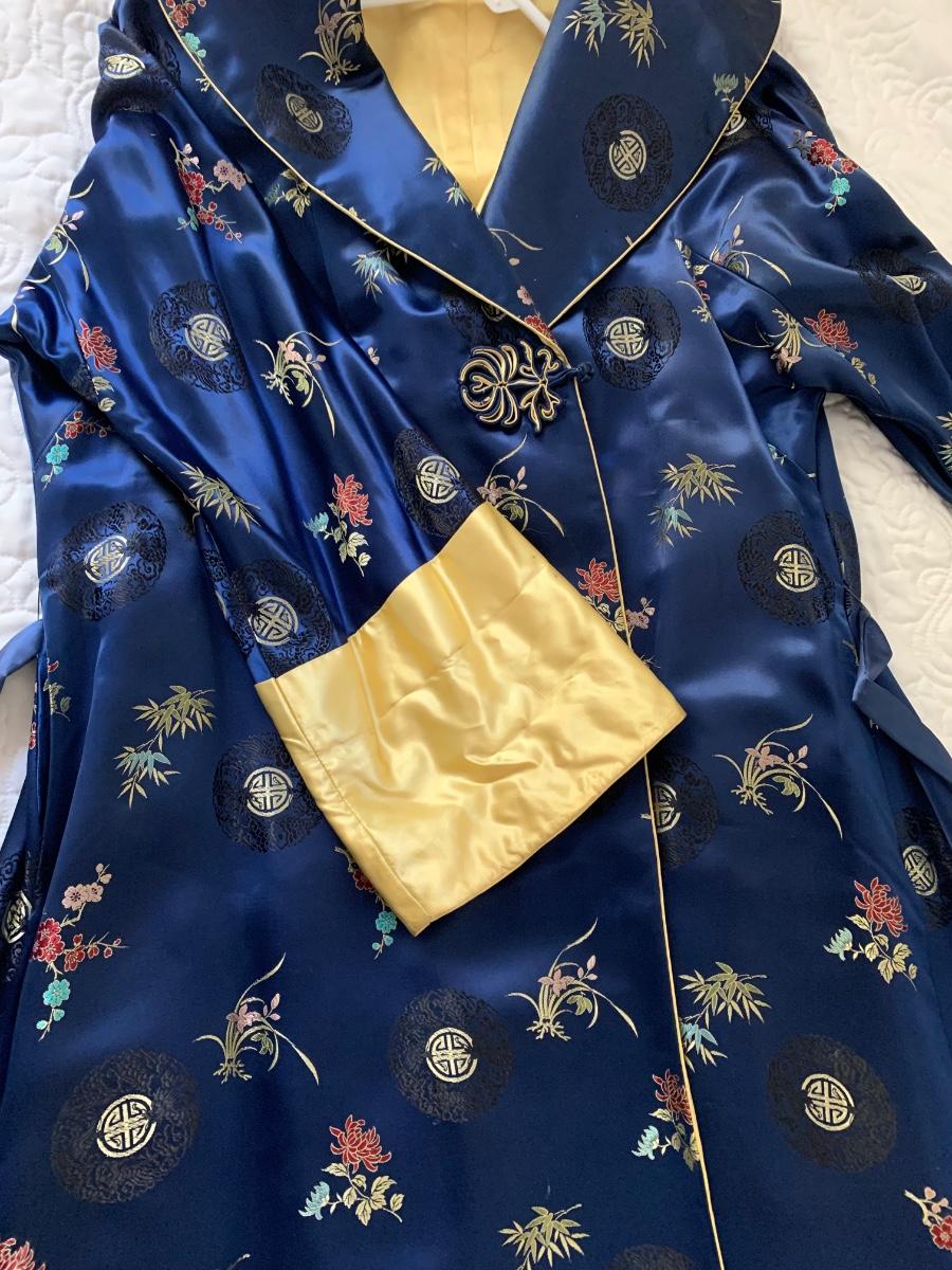 This is a very beautiful robe. It is satin, vibrant blue & gold. There are pockets on the inside - it may be reversible It is on the heavier side and possibly a medium -large. I was not able to find any label or tag,