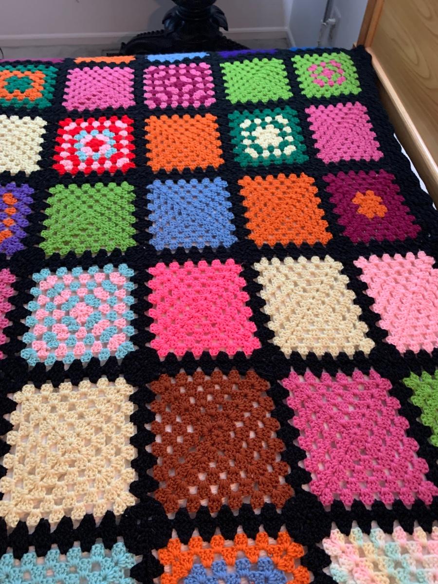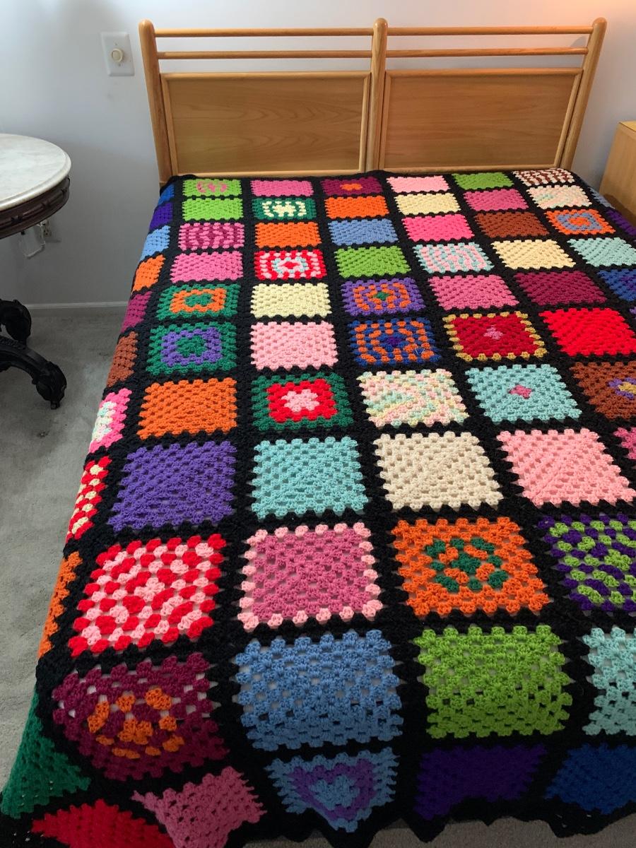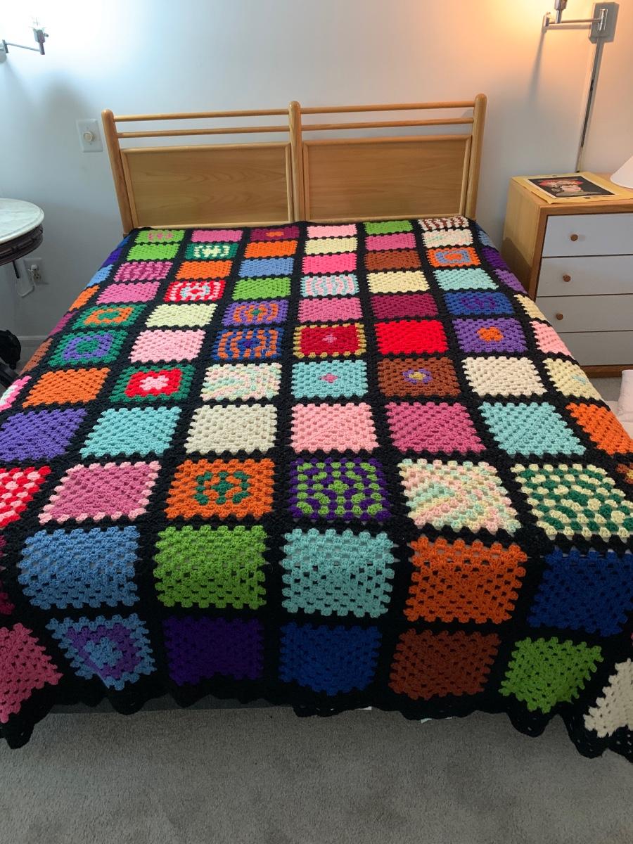 Pictures are taken on a queen size bed. This is a soft, snuggly handmade afghan.
